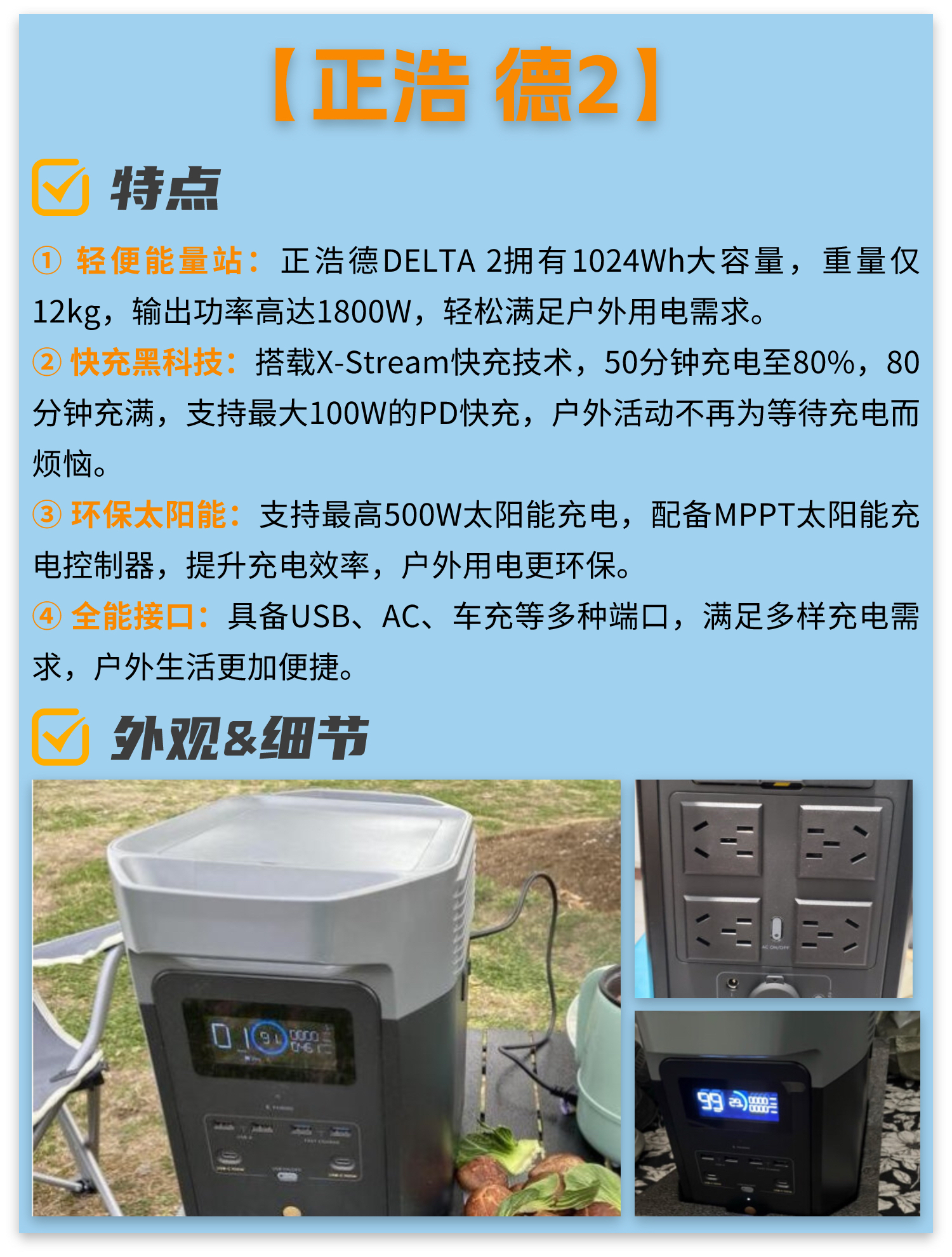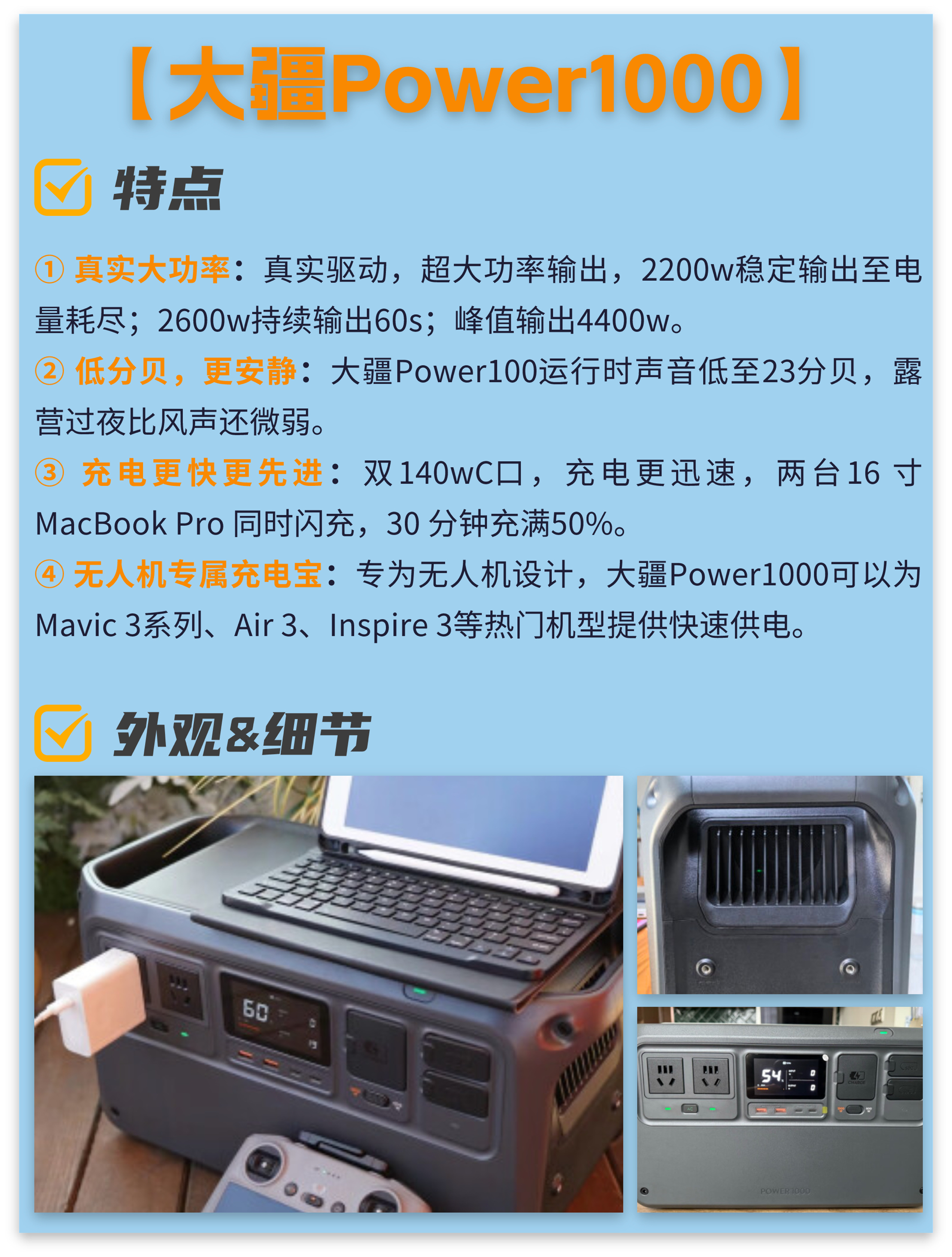 大家好,我是爱数码的J同学,户外电源作为近年来越来越受欢迎的装备,主要用于户外旅行、露营、徒步等活动,为电子设备提供电力支持。今天给大家带来户外电源选购指南,方便大家快速选择适合自己的产品。 【大疆Power1000】 ① 真实大功率:真实驱动,超大功率输出,2200w稳定输出至电量耗尽;2600w持续输出60s;峰值输出4400w。 ② 低分贝,更安静:大疆Power100运行时声音低至23分...