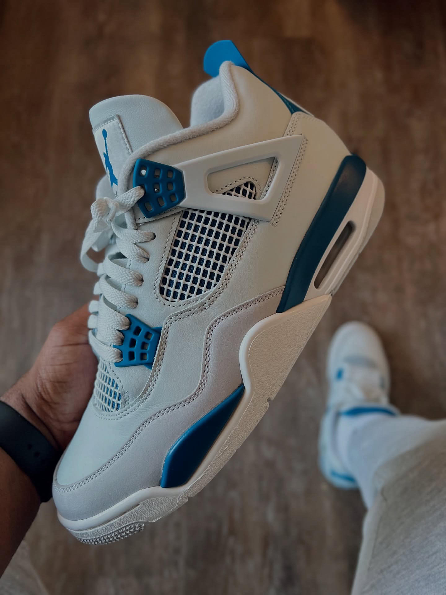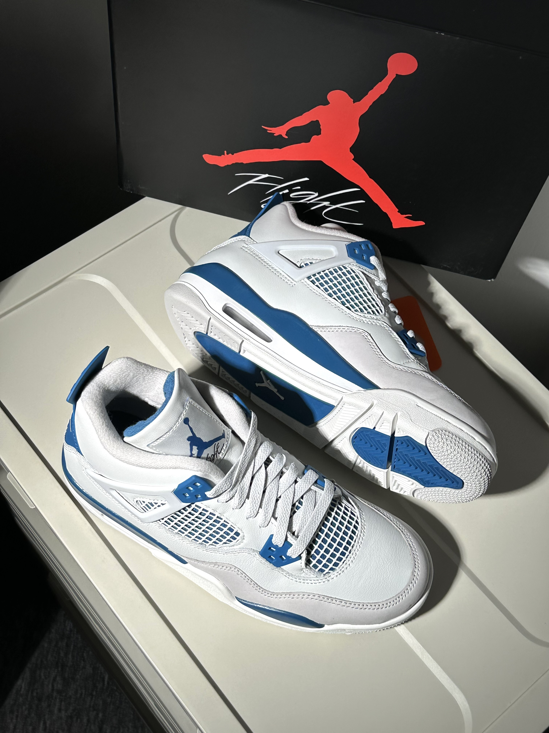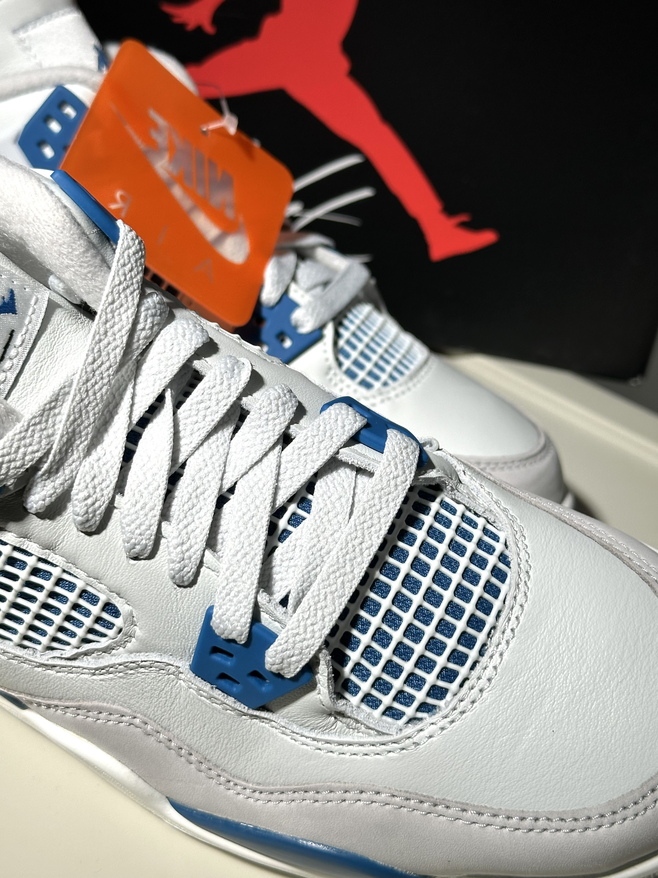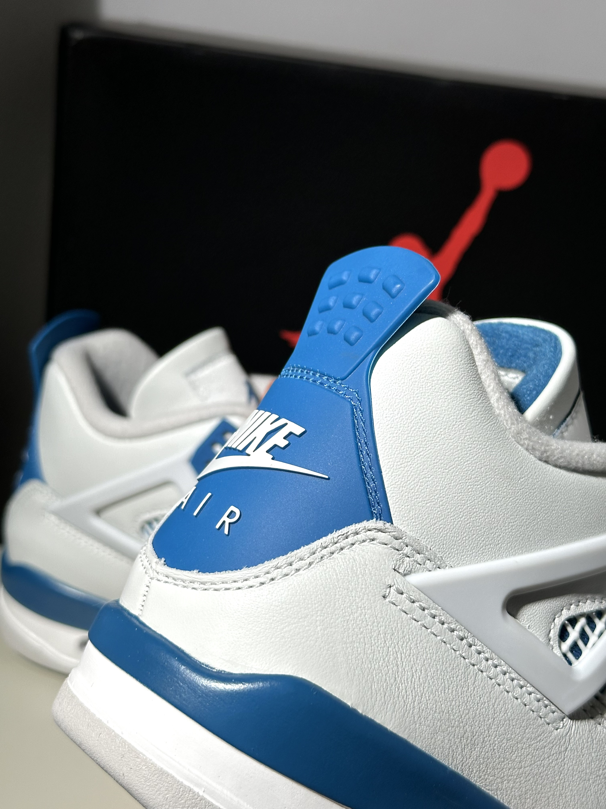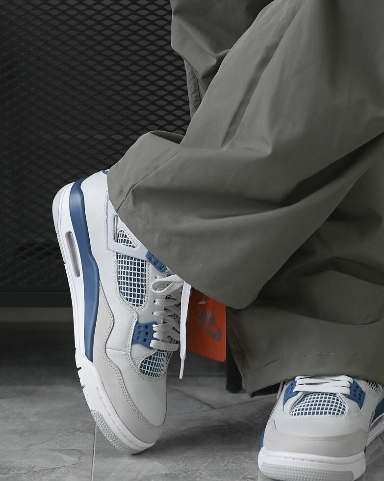 很清爽的白蓝配色AJ4 从刚听到发售消息就很期待! 到现在拿到实物果然没让人失望 鞋面白色部分其实都带灰调 不过并不影响颜值很清爽很好看🌊 除了夏天穿闷脚完全没毛病 是真没想到这次入手性价比还能这么高!