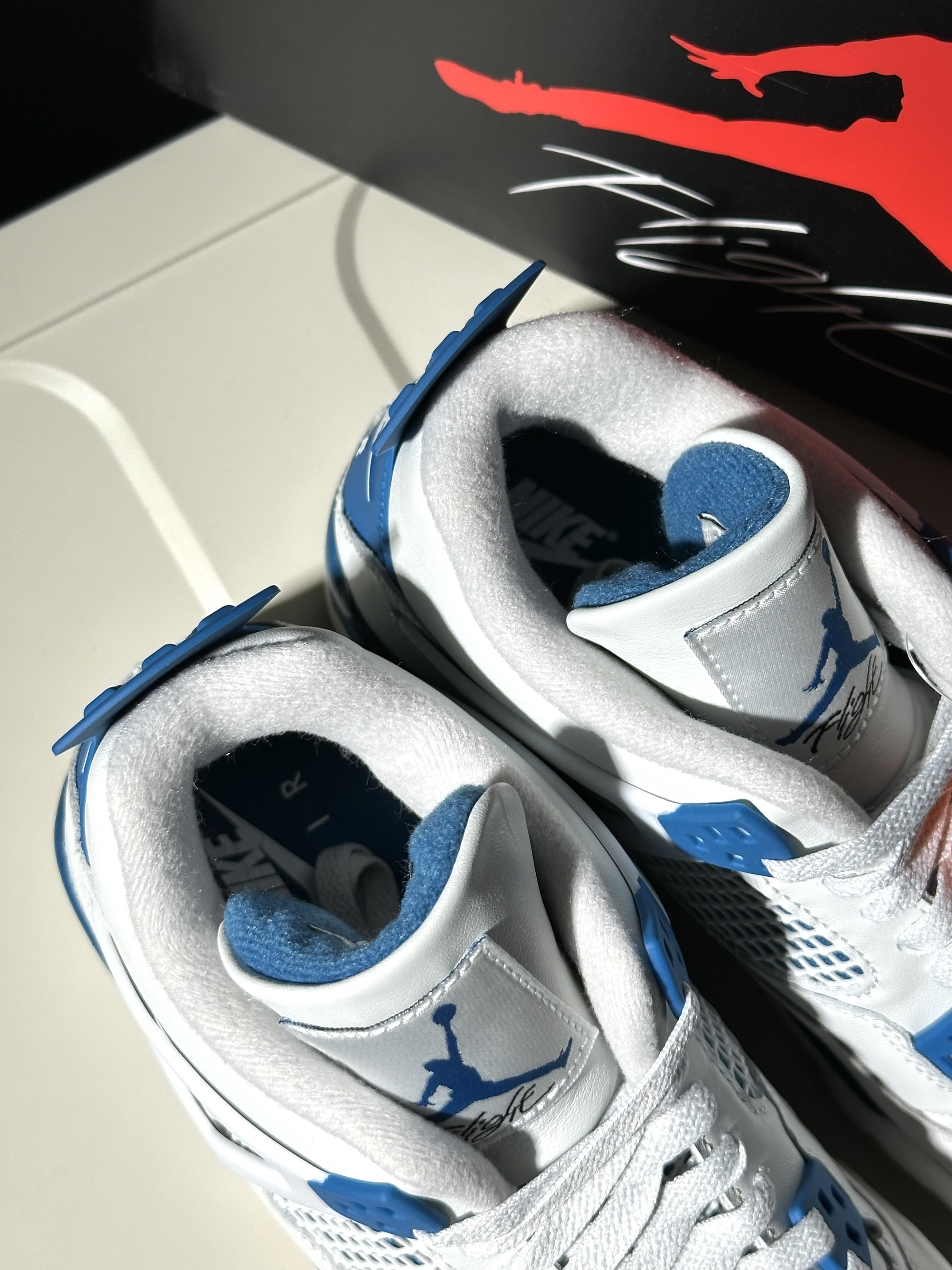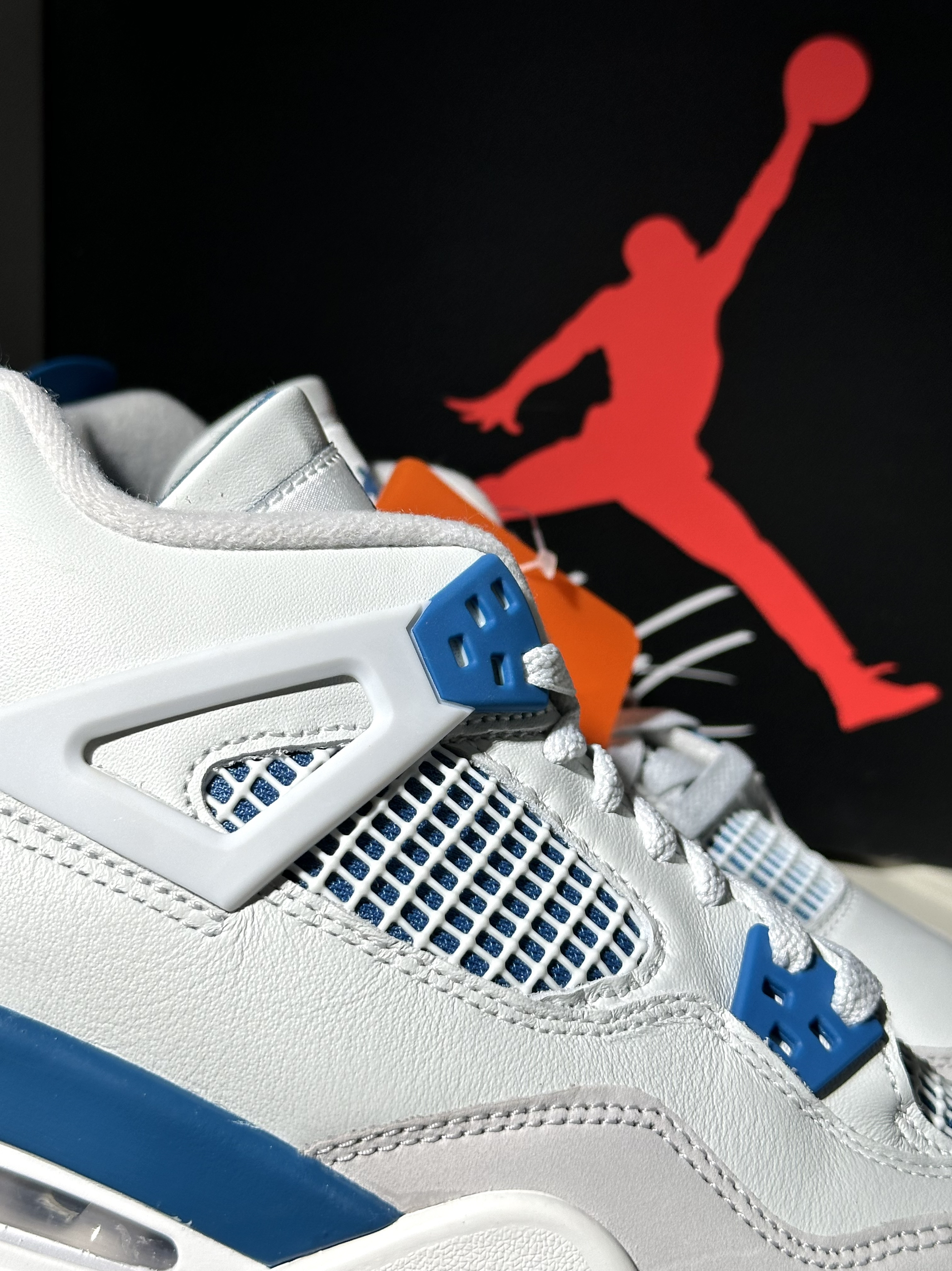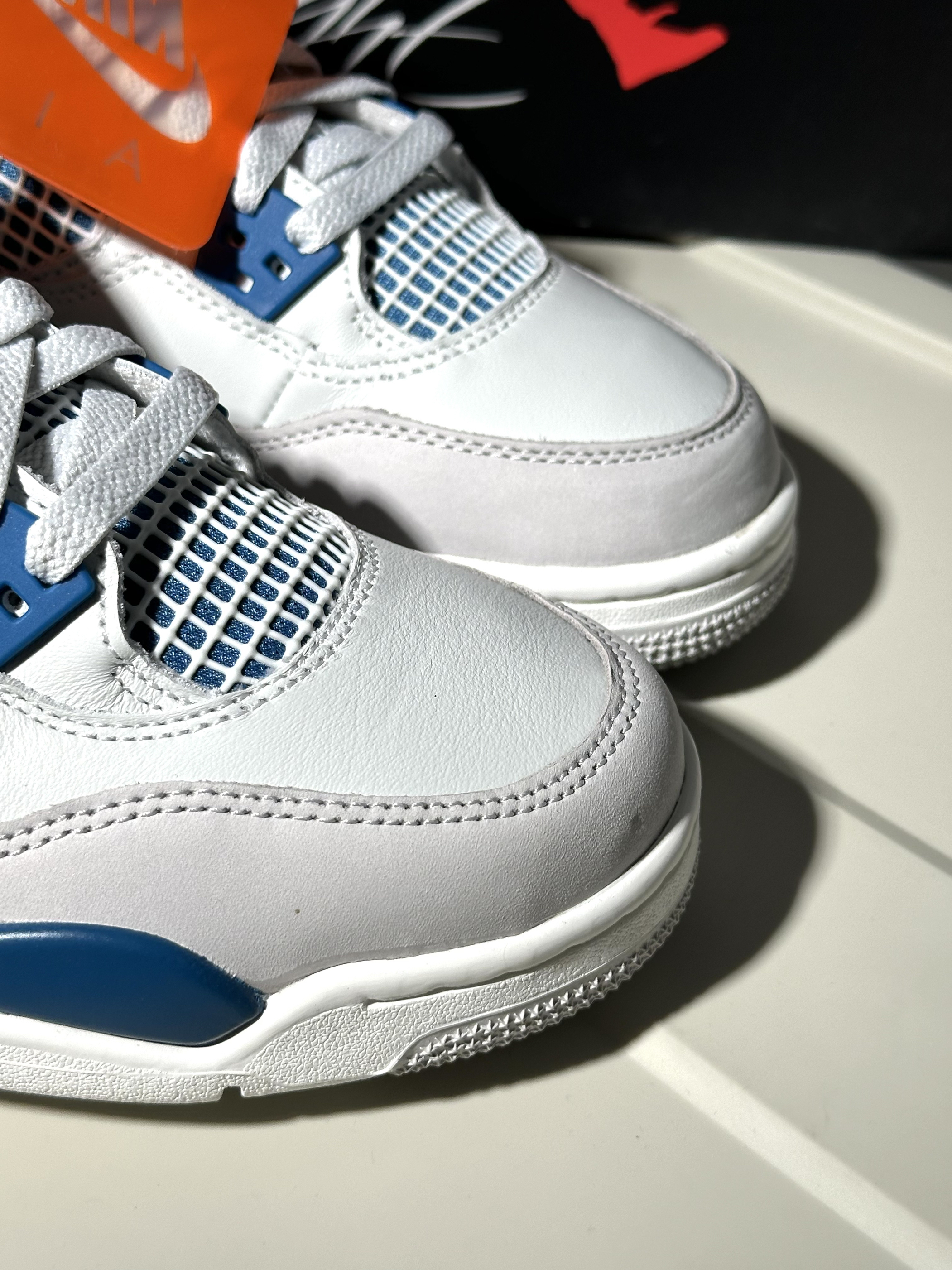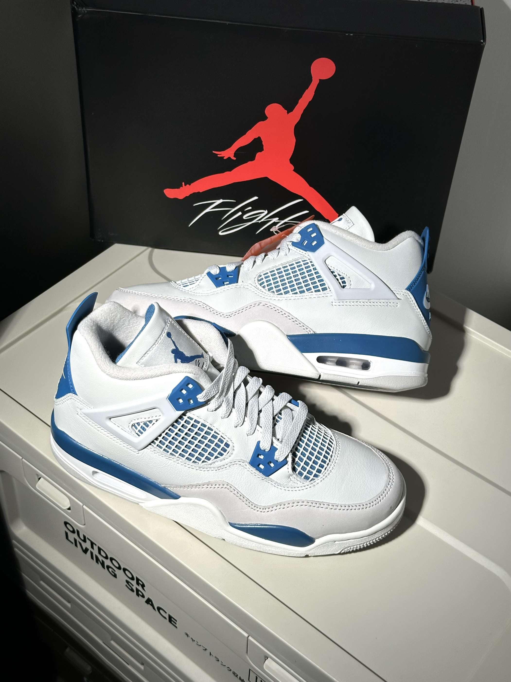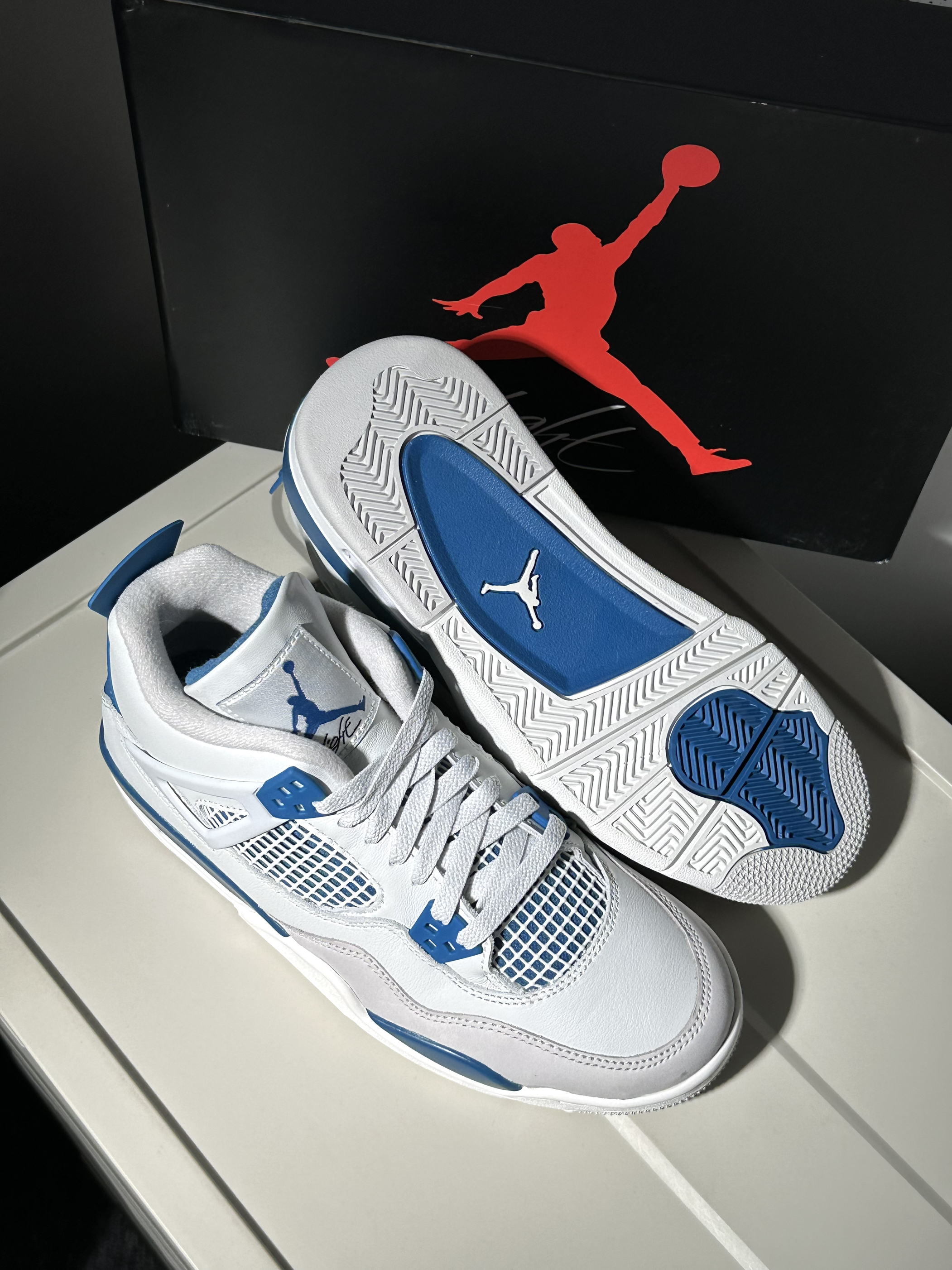 很清爽的白蓝配色AJ4 从刚听到发售消息就很期待! 到现在拿到实物果然没让人失望 鞋面白色部分其实都带灰调 不过并不影响颜值很清爽很好看🌊 除了夏天穿闷脚完全没毛病 是真没想到这次入手性价比还能这么高!