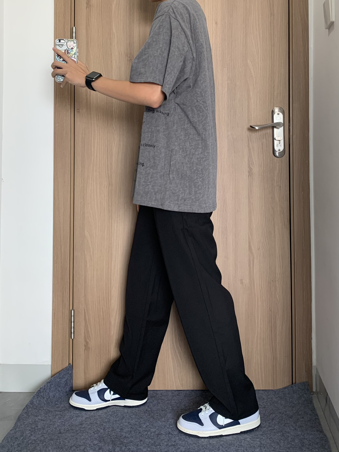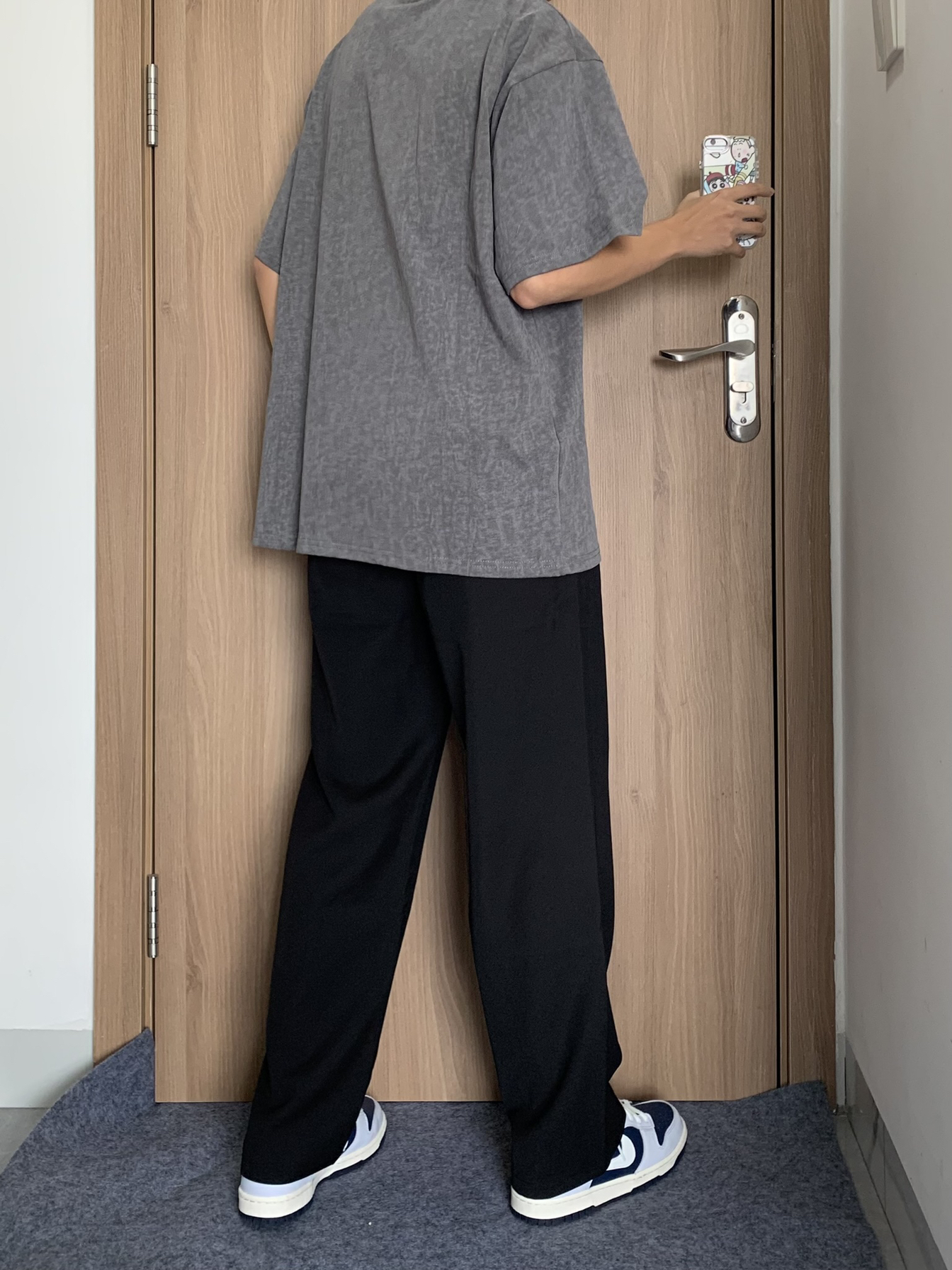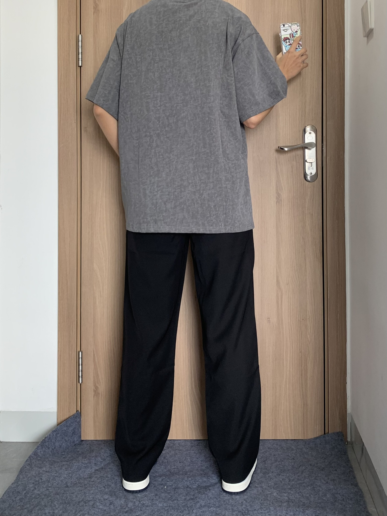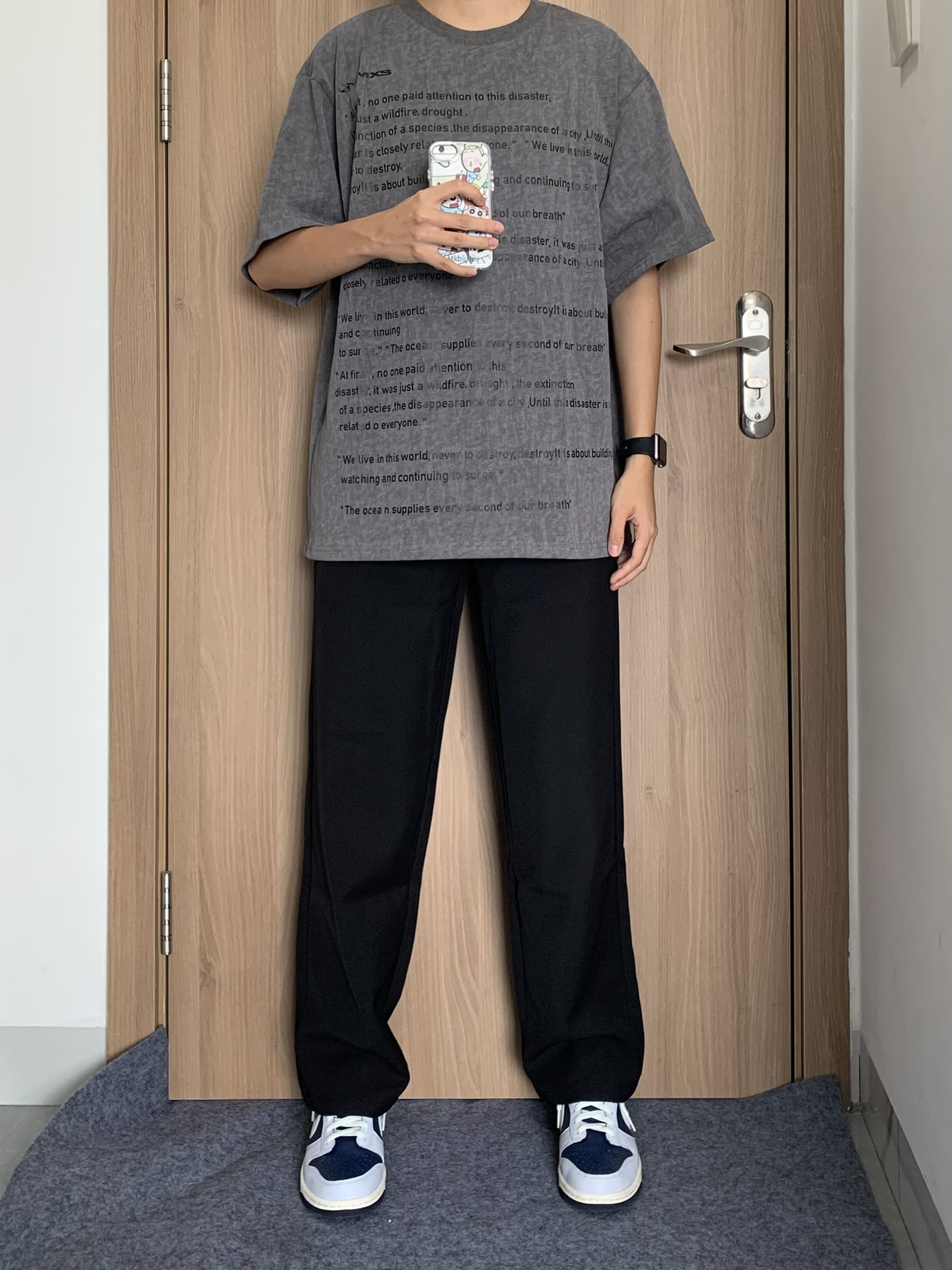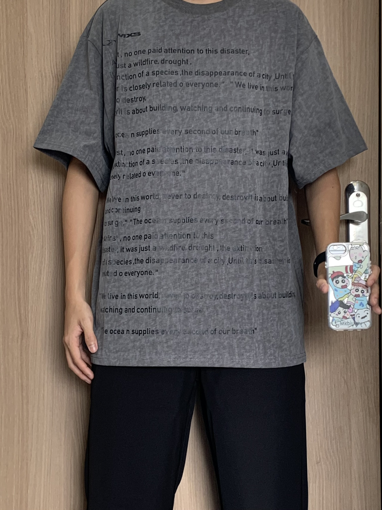 哈喽这里是林間秋风眠~今日份穿搭分享 今天上身的是 IMXS 的做旧肌理感美式短袖 👔170/110 上身一件深灰色字母T恤+黑色西裤+板鞋 衣服整体版型还是不错的,胸前字母logo设计,做旧深灰色质感看起来也不错,个人上身效果还是不错的,也比较好搭配,总体还是可以的
