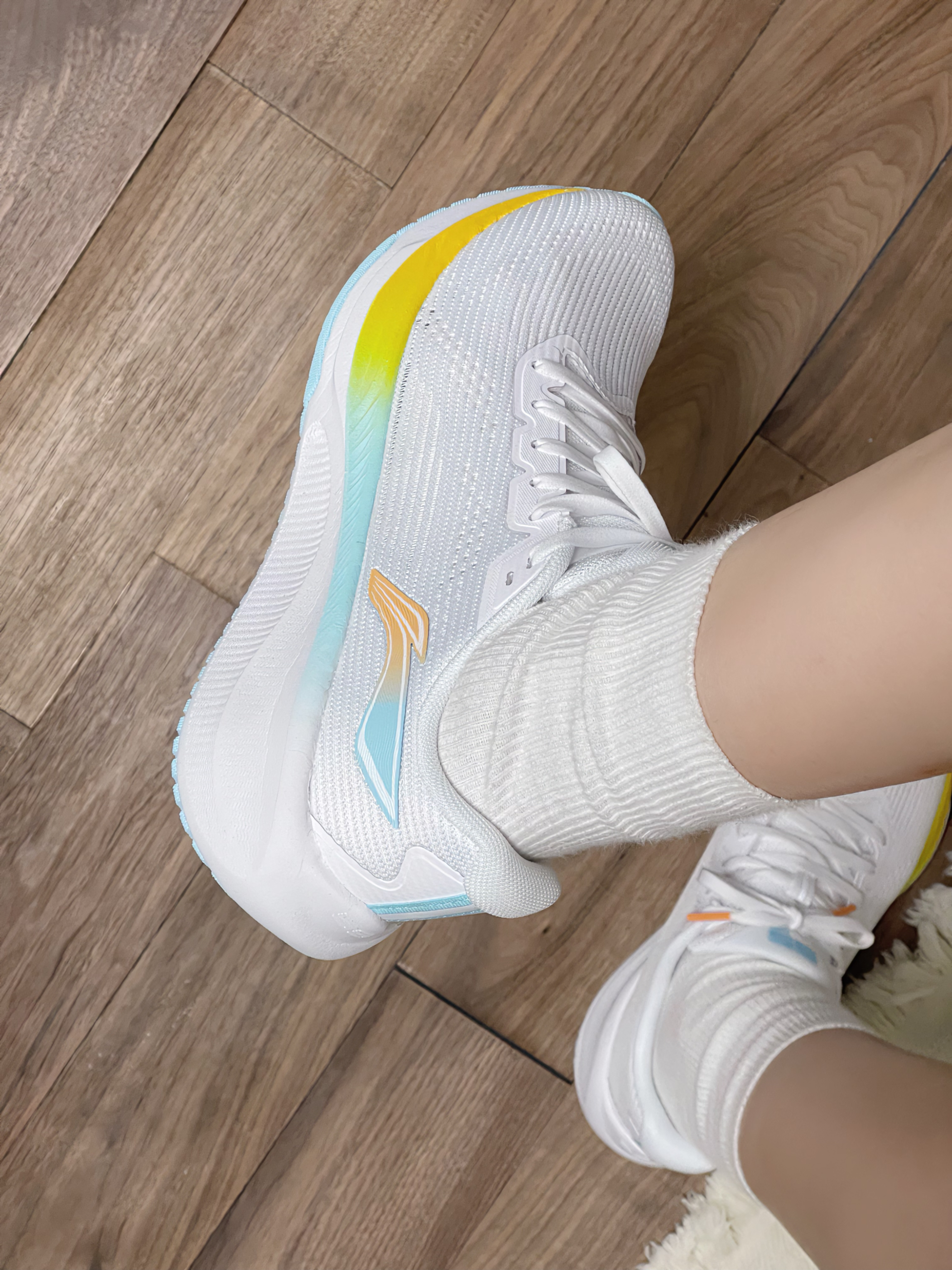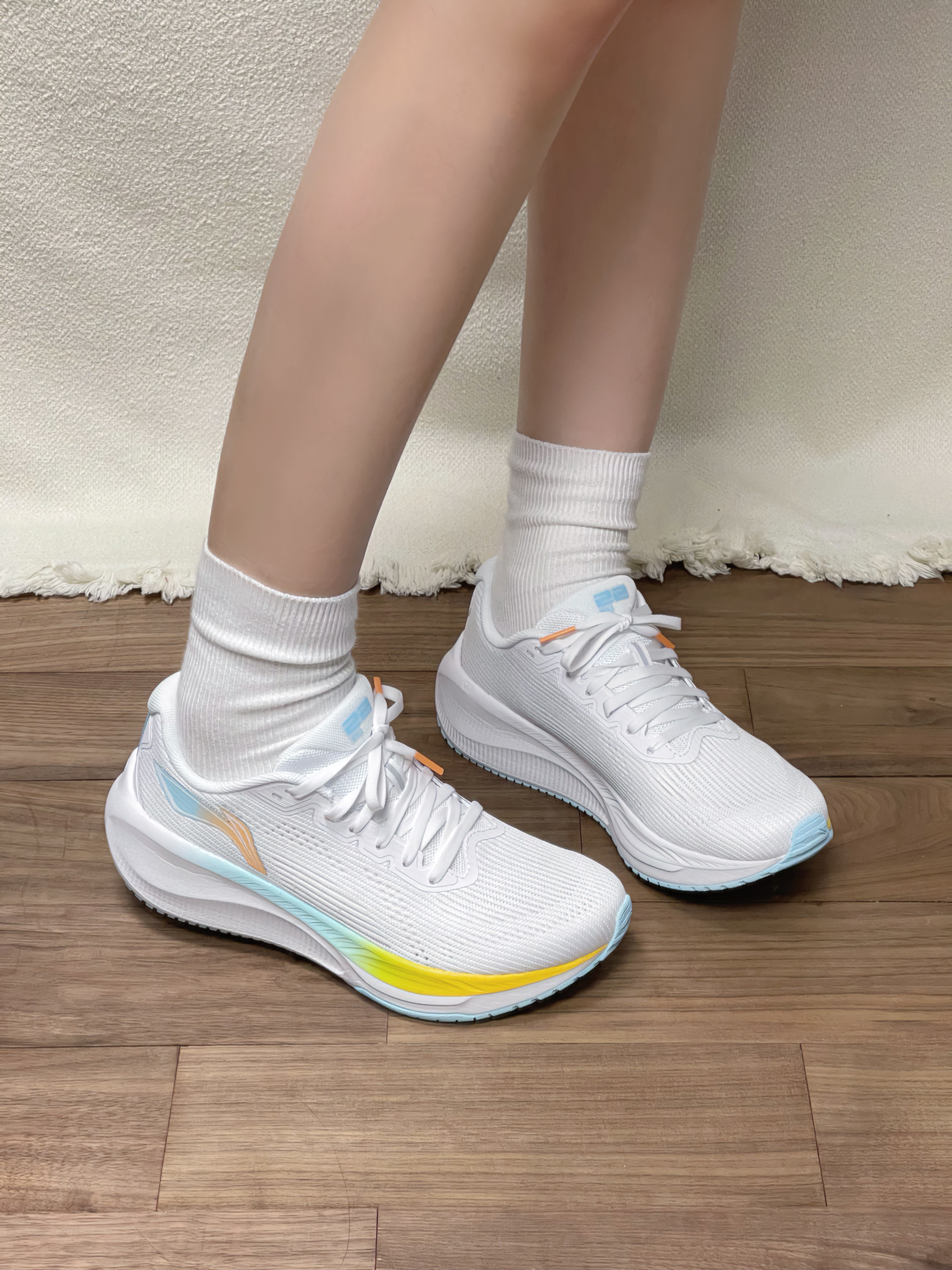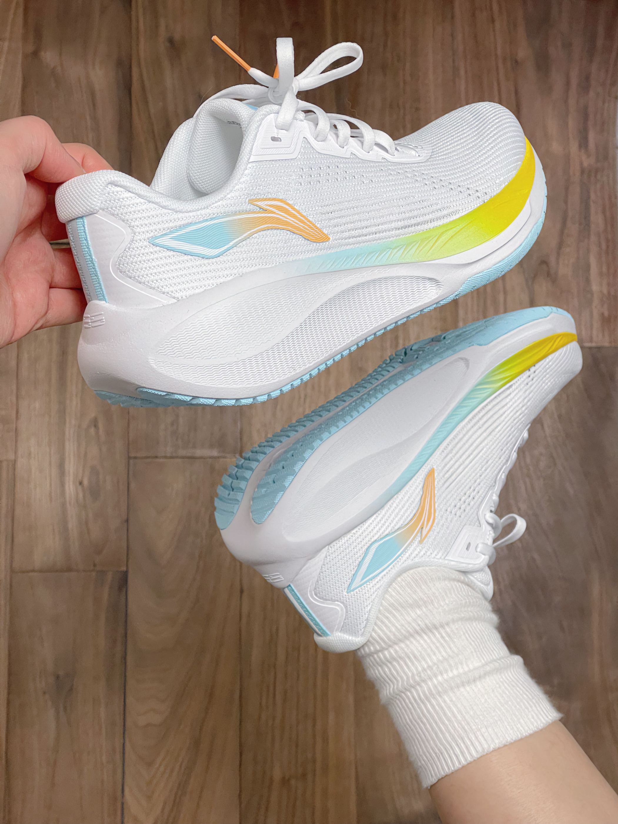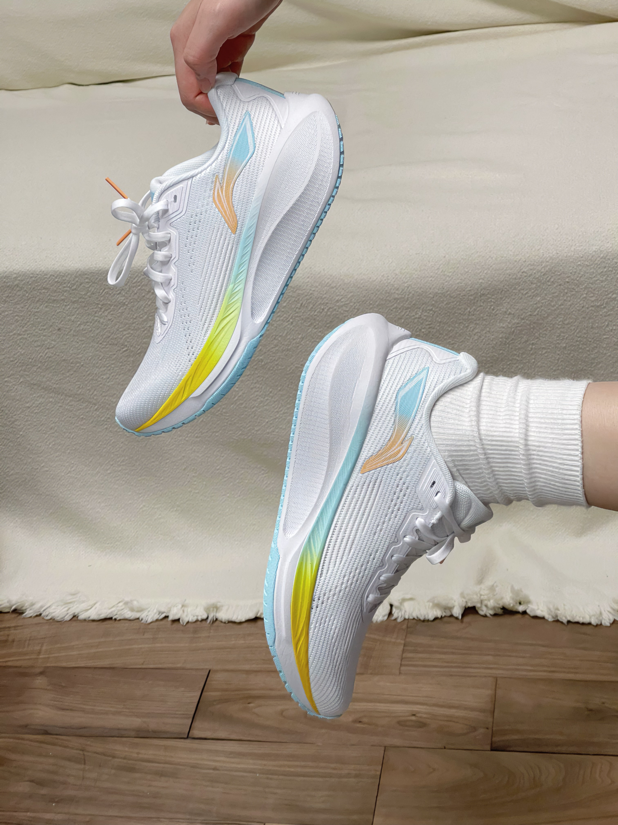 姐妹们!!!李宁吾适LITE 2.0这双跑鞋真的有点东西的!! 鞋底又轻盈又Q弹,回弹嘎嘎好~ 长时间跑步一点不累脚,减震也蛮好滴! 它的橡胶鞋底敲耐磨!防滑度也都很🉑️ 鞋面是轻薄网面的,这点我很喜欢! 运动出汗也不会闷jiojio 颜值也是尊嘟很高! 奶fufu的米白色➕蓝黄的撞色还蛮吸晴的! 运动跑步or日常搭配穿都ok!