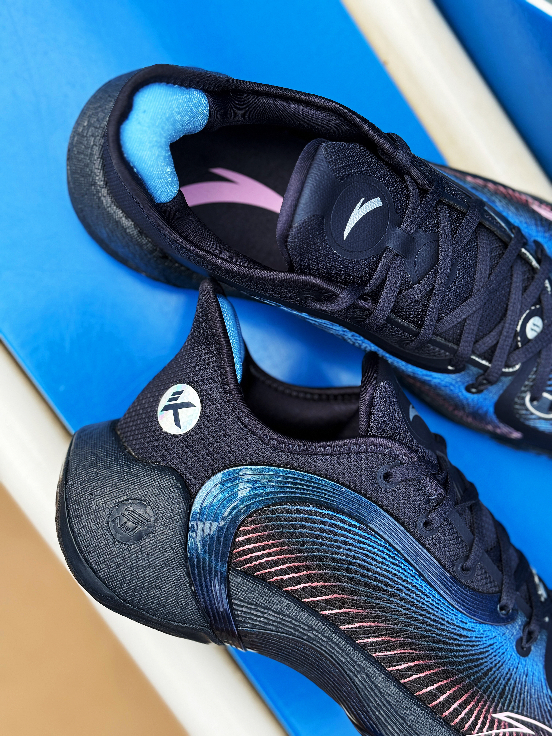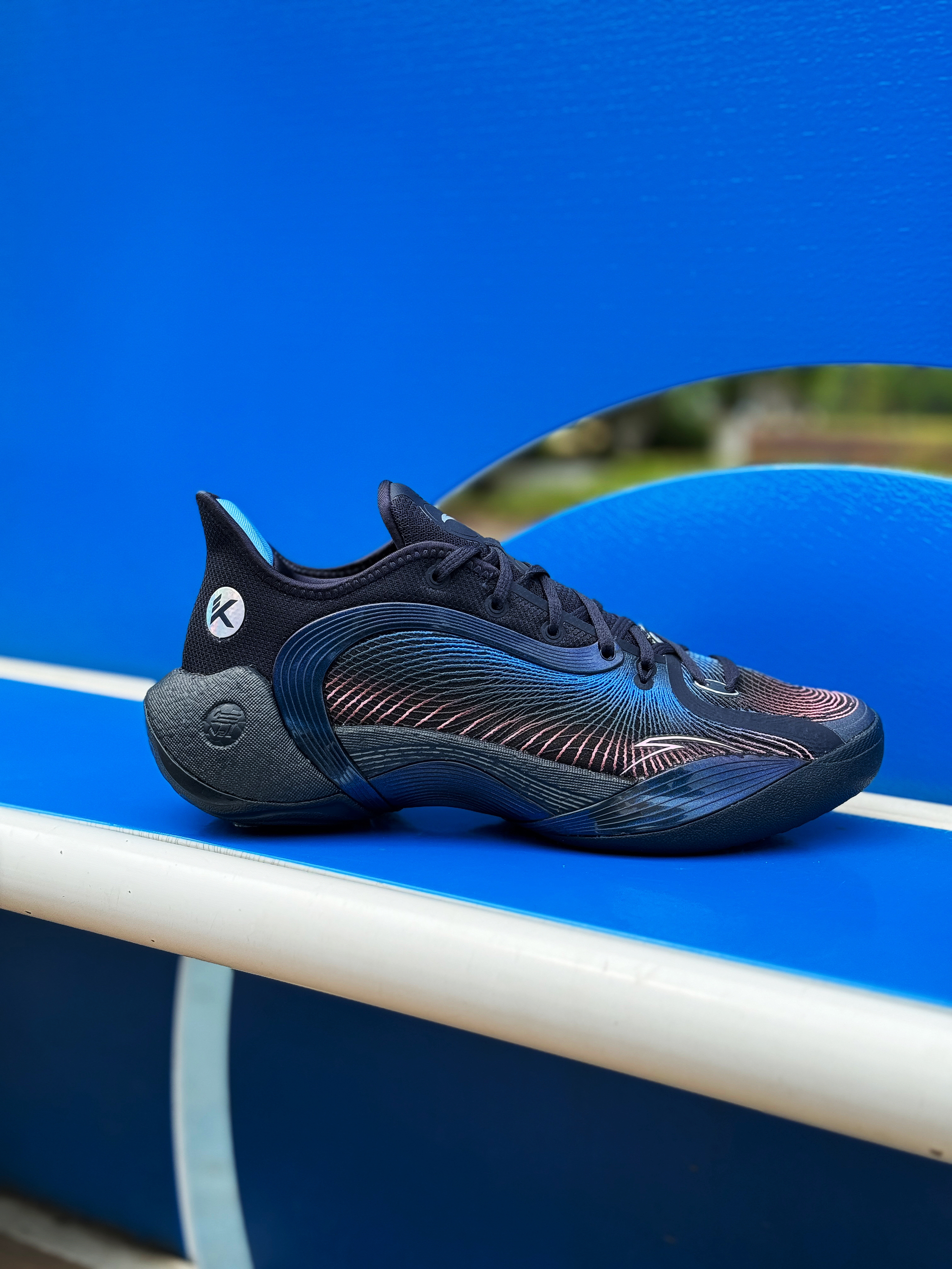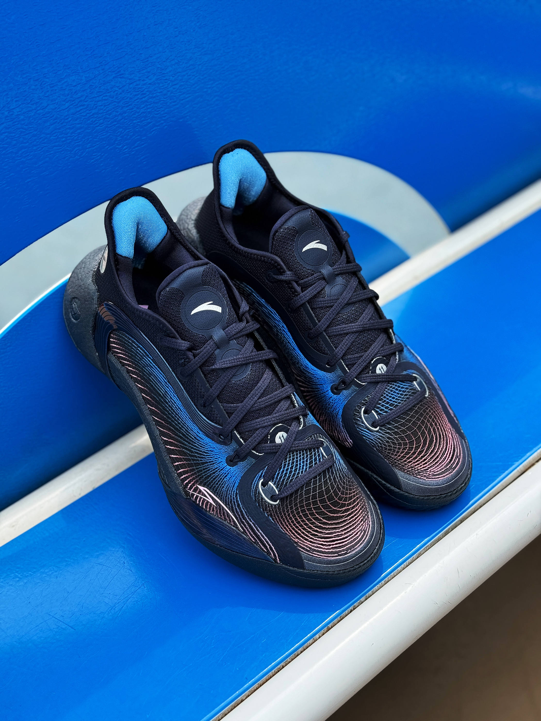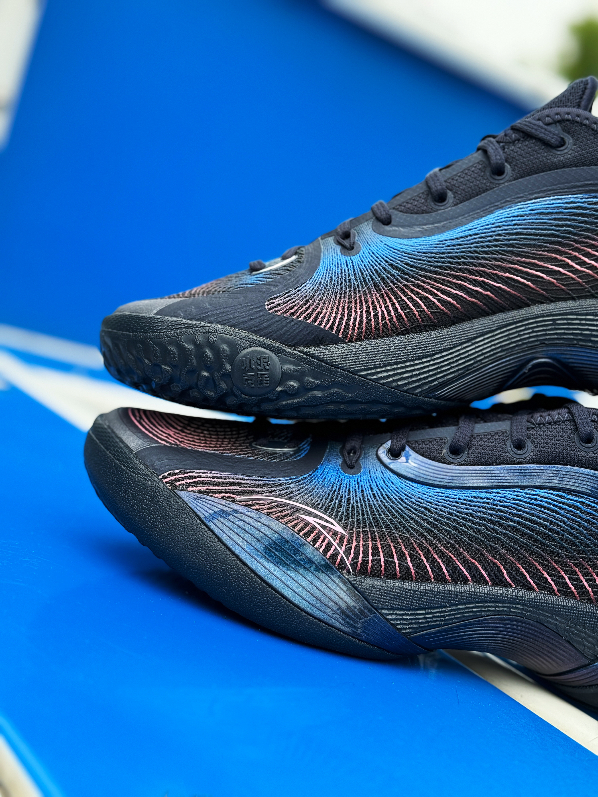 外场实战利器 安踏三分雨2又出新配色了 收到的这双“微光海洋”配色实在太对我口味了! 整体黑蓝搭配 有种海洋的深邃感 粉色点缀的弦科技鞋面神秘又好看!环绕式TPU完美融入鞋身 并做了渐变效果 辨识度超高! 全掌氮科技搭配水泥克星外底 妥妥的外场实战利器!脚感轻质舒适 实战体验感很不错 夏季打球常备款 稳了!