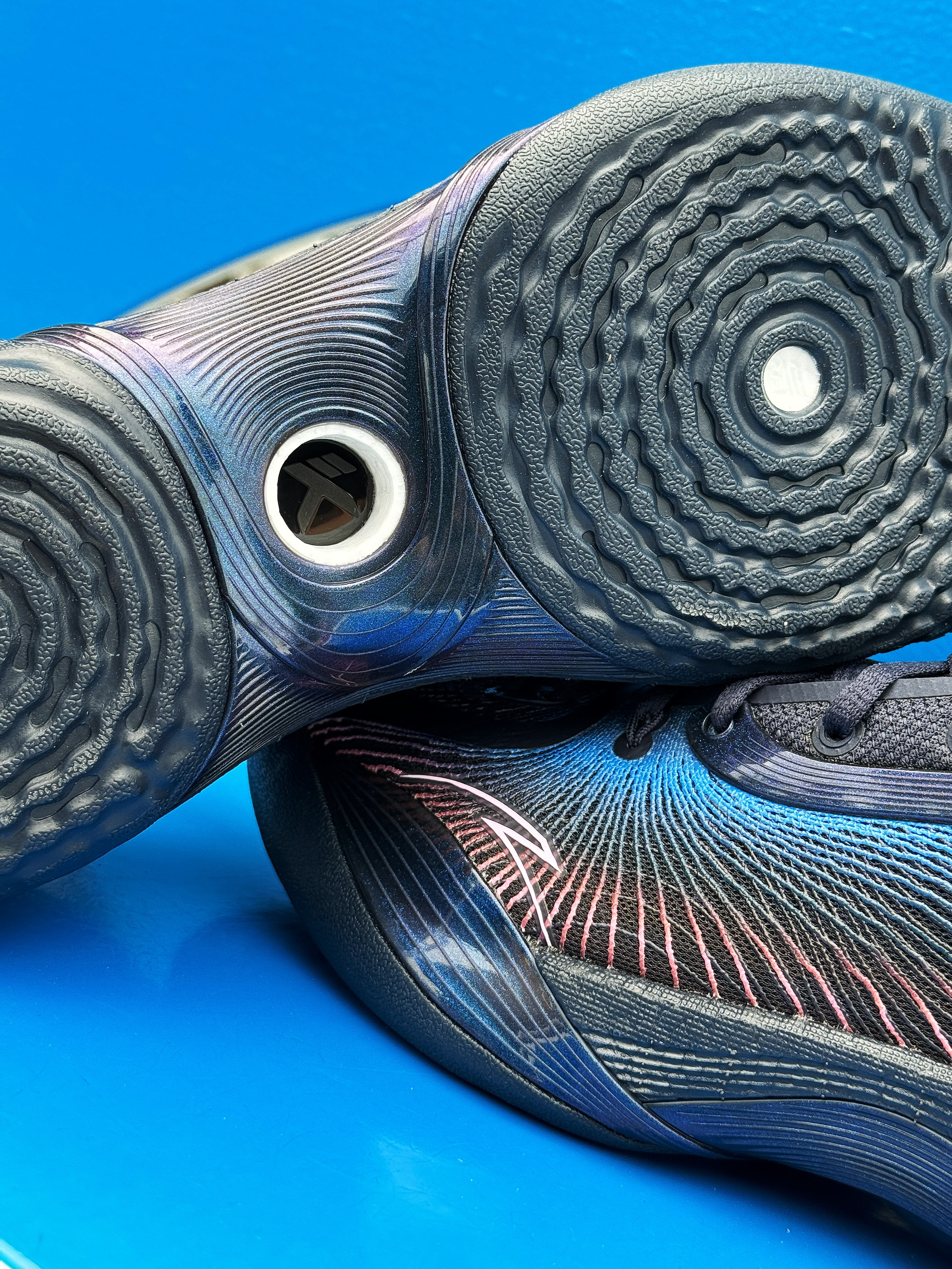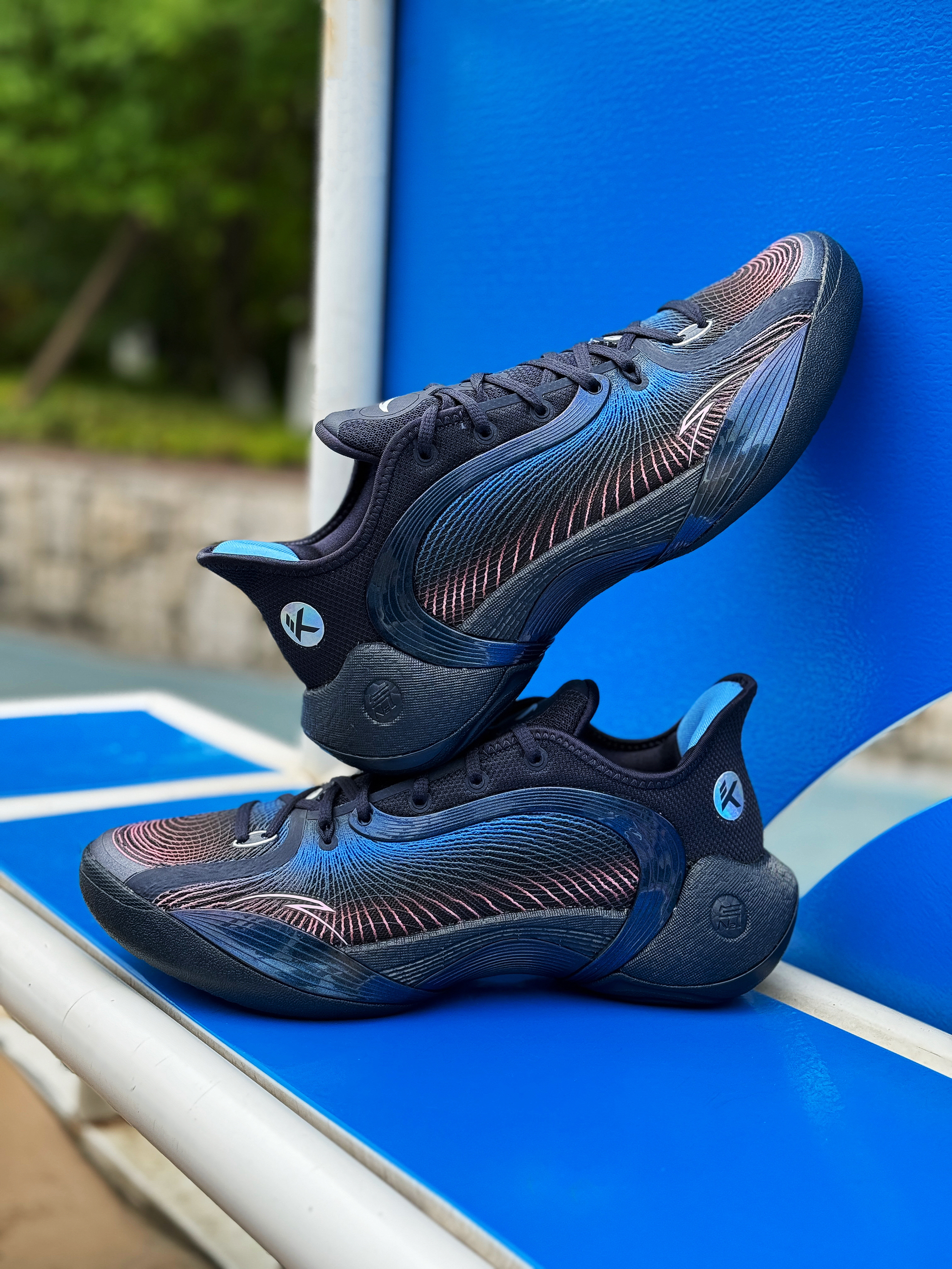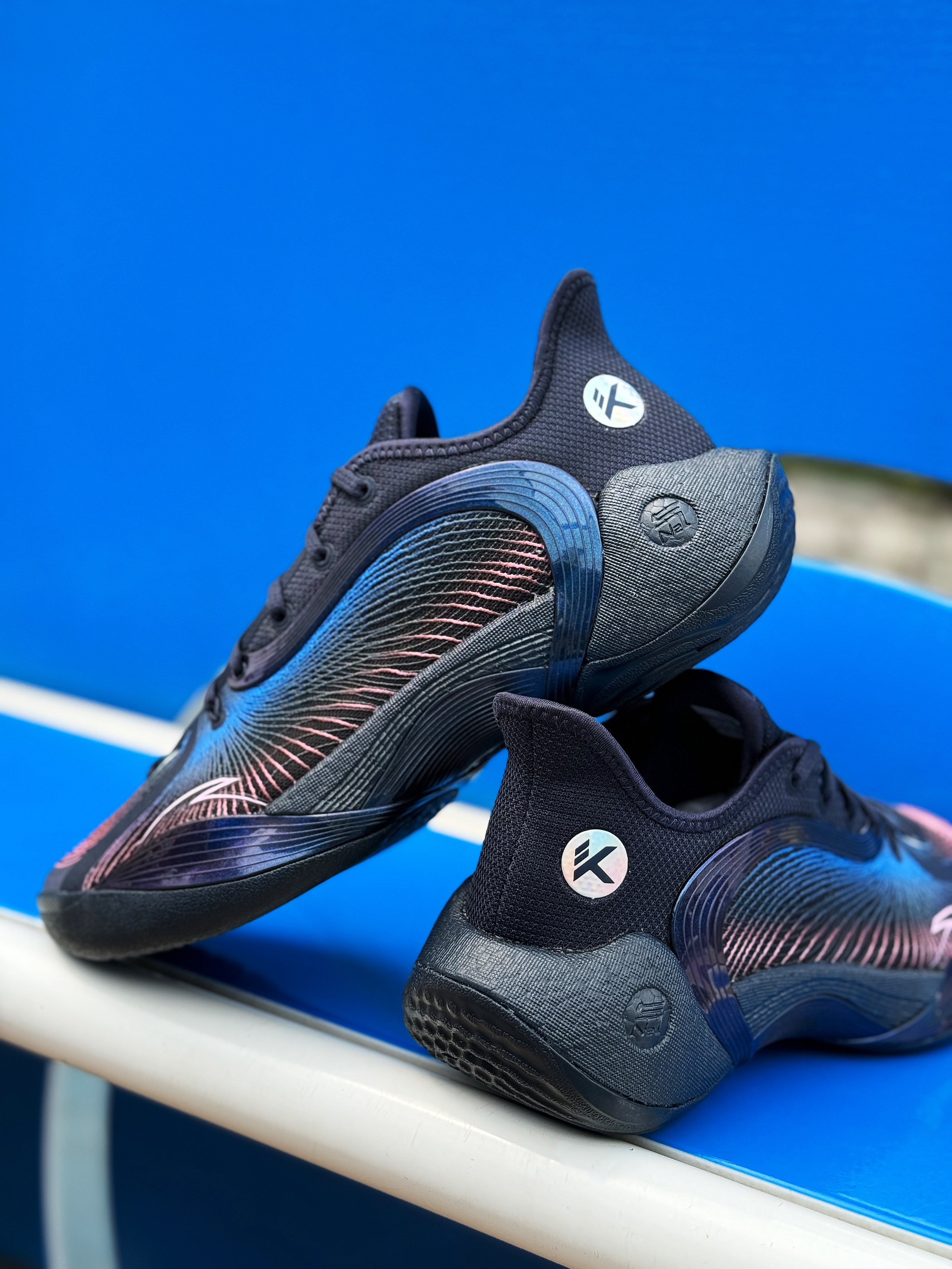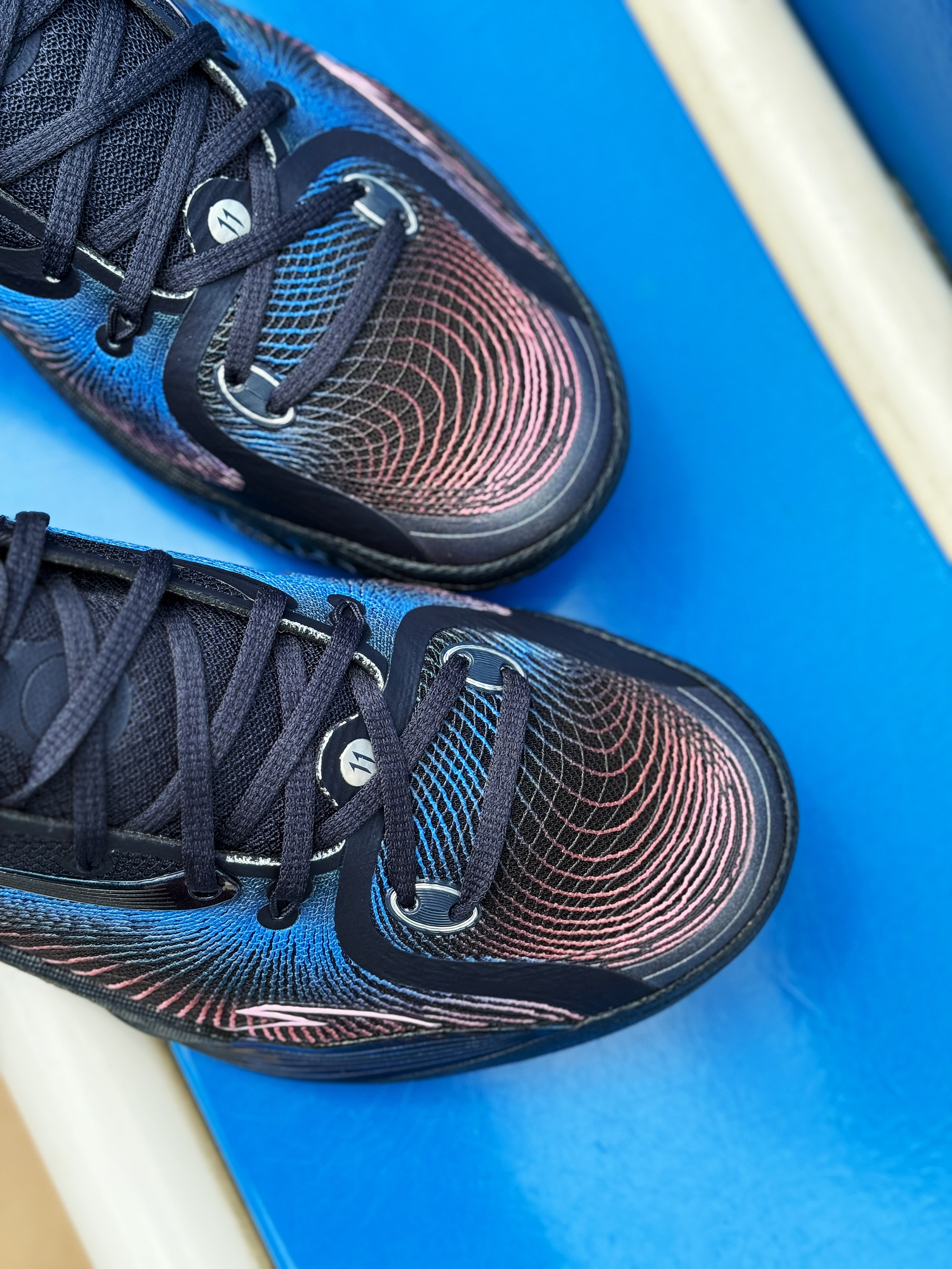 外场实战利器 安踏三分雨2又出新配色了 收到的这双“微光海洋”配色实在太对我口味了! 整体黑蓝搭配 有种海洋的深邃感 粉色点缀的弦科技鞋面神秘又好看!环绕式TPU完美融入鞋身 并做了渐变效果 辨识度超高! 全掌氮科技搭配水泥克星外底 妥妥的外场实战利器!脚感轻质舒适 实战体验感很不错 夏季打球常备款 稳了!