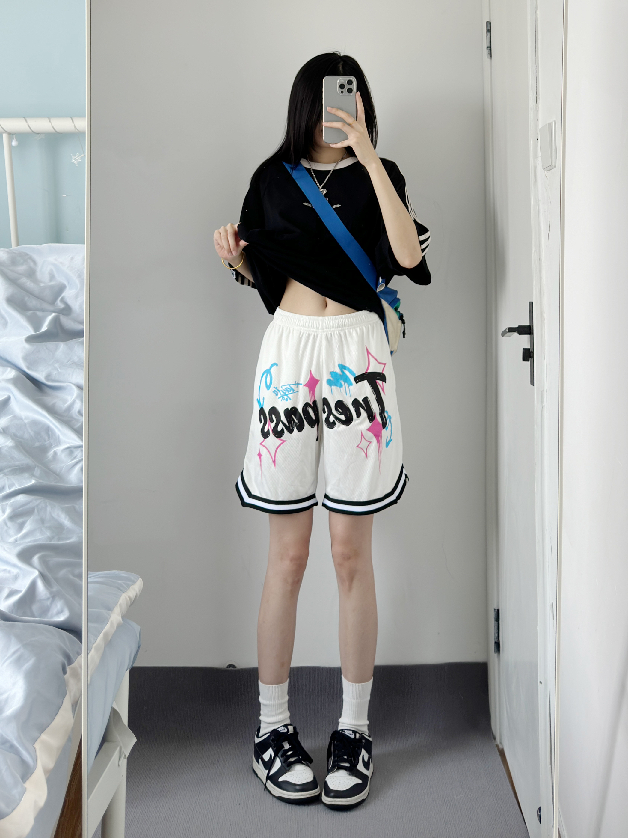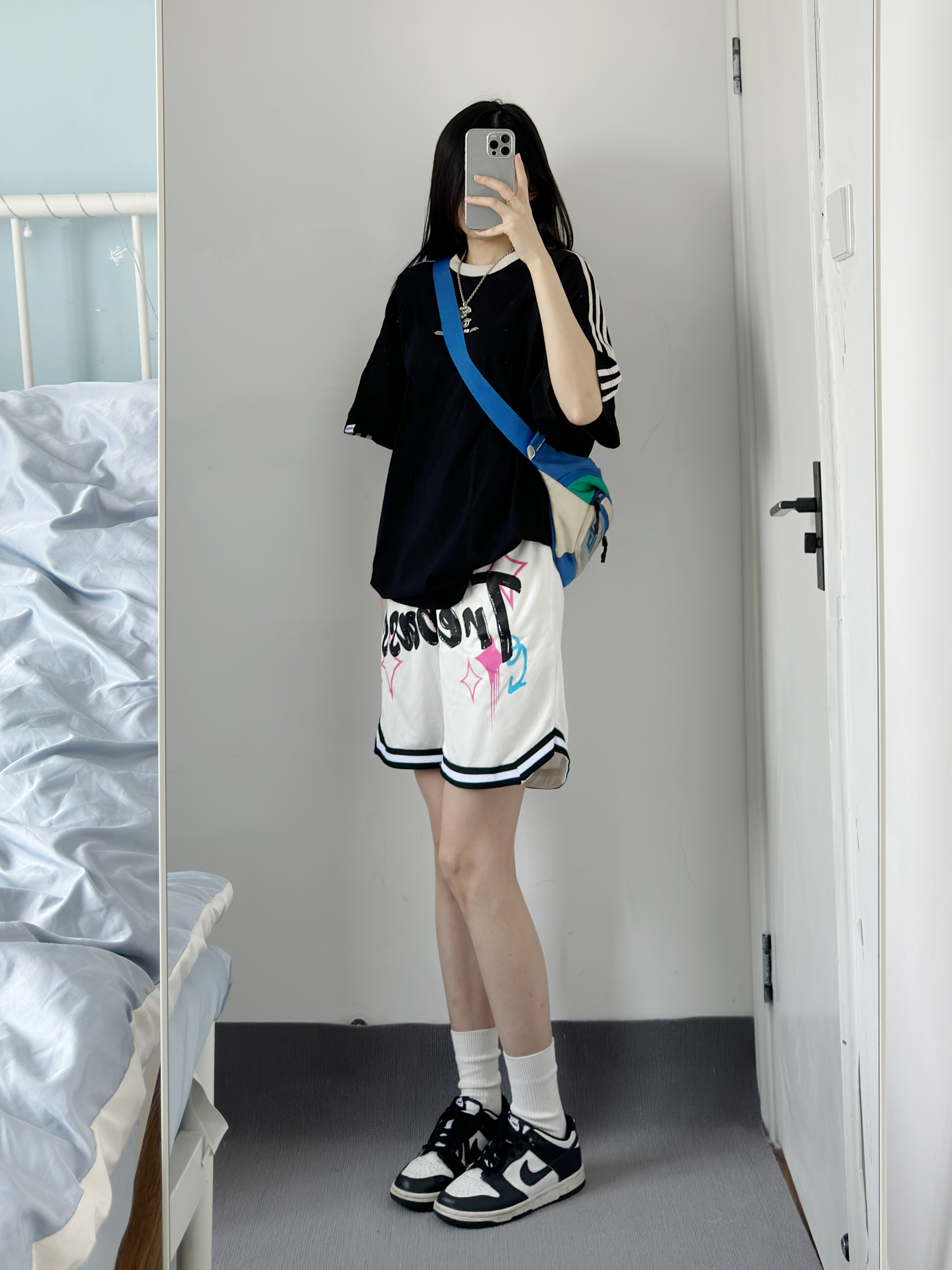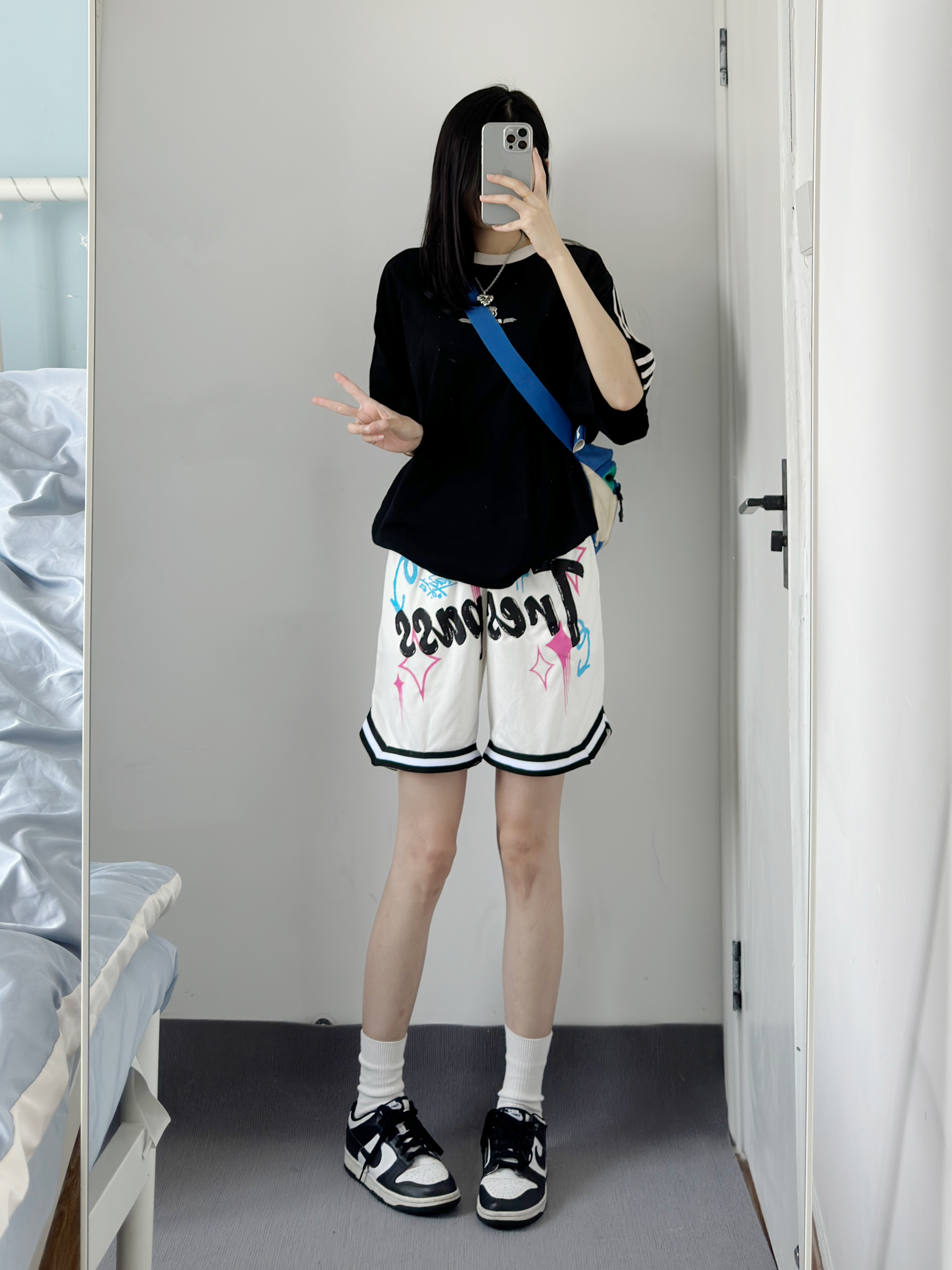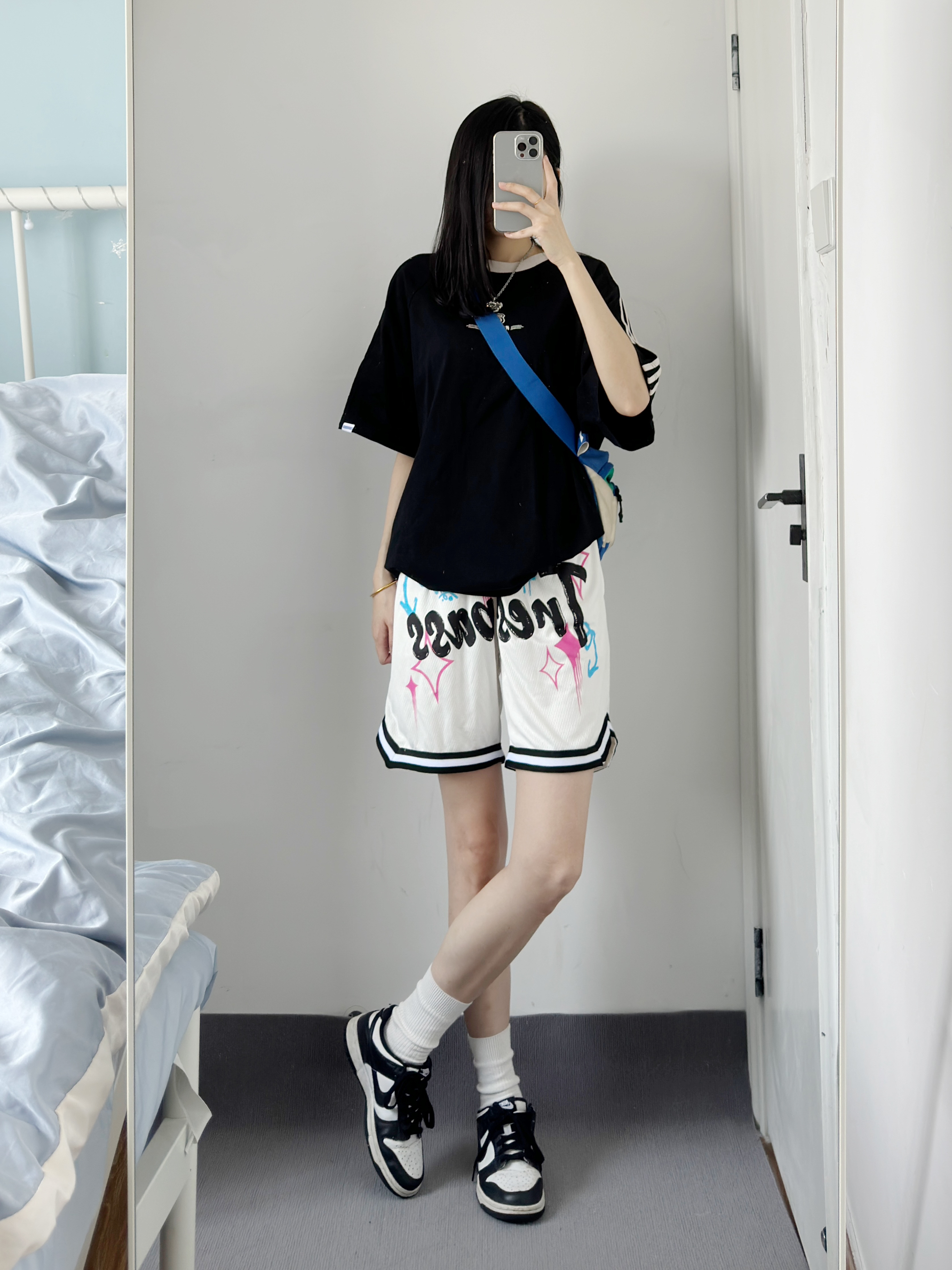 简单短袖搭配五分裤一套好帅呀 这件五分裤面料好透气舒服 大印花设计很街头潮流 很适合日常或者运动时候穿~ 无性别男女都能穿✌️