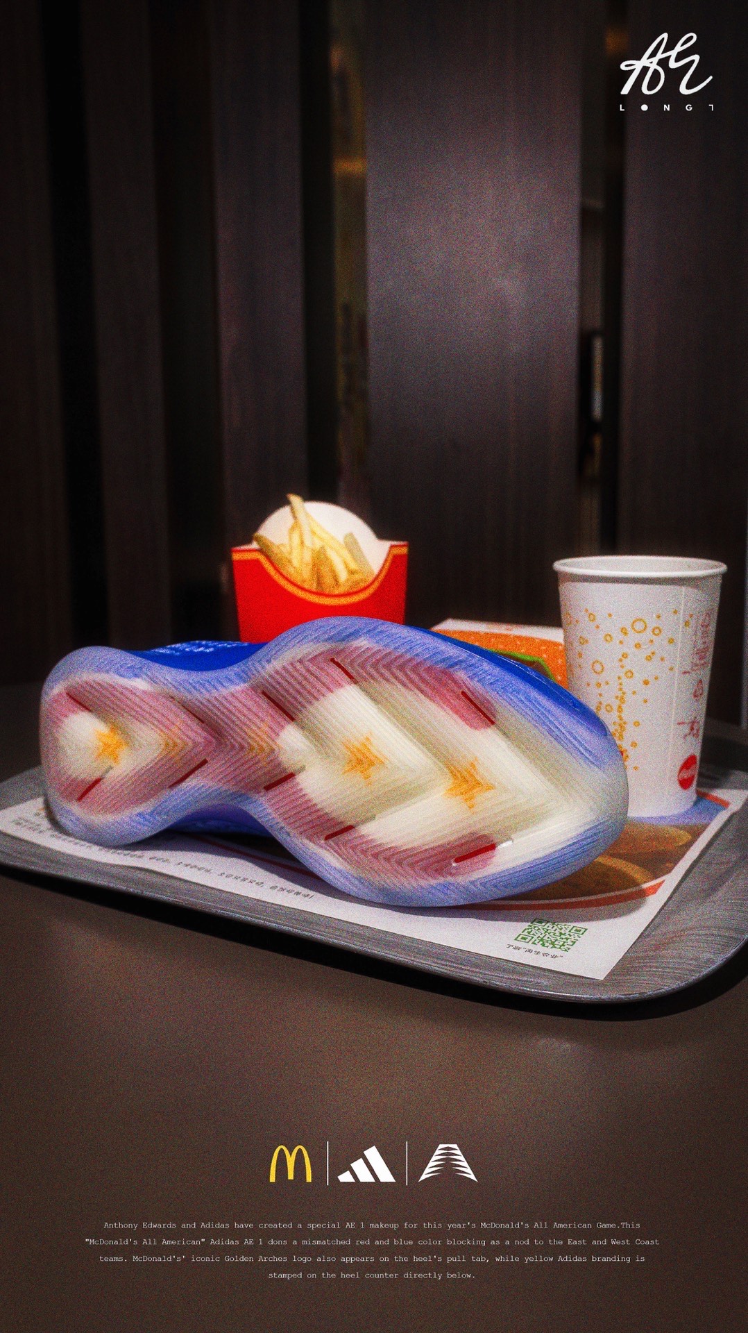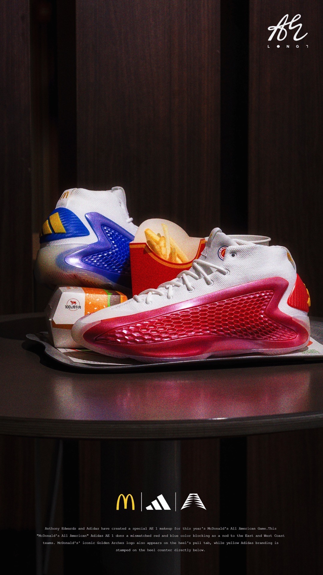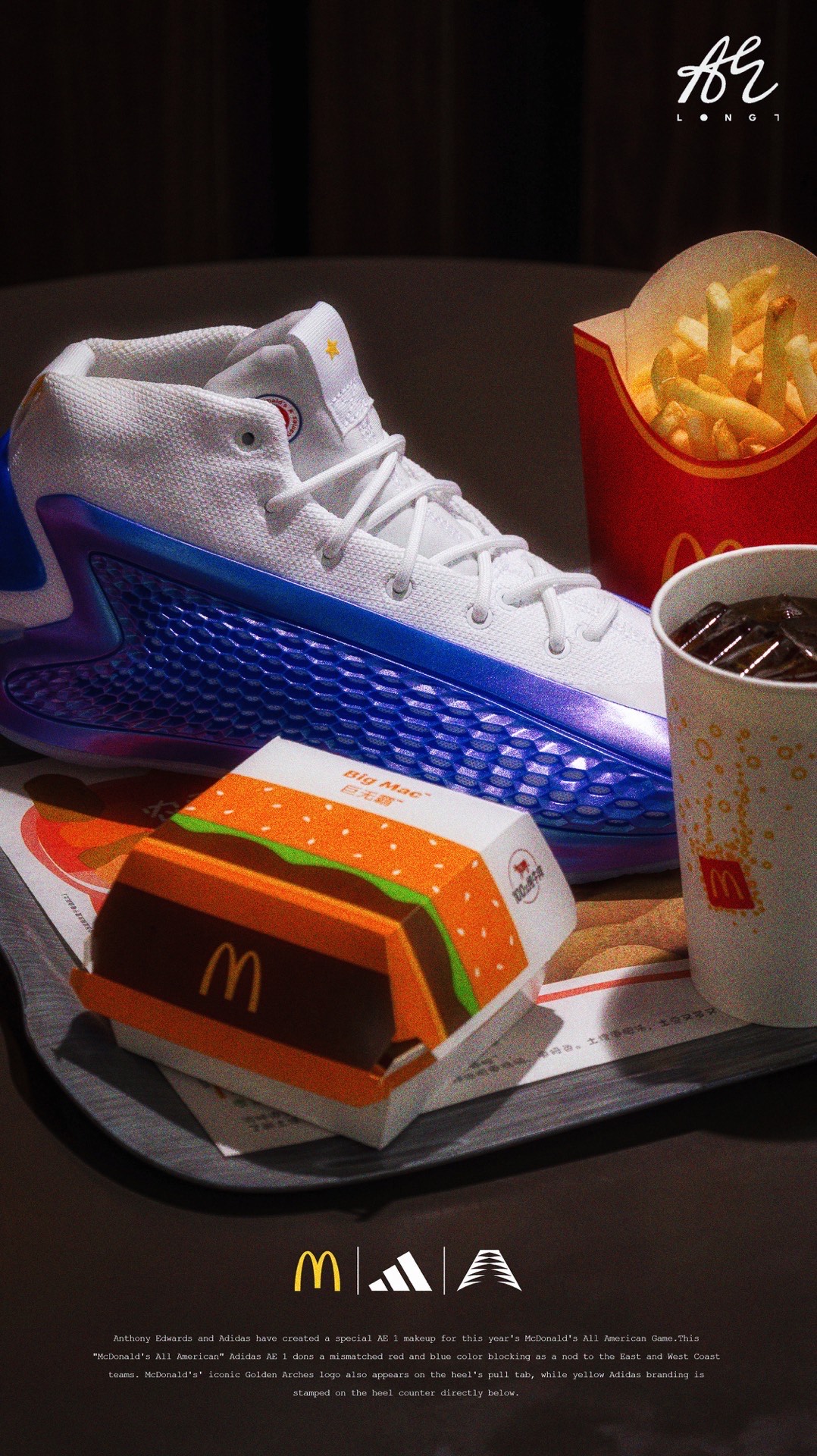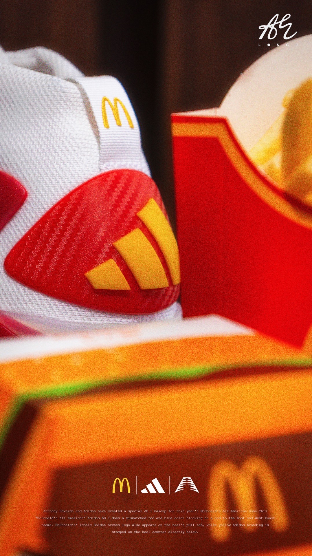 🍟麦门永存🍟 👟:McDonald's x adidas A.E. 1 adidas专为麦当劳全美高中生明星赛打造的A.E. 1,使用了红蓝色的鸳鸯设计,并在细节处点缀有麦当劳的经典logo与元素,也是少数使用了白色织物的A.E. 1,非常可惜的是该配色仅在Footlocker独家发售,所以入手还是有些许难度的~ #把麦门穿脚上 #麦门永存 #爱德华兹太像乔丹了