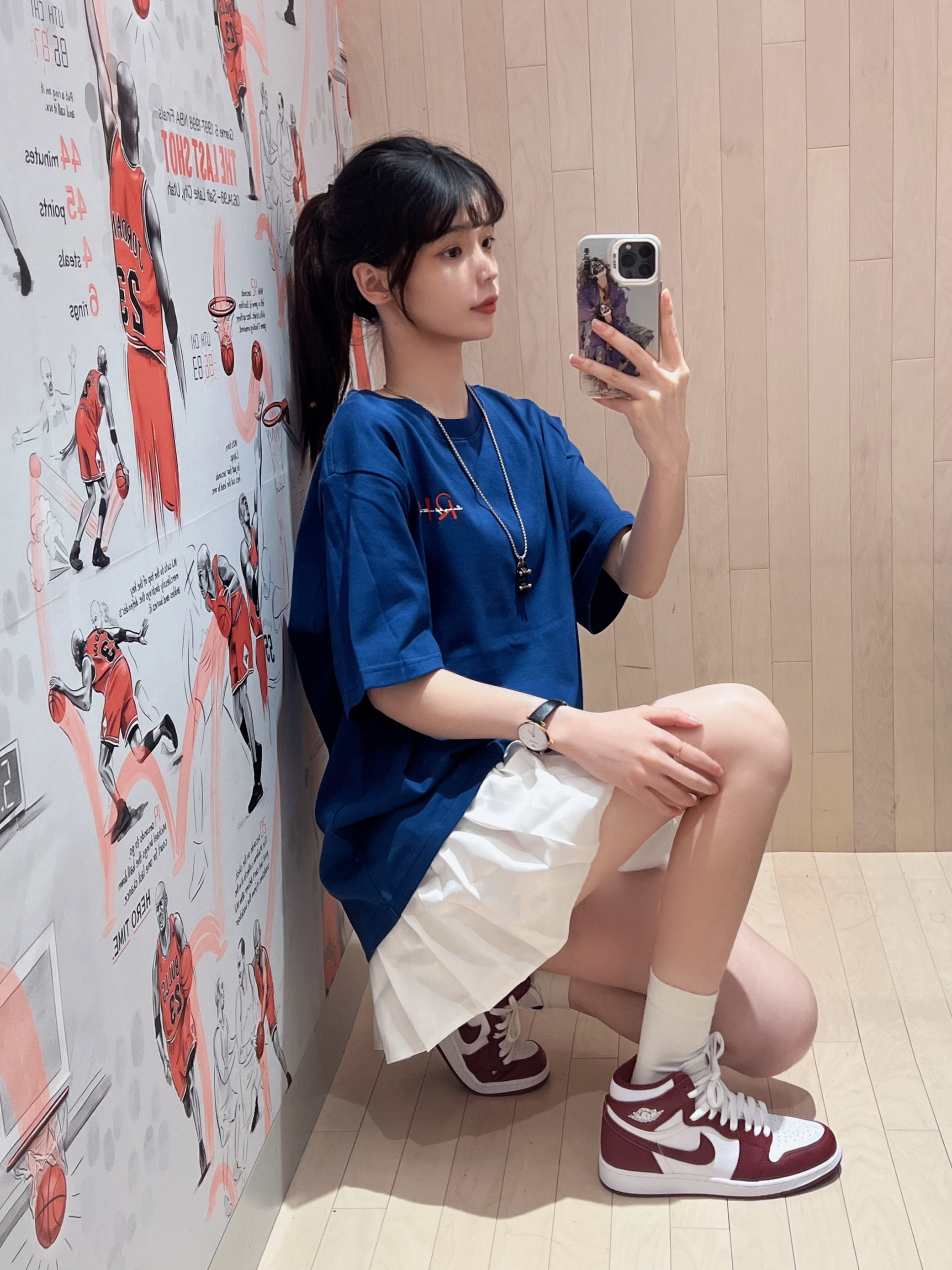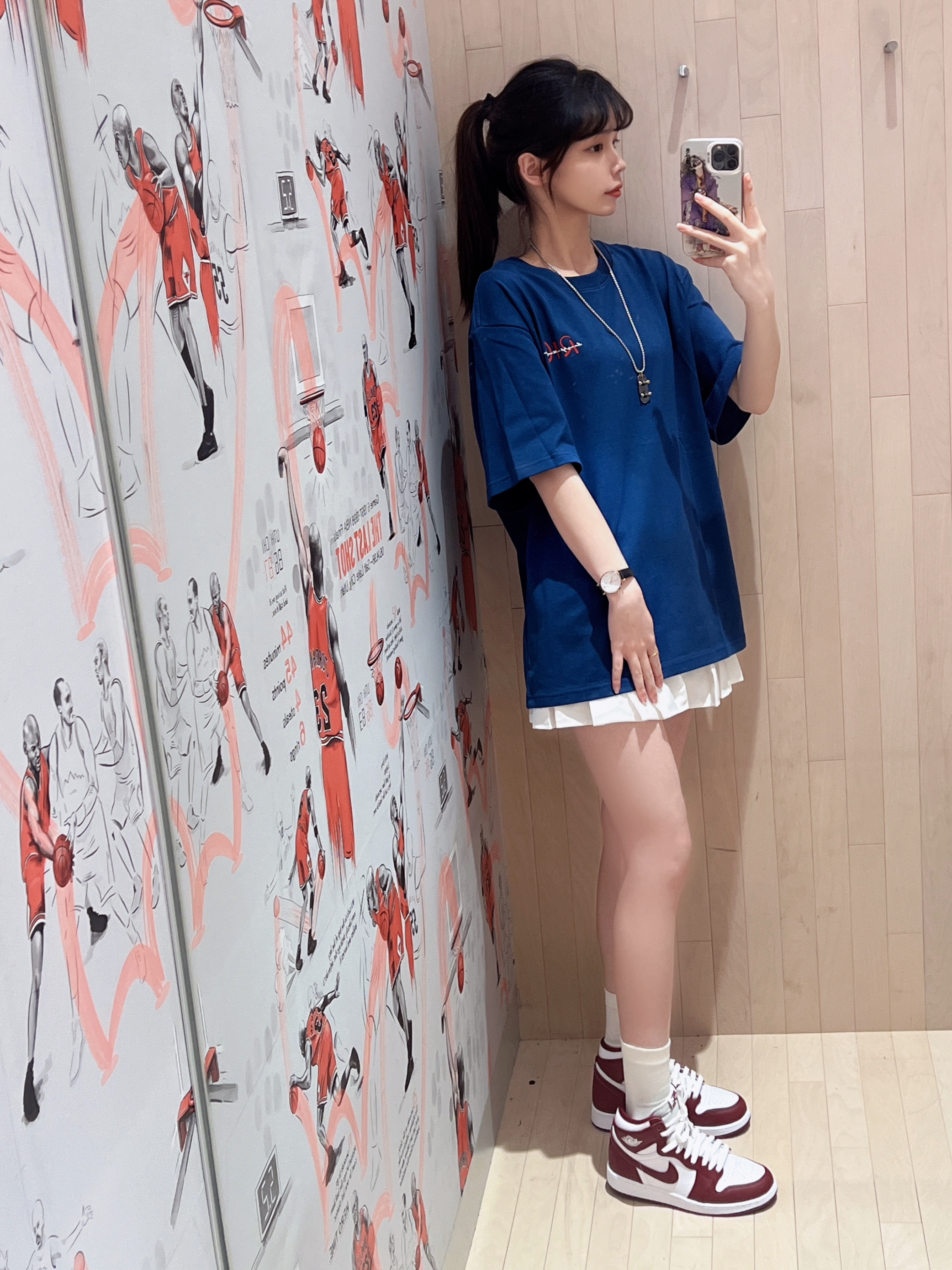 果然💙❤️蓝红上身超显白😏😏 👕 RickyisClown 🏠滴! 个人觉得版型很正 宽松版型 胸前的logo设计不抢眼 背面的雪山图案也很酷 它布料不是那种很薄的 比较厚实立体感好 👧166/43kg M码 再搭配👟AJ1OG高帮整体很清爽❤️爱了