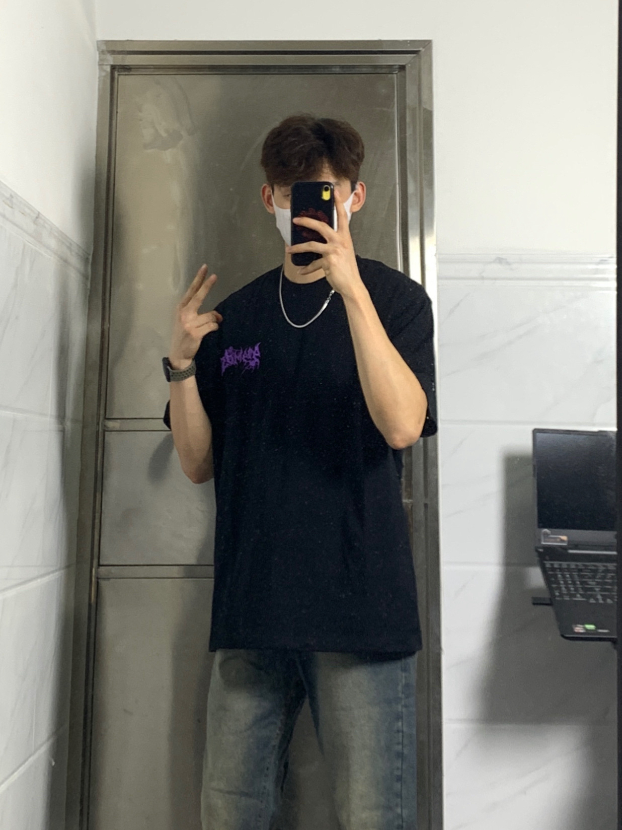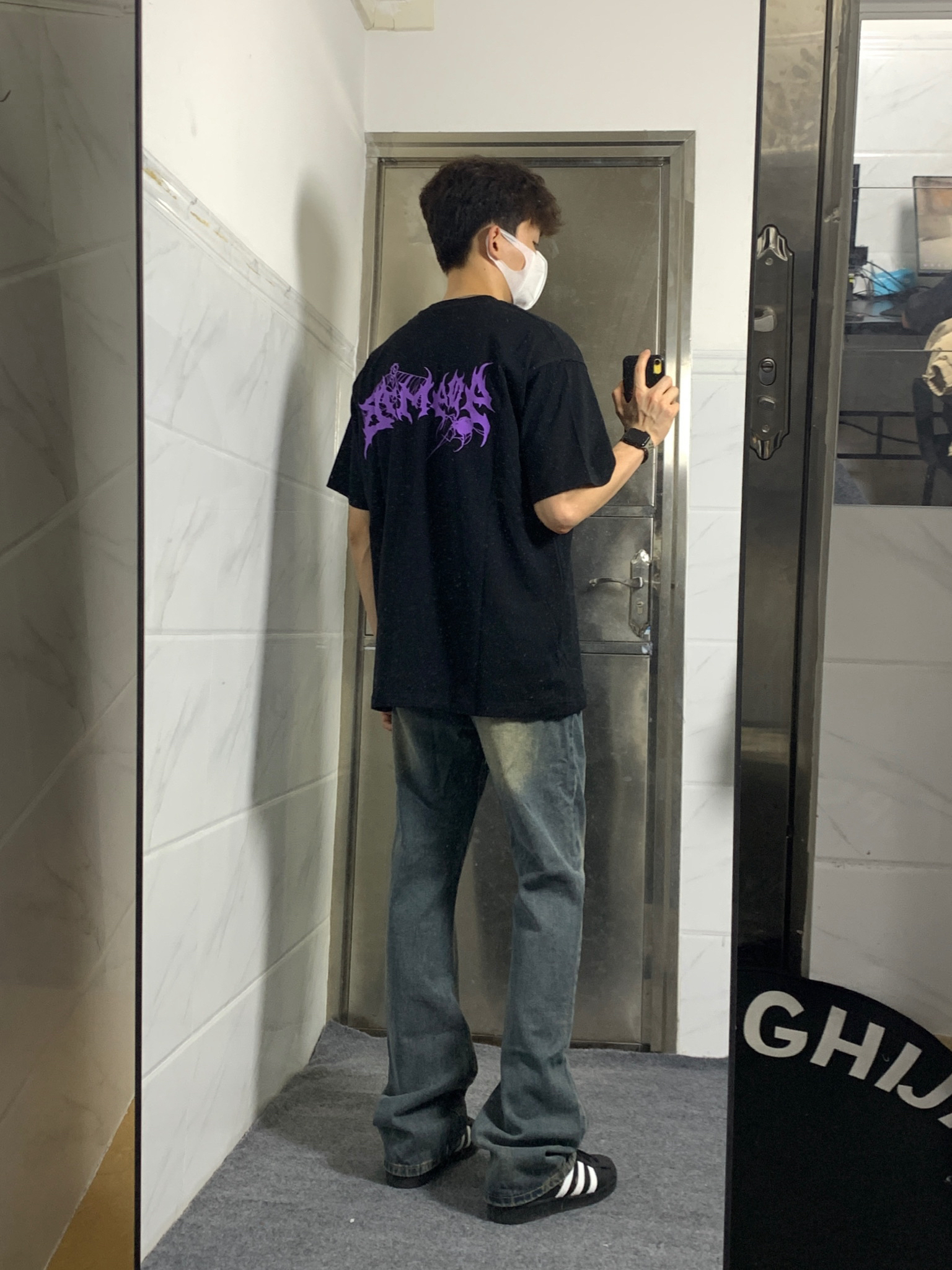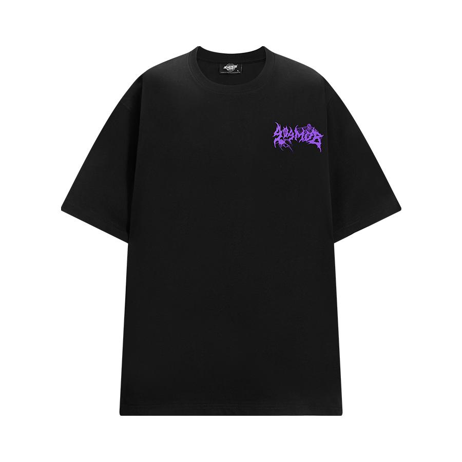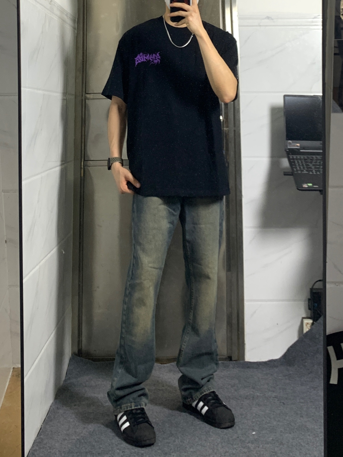 👔选择了一款黑色美式印花T恤 美式撞色蛛网印花logo设计感十足✅ 宽松重磅的面料上身非常有质感🤩 👖搭配一条做旧款微喇牛仔裤 微喇的版型真的非常显高显瘦❗️ 👟再搭配一双黑色经典贝壳头 简单干净又是一套‼️ ☑️身高 体重|180 130