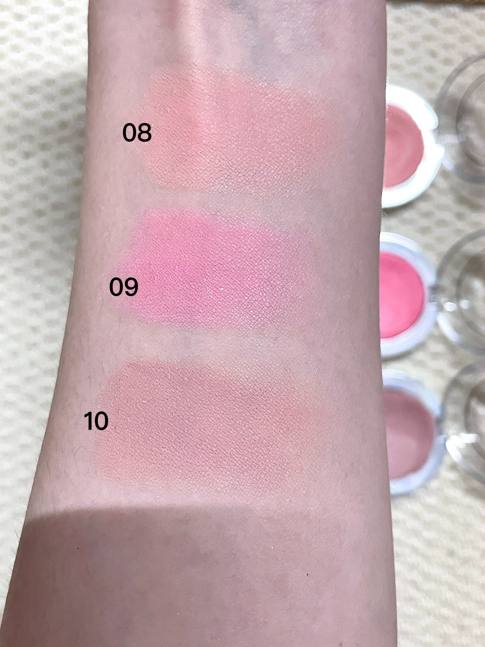谁还没有浮汀这款土豆泥麻薯质地的腮红呀 08 吃瓜侠 活泼元气的粉蜜瓜 09 桃气包 甜心芭比的水蜜桃色 10 杏运鹅 清冷氛围的灰杏色