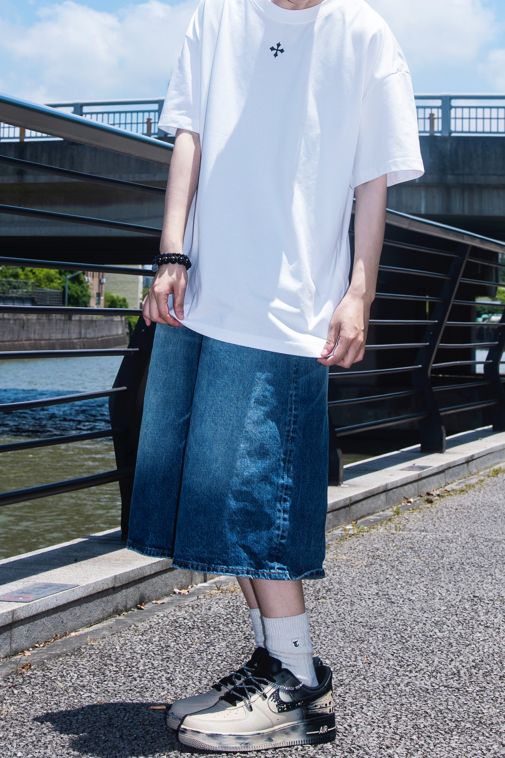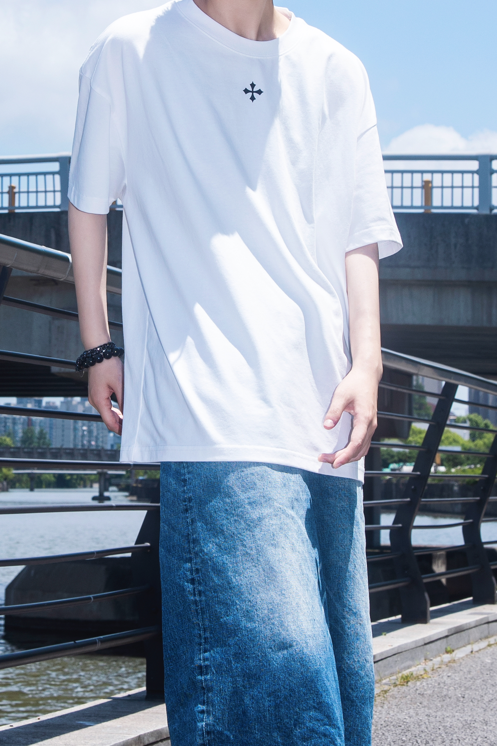夏日白t配牛仔 怎么穿都不会腻 分享一套街头少年感穿搭 穿搭指南: 上身一件白色短袖T恤 夏天就爱穿宽松的基础版型 舒适随性 小十字架印花简约又不失细节 下身一条七分水洗牛仔裤增加街头感 蓝白搭配是清爽的少年感没错了 上脚一双nike af1废土风定制球鞋 是同样很街头的荒漠黑武士 银色链条和鞋带一起个性又有层次感 整体松松垮垮的搭配一整个舒服住