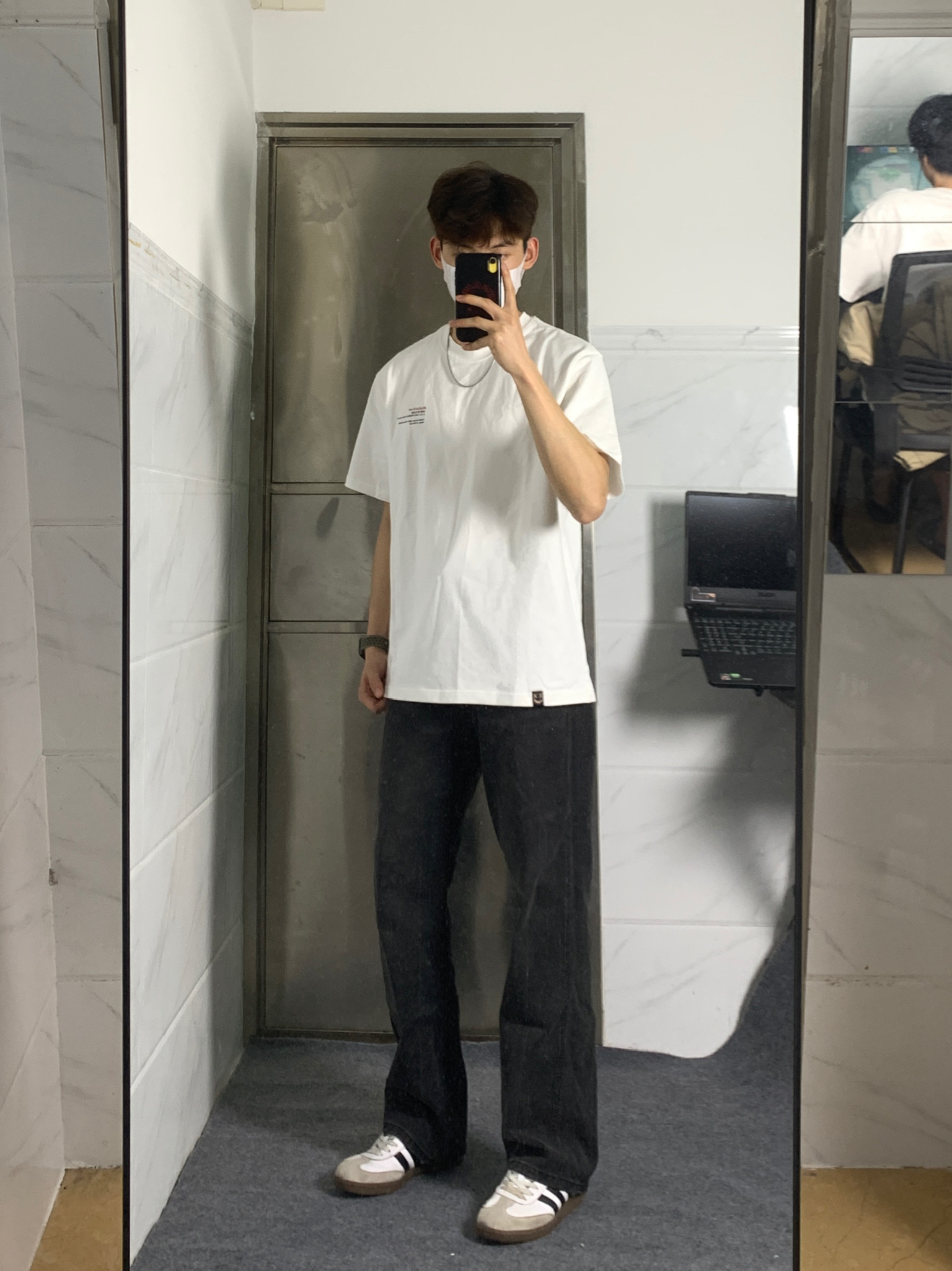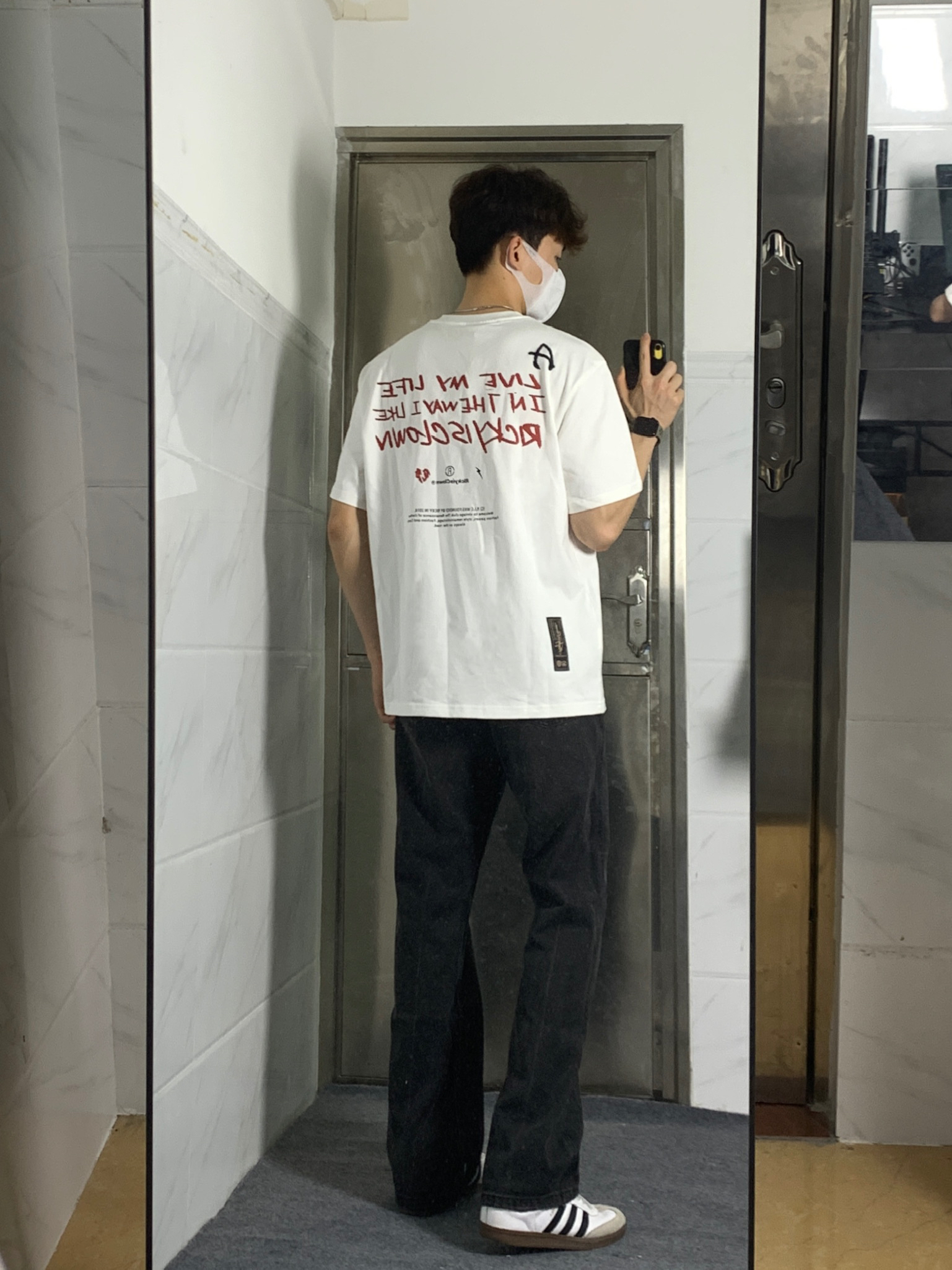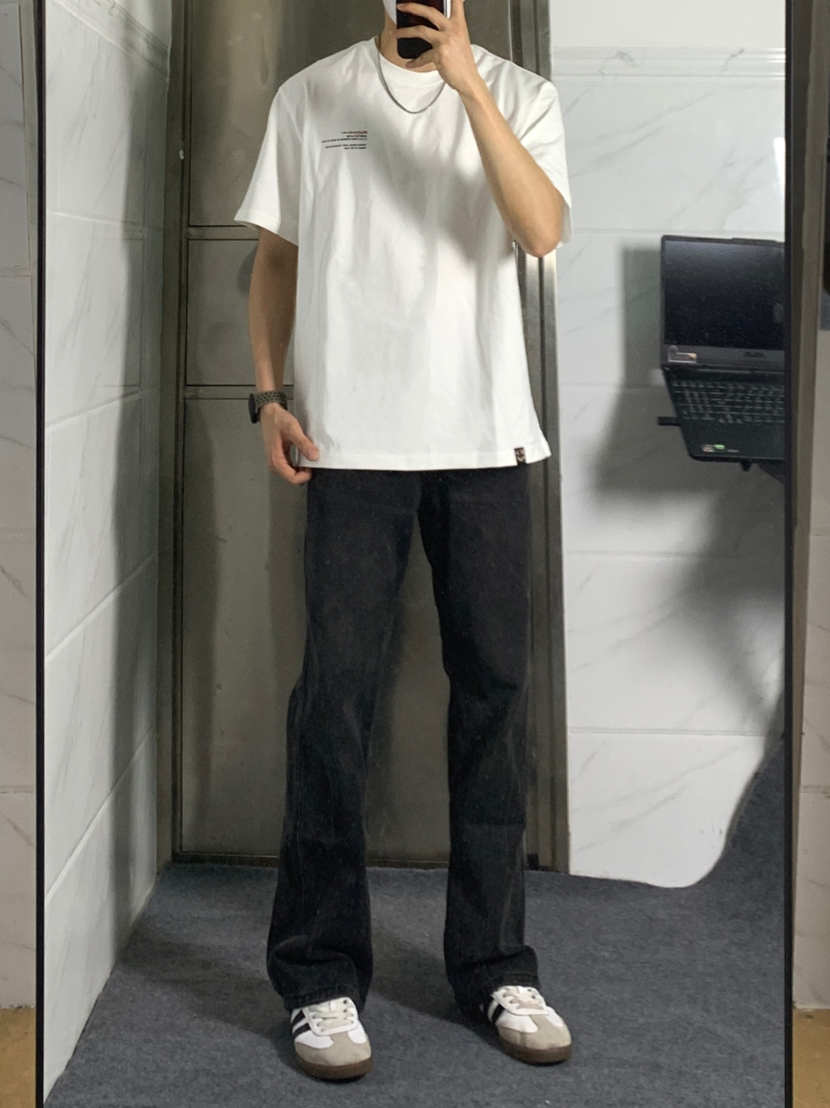 简单干净的穿搭是永远的必杀技!! 白色T恤配微喇牛仔裤简单耐看,非常适合夏天穿 白色字母印花T恤上衣上身很干净🤩 后背小丑字母印花设计真的非常亮眼 搭配一条黑灰色微喇的牛仔裤👖 微喇的版型看起来质感满满 再搭配一双德训鞋 一套下来真的非常帅!!