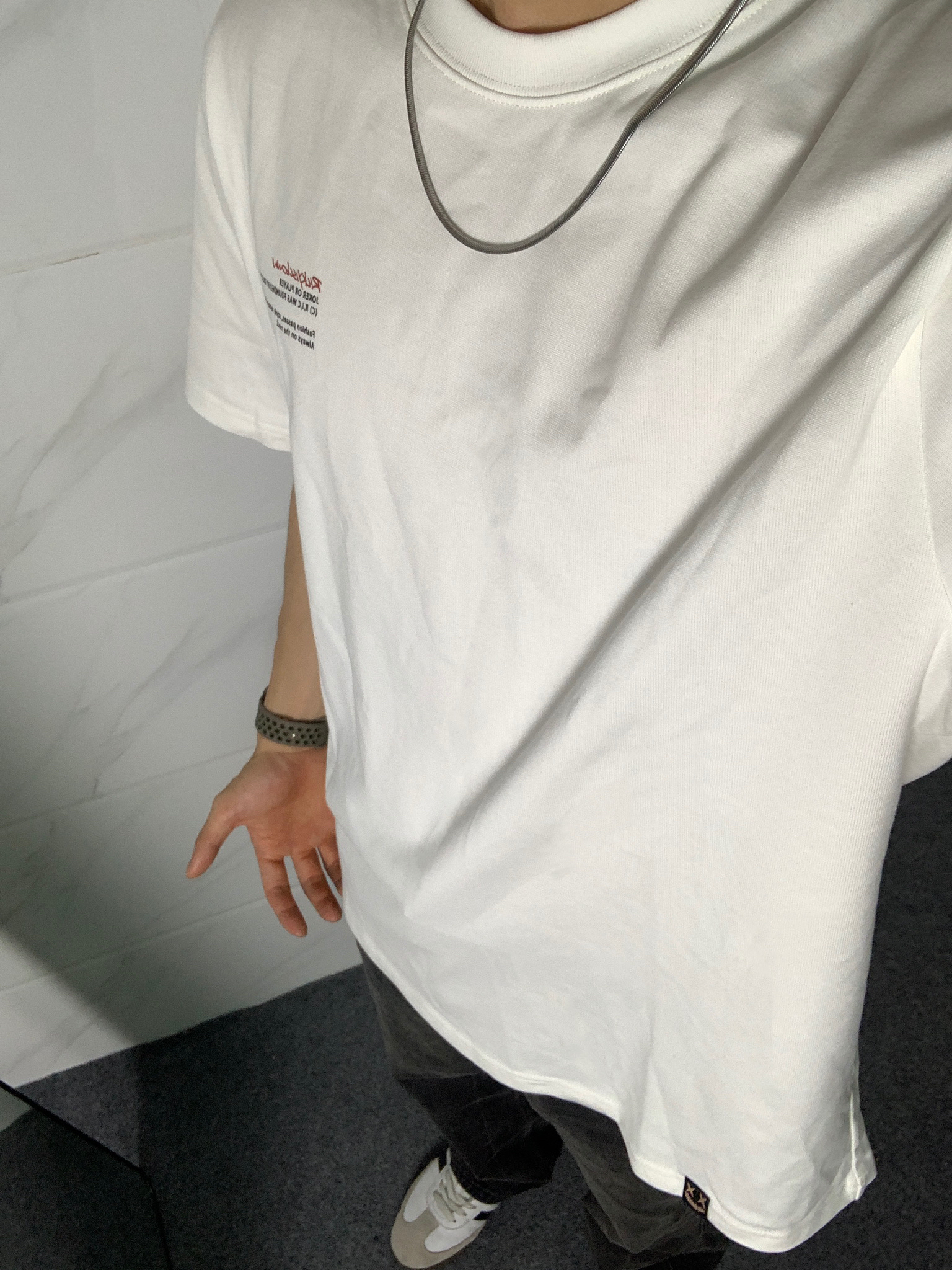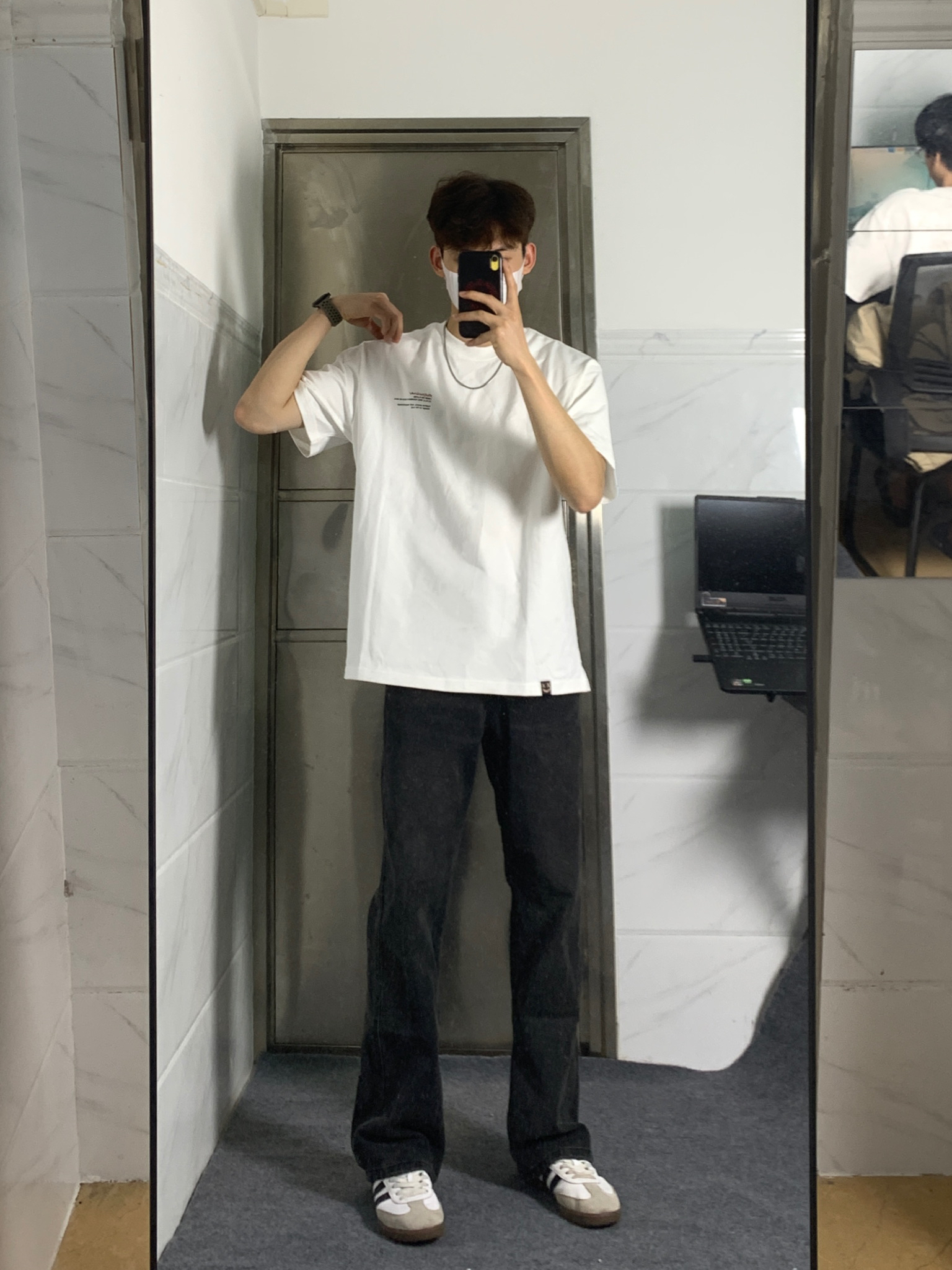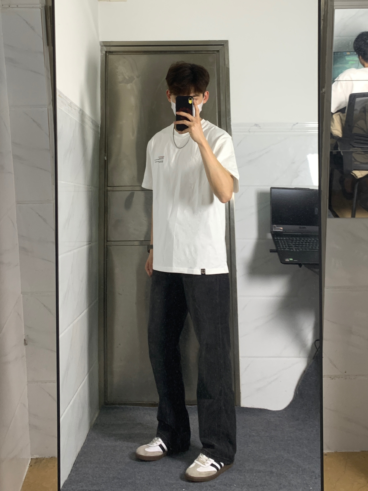简单干净的穿搭是永远的必杀技!! 白色T恤配微喇牛仔裤简单耐看,非常适合夏天穿 白色字母印花T恤上衣上身很干净🤩 后背小丑字母印花设计真的非常亮眼 搭配一条黑灰色微喇的牛仔裤👖 微喇的版型看起来质感满满 再搭配一双德训鞋 一套下来真的非常帅!!