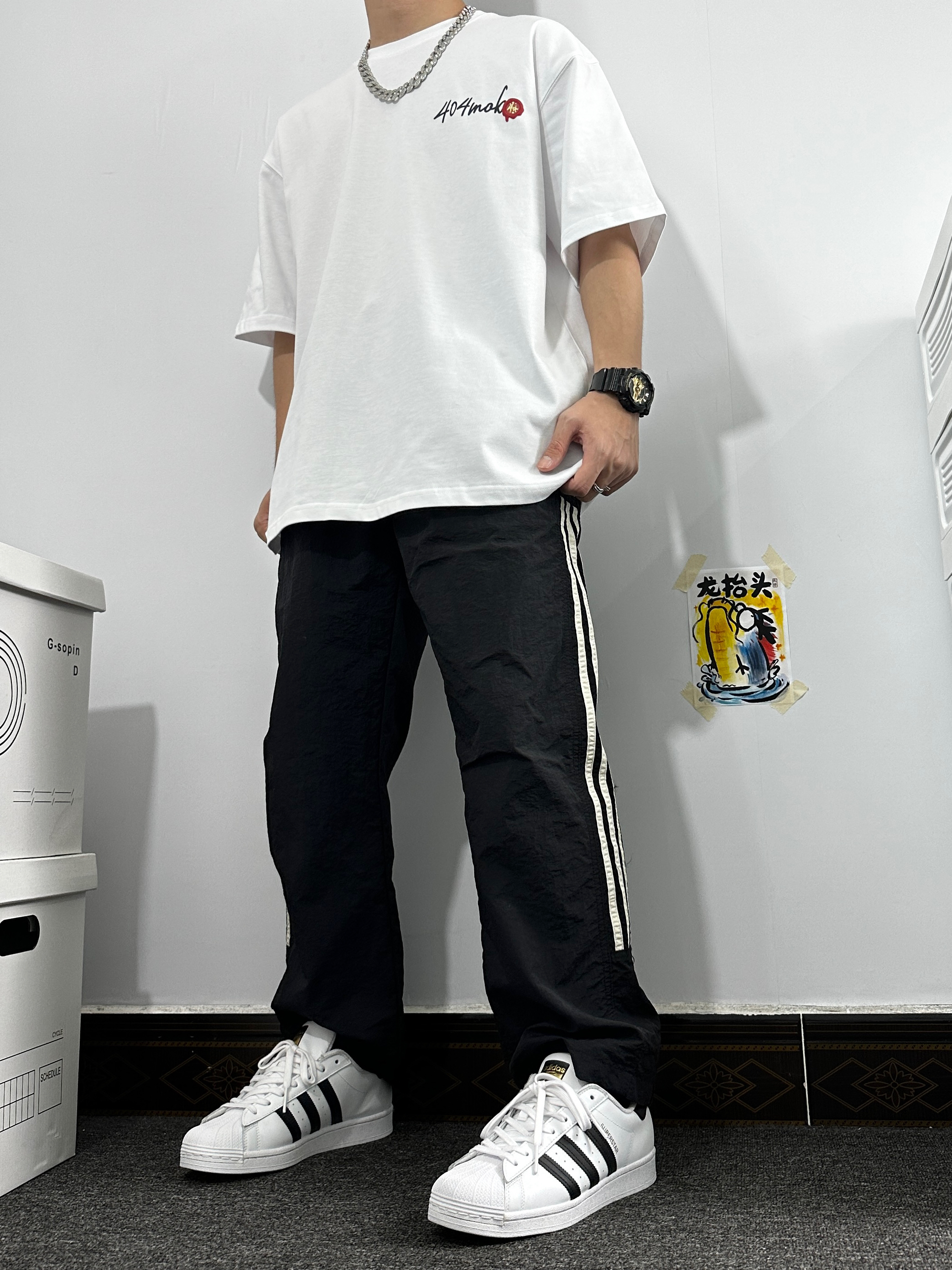 👔:404MOB GANG 白色圆领短袖,纯白配色 宽松版型,正面胸前小logo,后背印花logo也挺独特的,有个复古的邮戳效果,我就挺喜欢这种的; 👖:COLDSTONE休闲裤,宽松版型,面料偏薄,和休闲风搭配绝绝子; 👟:阿迪达斯贝壳头小白鞋,算是我出勤率最高的一双啦;