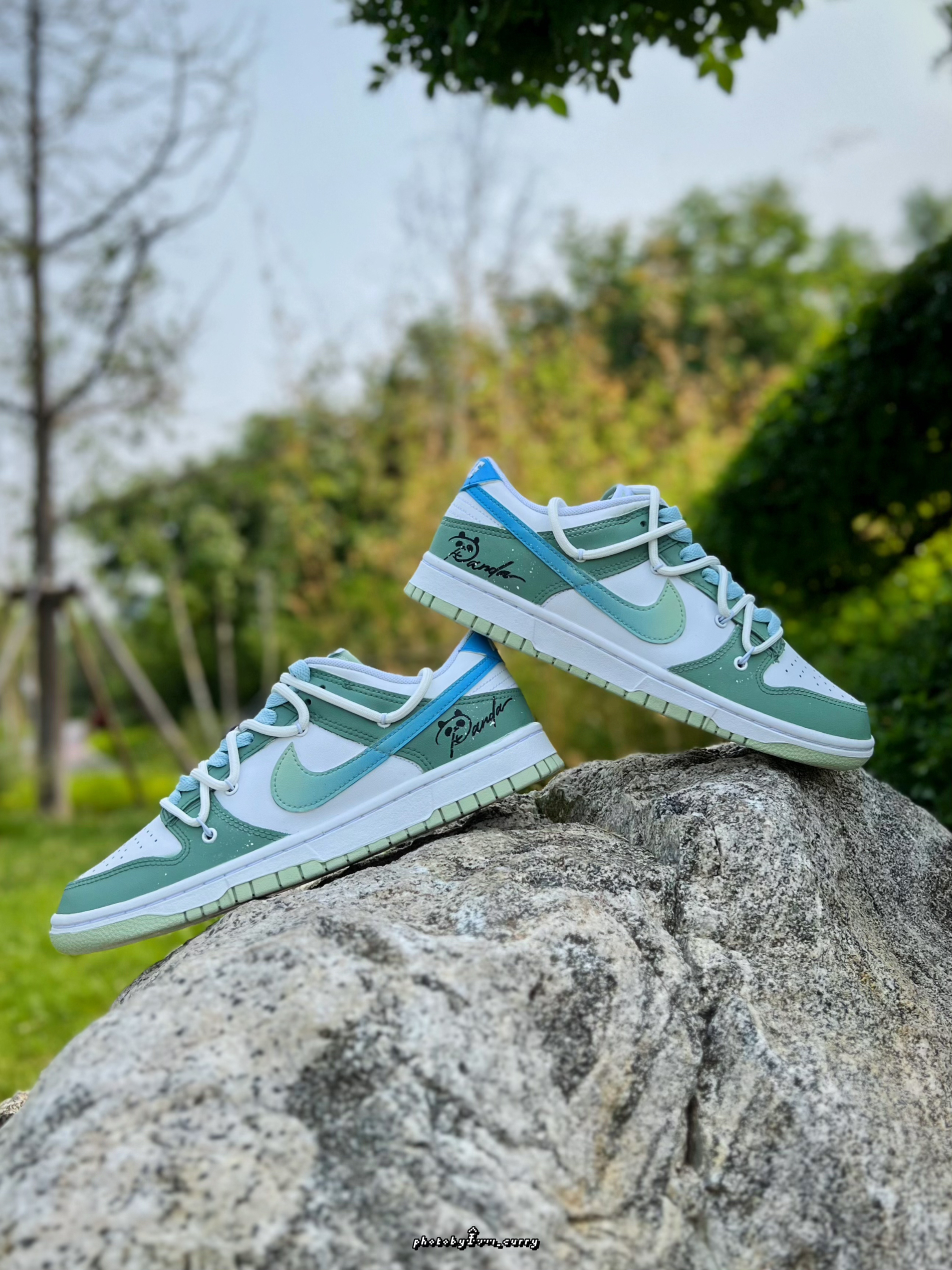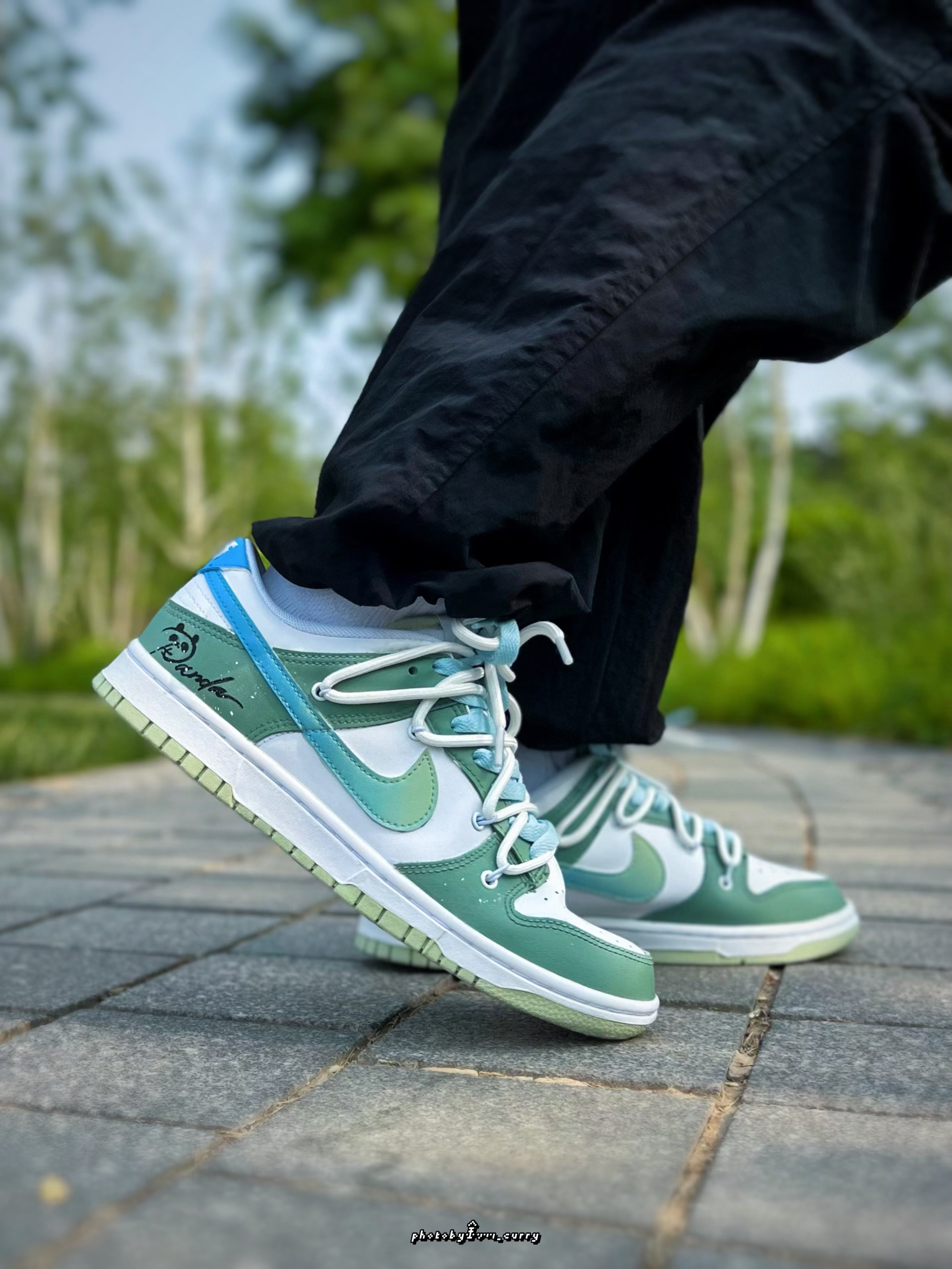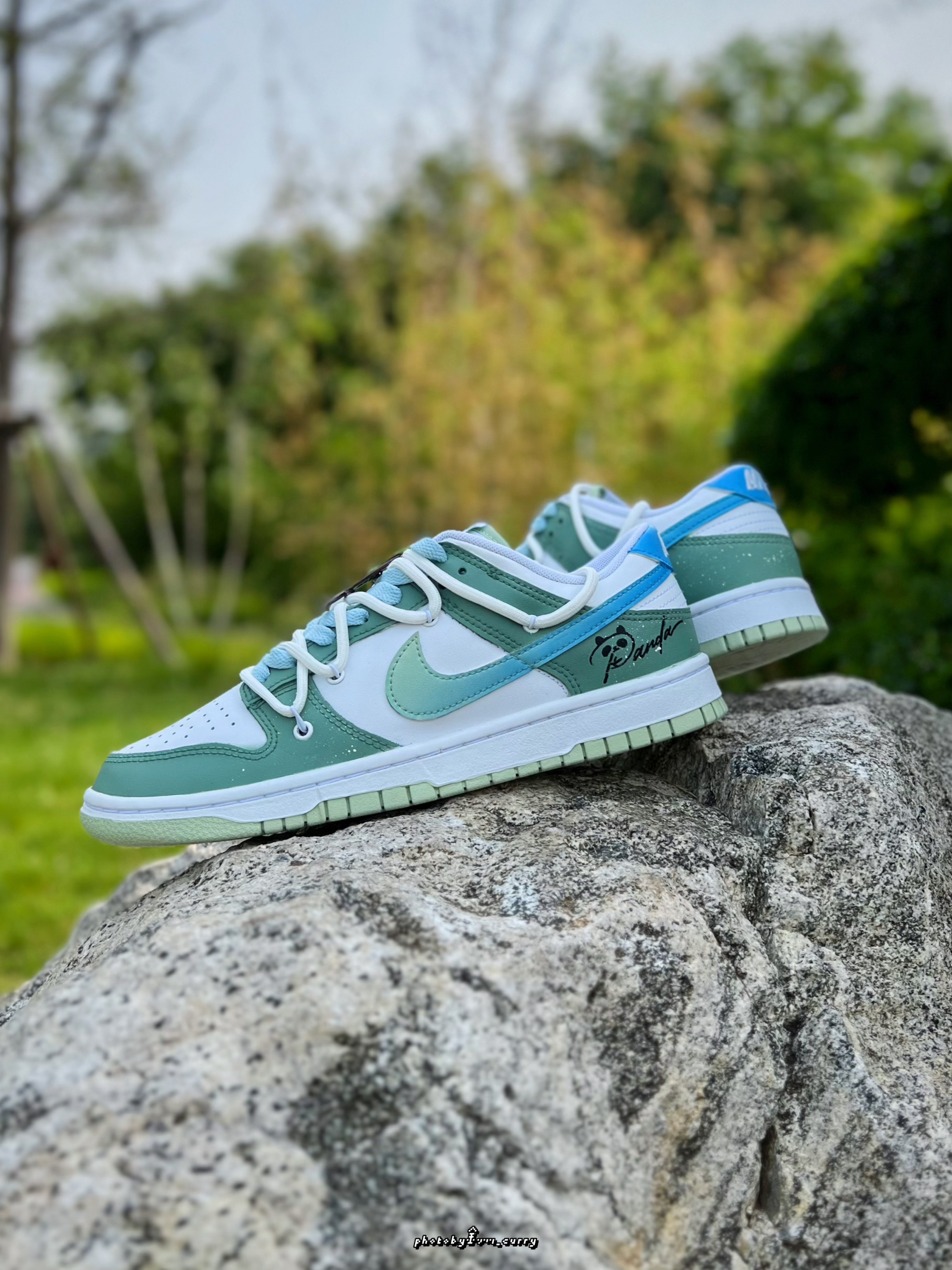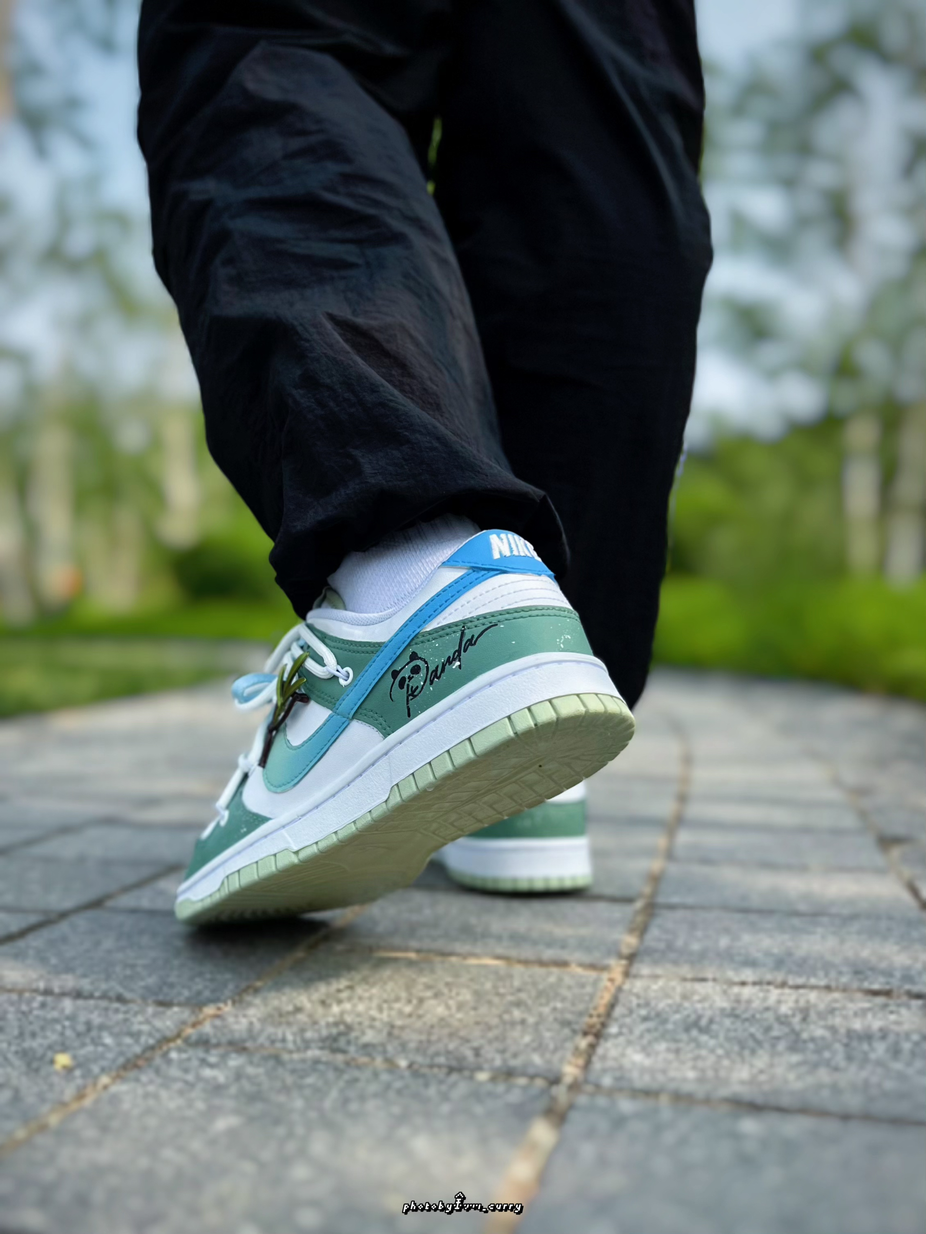 对于炎热的夏天 在颜色选择上当然要清爽一点☝️ 分享这款定制版的Dunk Low竹叶熊猫🐼 白绿的鞋身上面还加入了一点泼墨点缀 侧面的Swoosh也是渐变效果呈现 从绿到蓝,清爽感十足😆 后跟小熊猫细节,也算是呼应这个主题了 有意思的是侧面还带有一个竹子细节的小挂件!可随心DIY哦✌️ 双层鞋带设计,清新蓝+米白色 也太适合夏天了吧! 搭配长裤短裤真的不要太帅好吧~