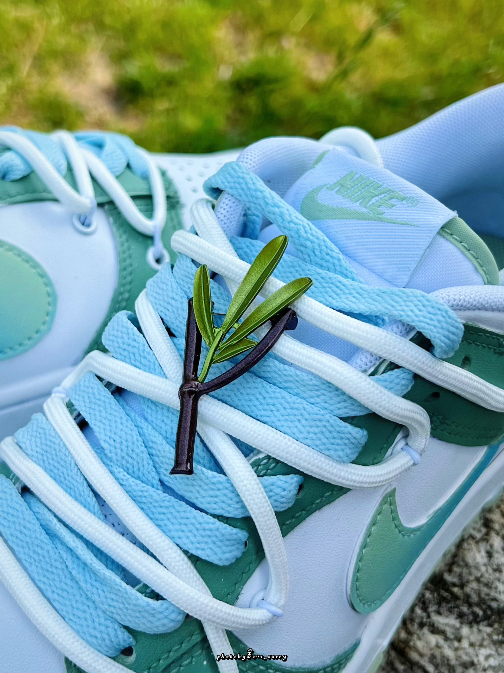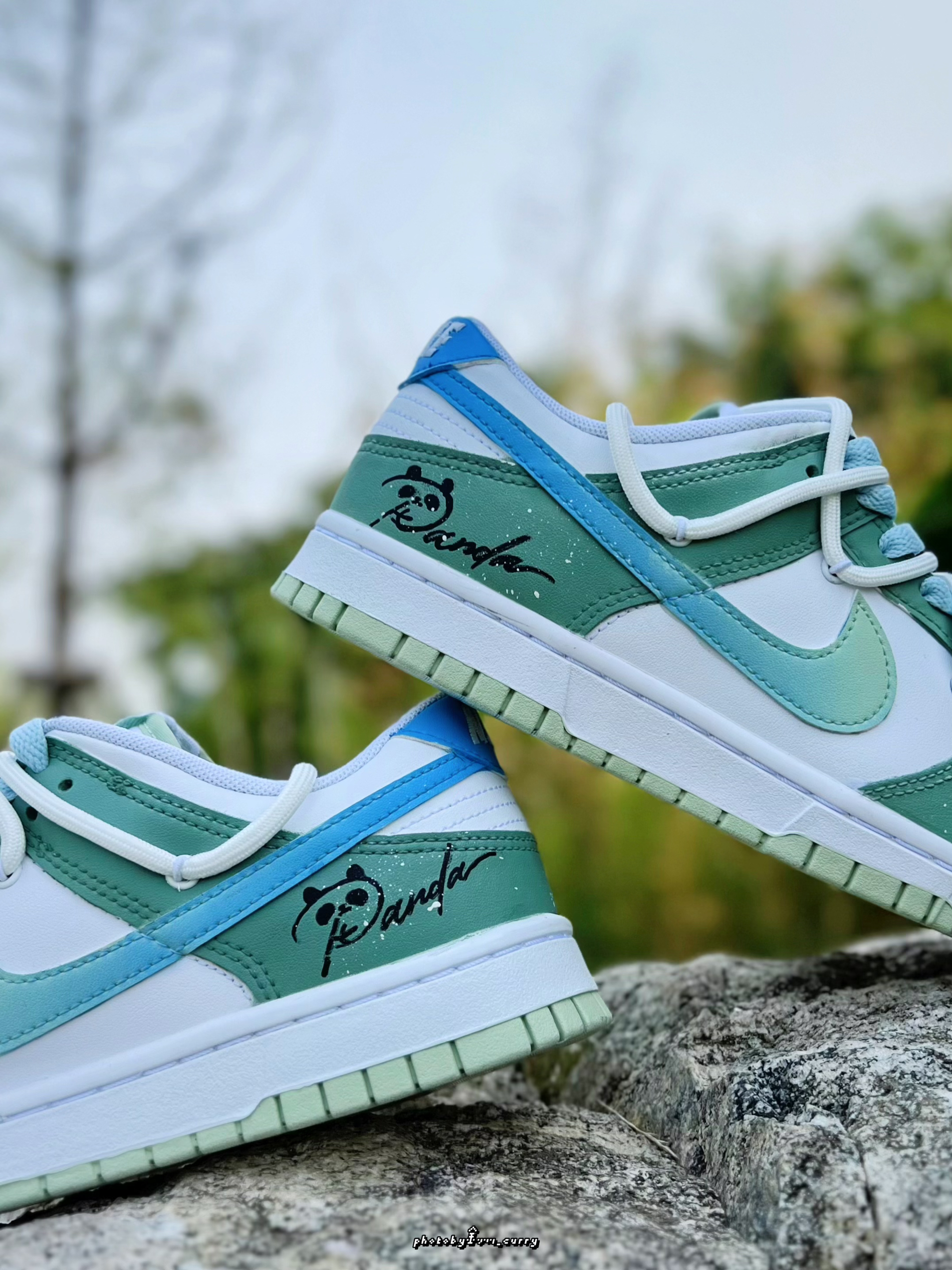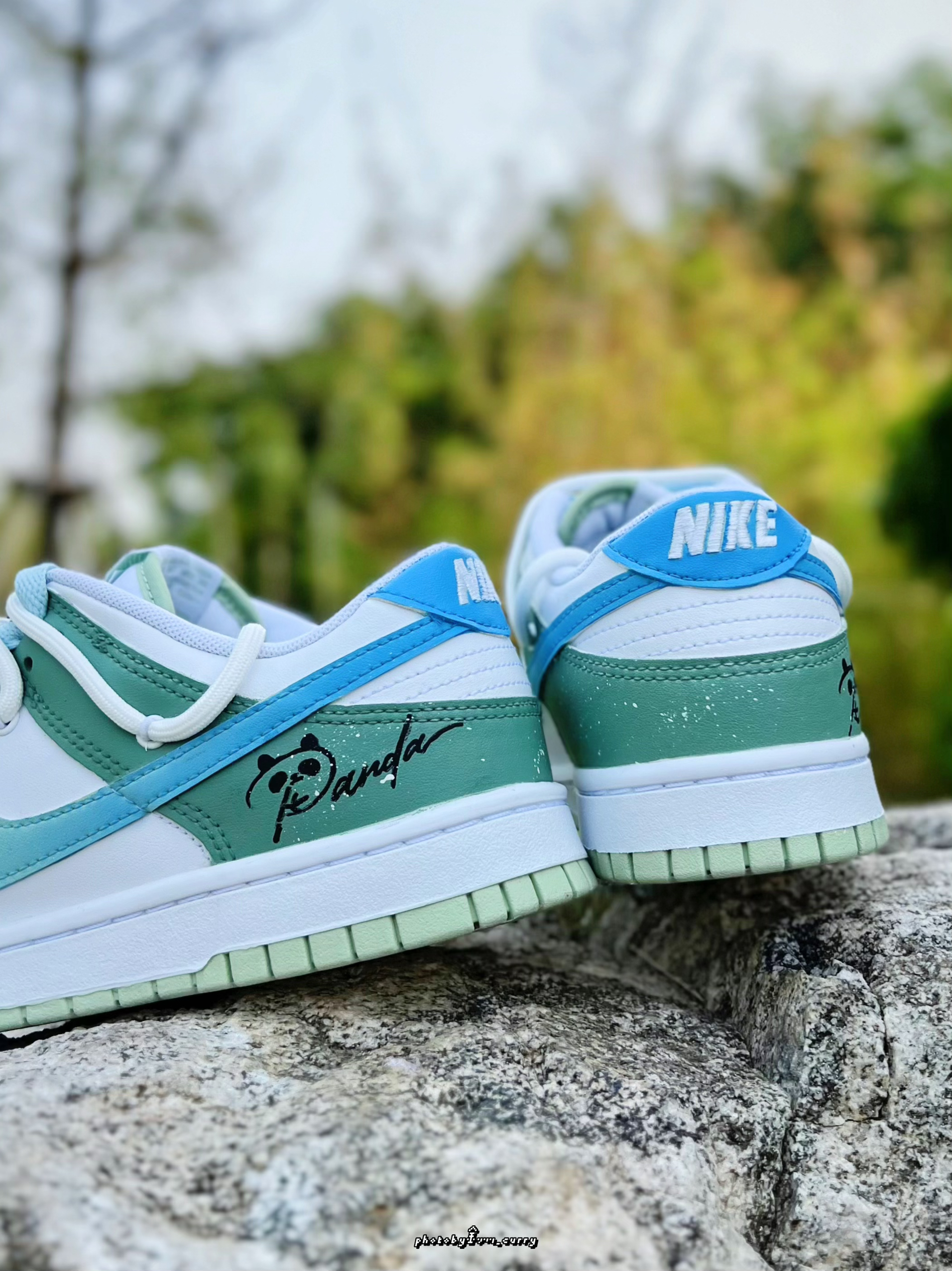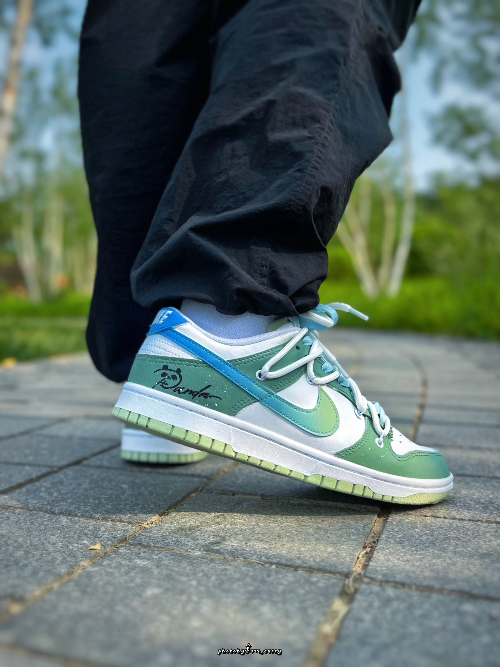 对于炎热的夏天 在颜色选择上当然要清爽一点☝️ 分享这款定制版的Dunk Low竹叶熊猫🐼 白绿的鞋身上面还加入了一点泼墨点缀 侧面的Swoosh也是渐变效果呈现 从绿到蓝,清爽感十足😆 后跟小熊猫细节,也算是呼应这个主题了 有意思的是侧面还带有一个竹子细节的小挂件!可随心DIY哦✌️ 双层鞋带设计,清新蓝+米白色 也太适合夏天了吧! 搭配长裤短裤真的不要太帅好吧~