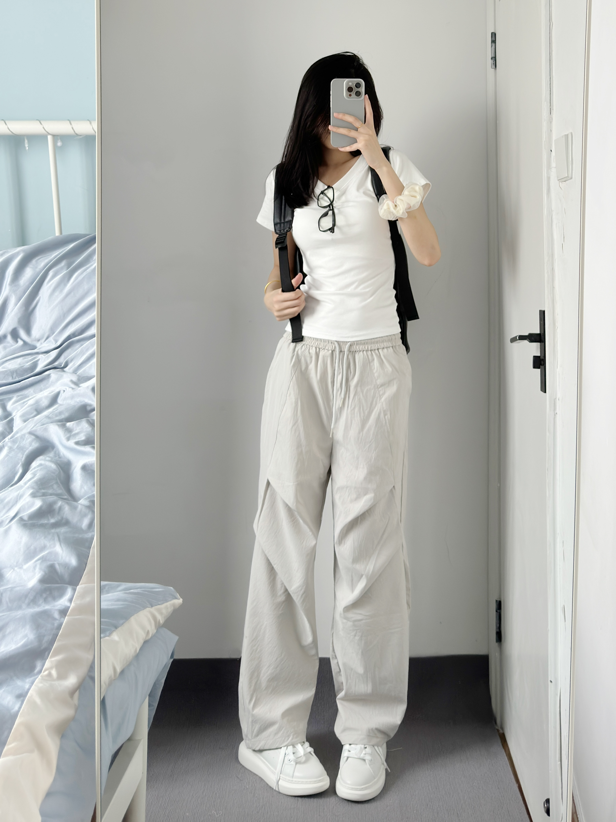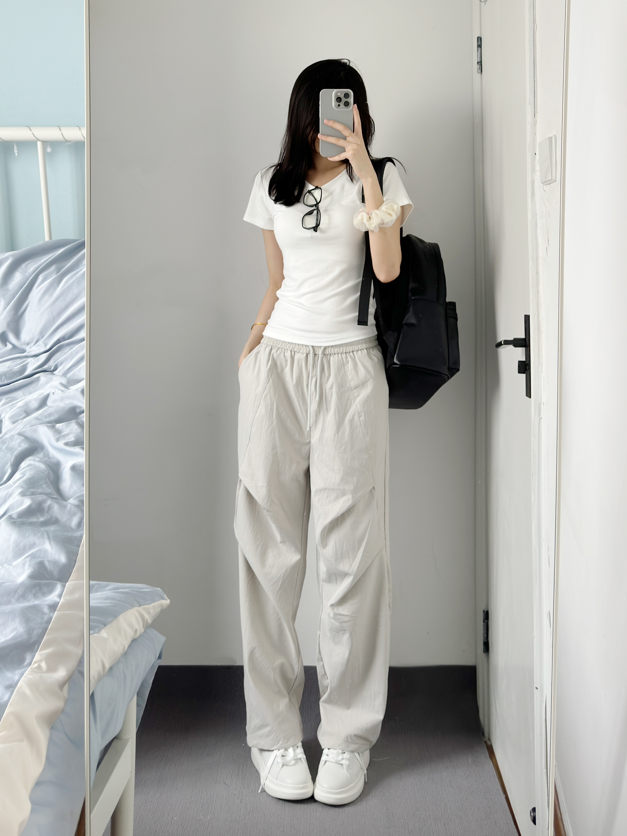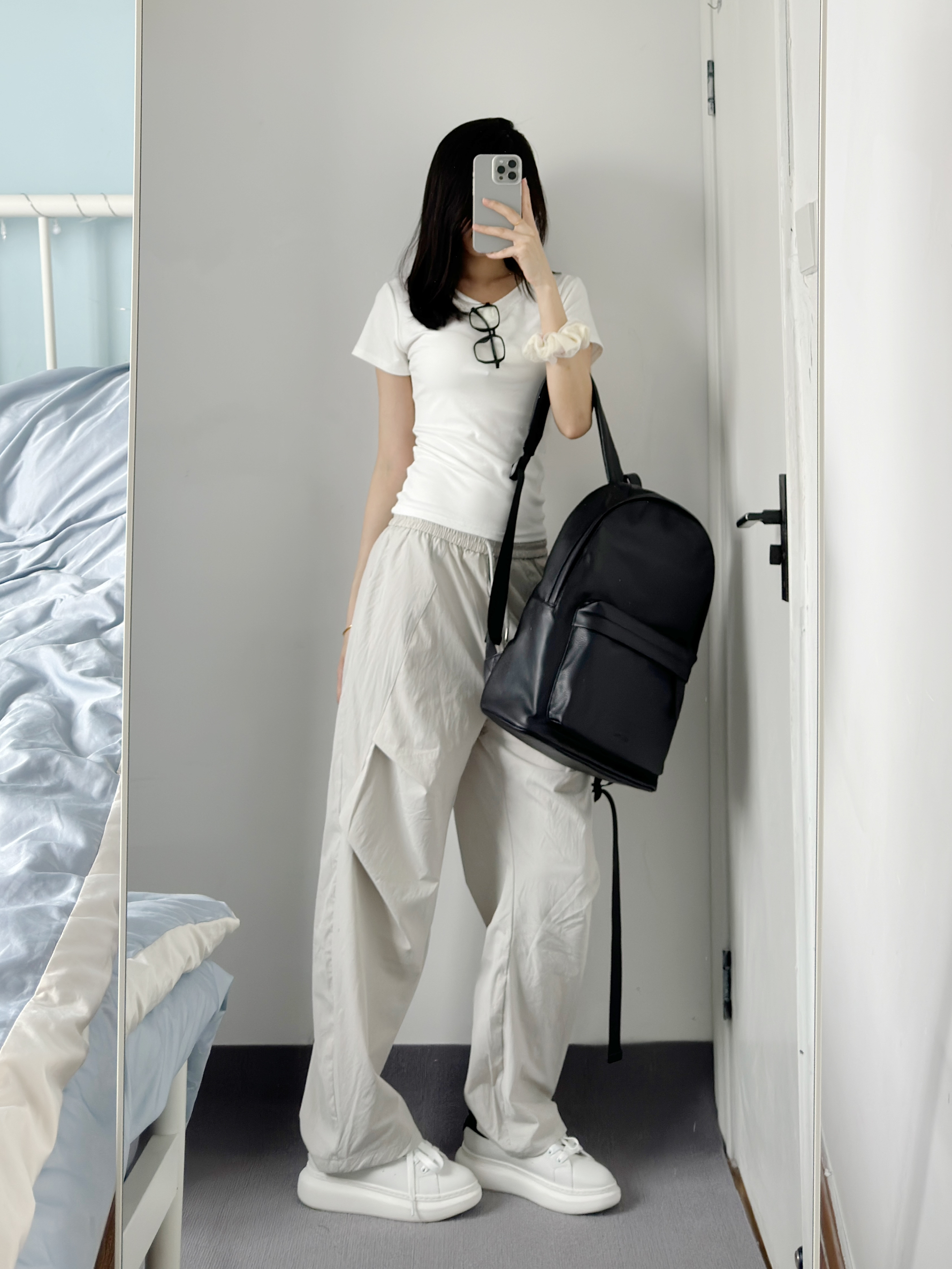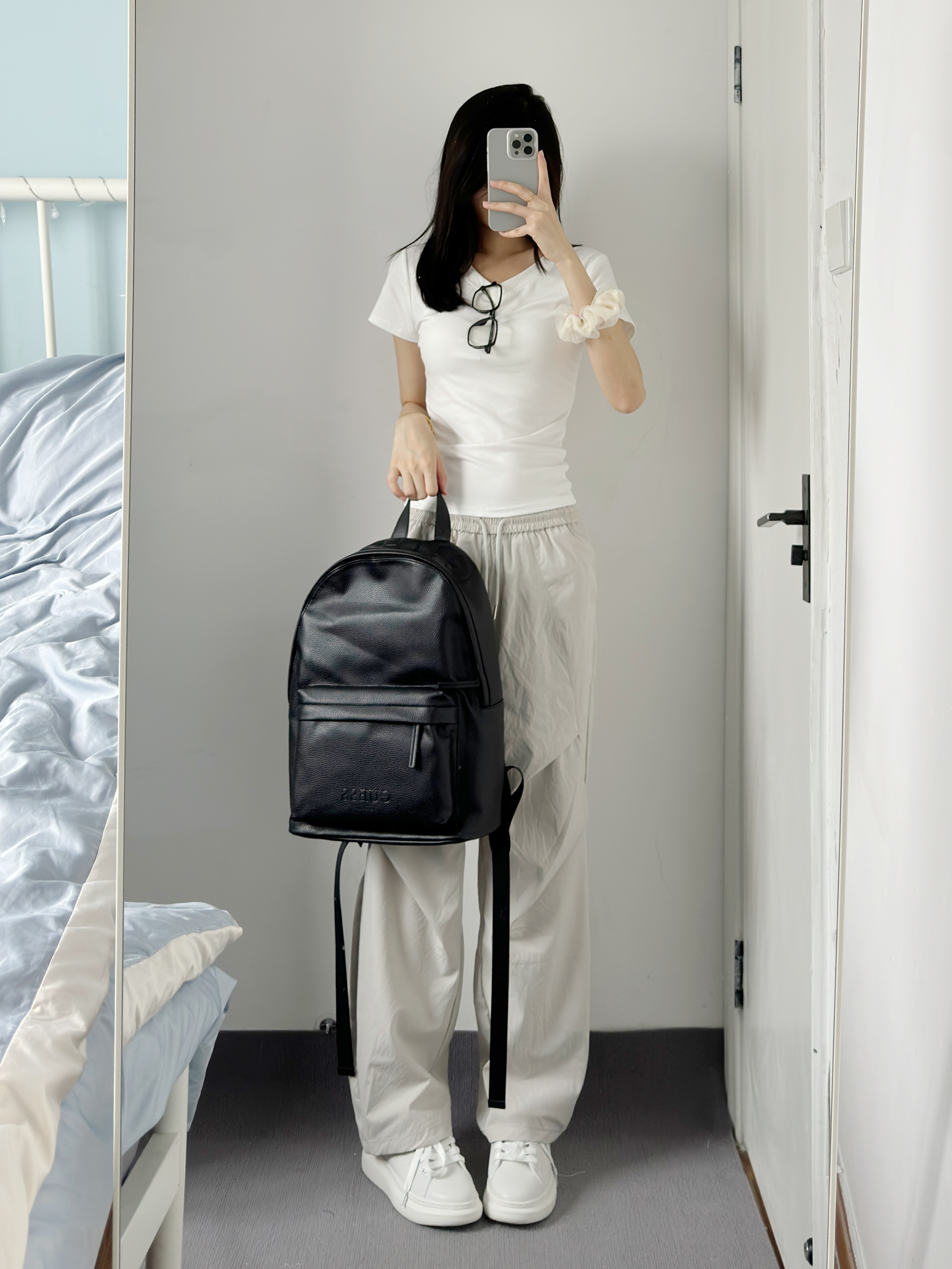 白色短t搭配工装裤也太帅了吧 再搭配上我滴新书包~ 黑色简约又高级 皮质质感很好 容量真的好大 太适合早八和上班族了 黑色也不怕脏 可以放心造✌️