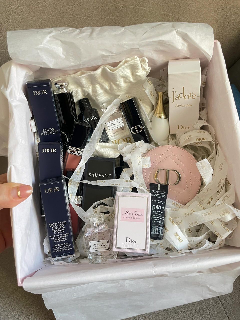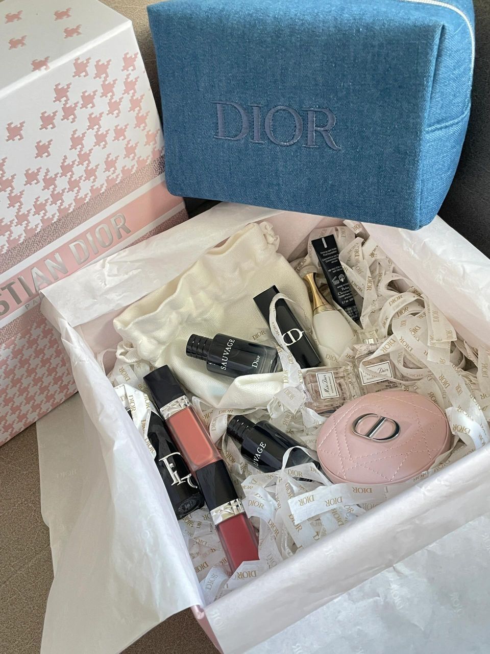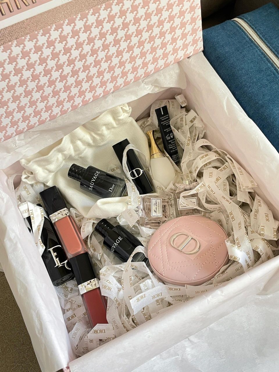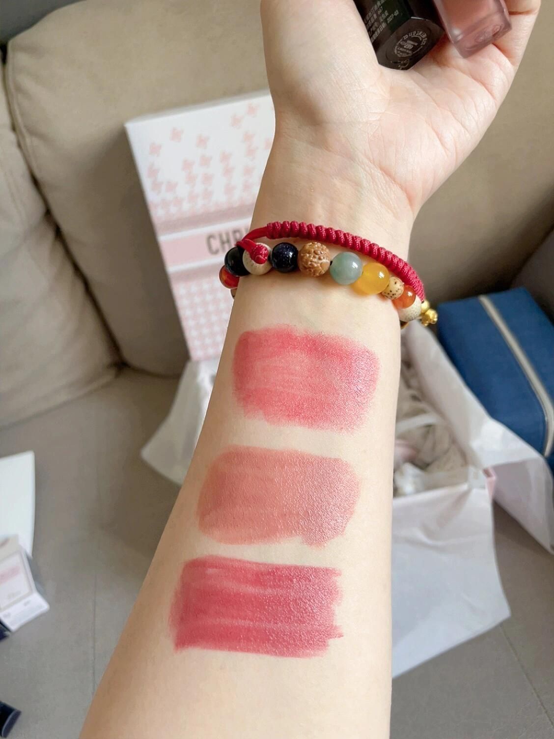 就买了三支口红 魅惑667 锁色100 558(试色如图) 其他都是送的! 哪还分得清正装和赠品嘛 又是买椟还珠的一天呐! 送了q香5个 口红中样1支 粉底小样1个 化妆包1个 镜子1个 镜子质感沉甸甸的 好爱好爱 还有不得不说 唇釉是真的不沾杯!! 卸了好久才卸下去!! 还有粉色千鸟格包装也深得我心 人真的会反复爱上dior呀!好开心🥳