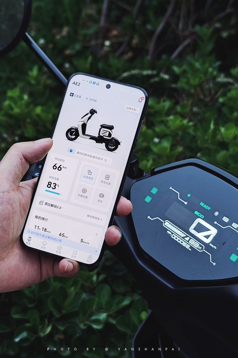 其次,极核AE2不止外观有科技感,日常使用起来科技感也很足。不仅可以再手机APP上进行各种设置,查看全面的信息,还支持感应解锁,就跟问界M9的感应解锁一样。只要绑定手机后,走的AE2附近,它就能自动解锁,不用每次都带车钥匙。只要带着手机,下楼之后想开M9就开M9,想开骑AE2就骑AE2,确实方便。