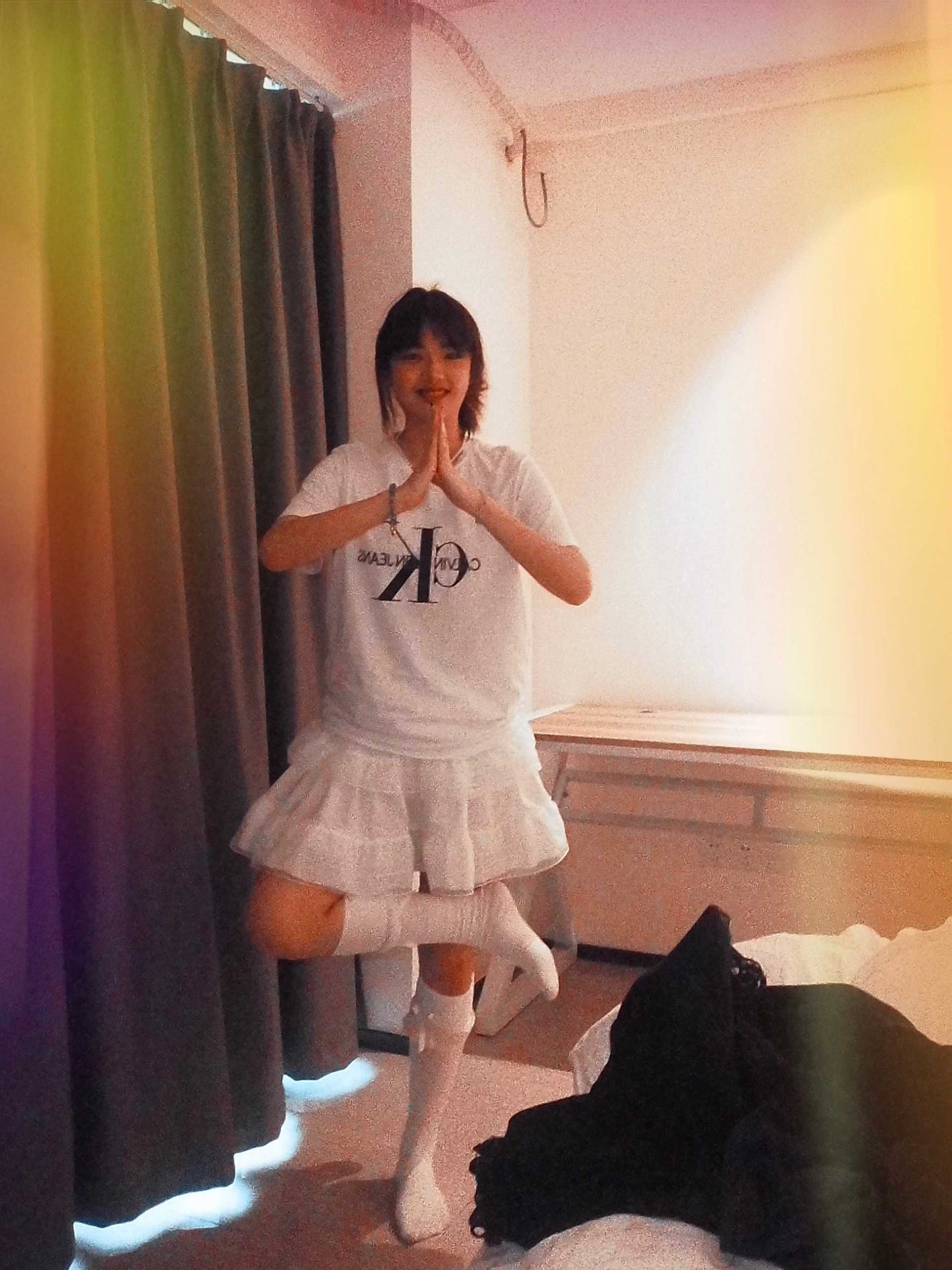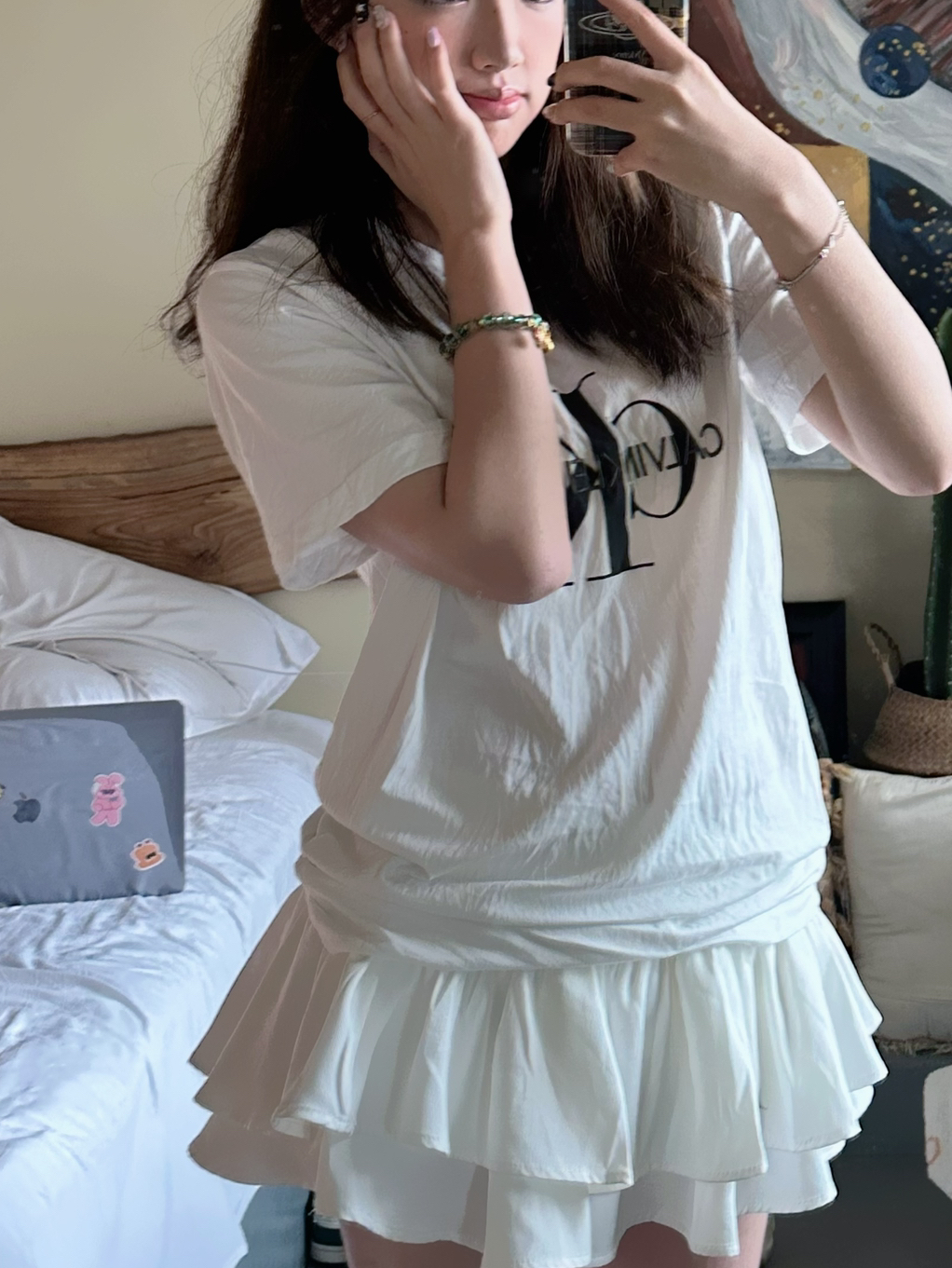 身高|体重:168/120 🧍♂️ 穿搭风格:很随意很简约的风格 👔 上衣:ck白t 👖 下装:白色蓬蓬裙