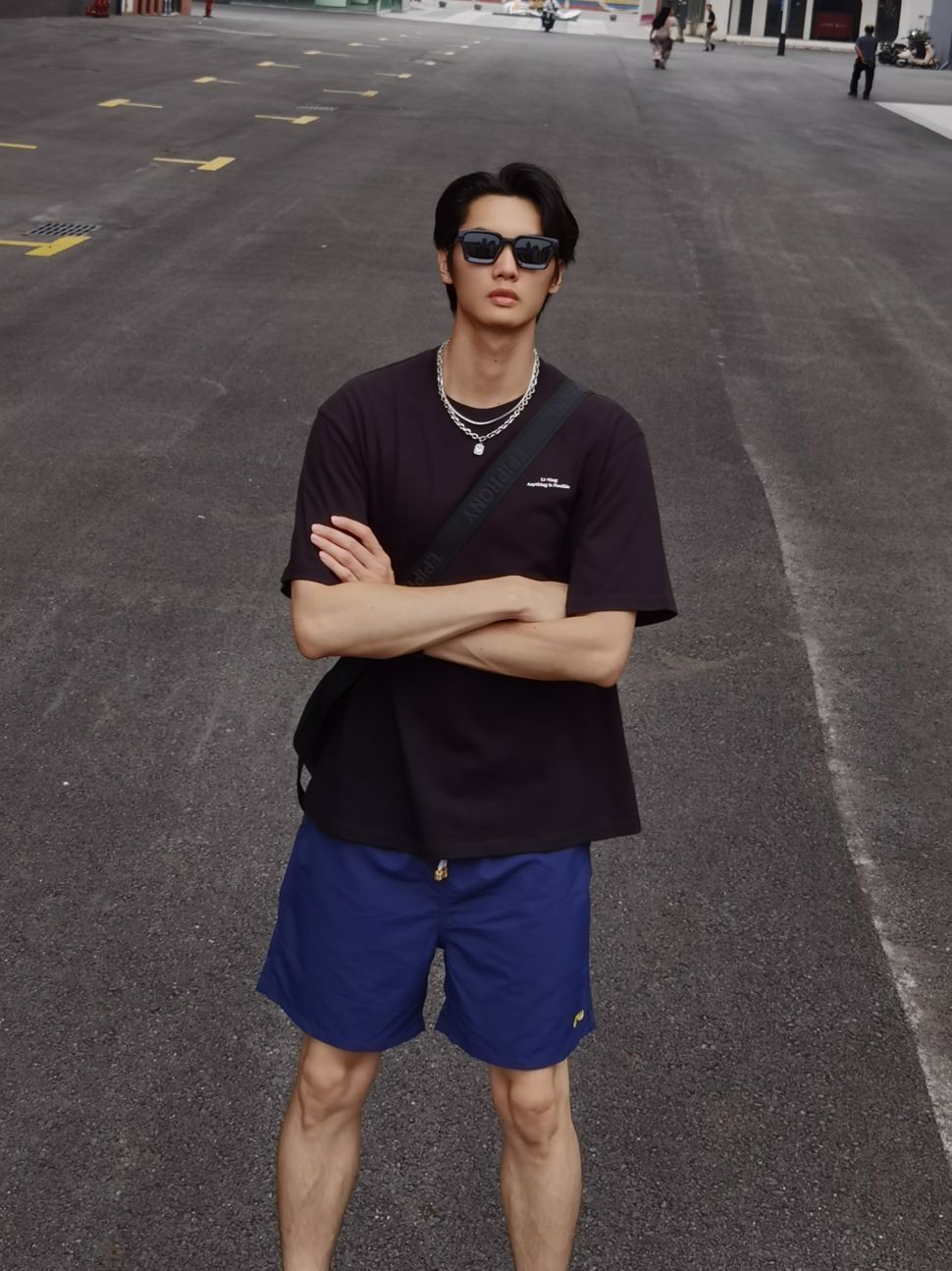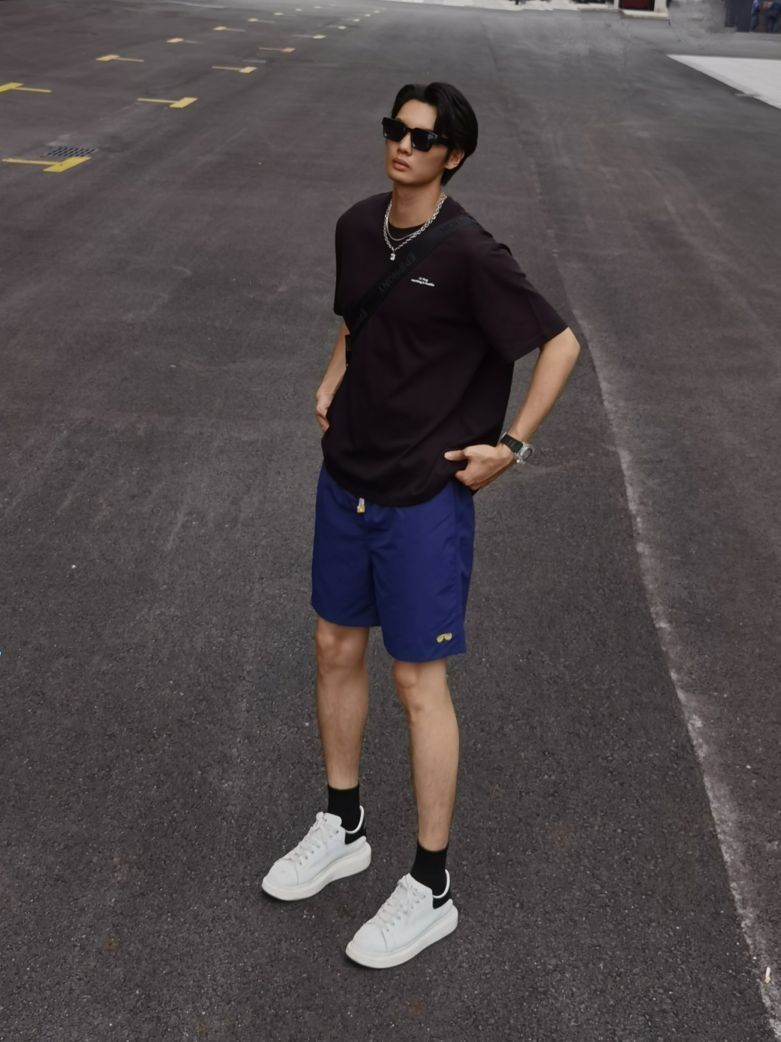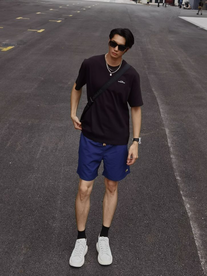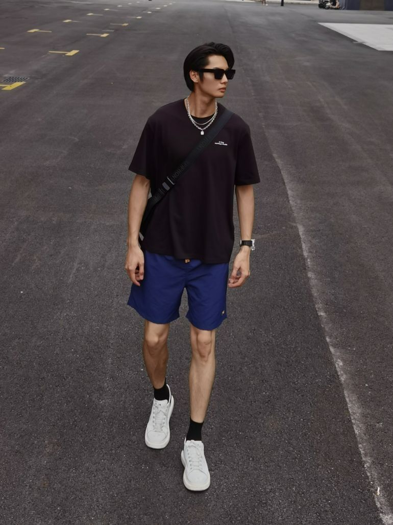 酷飒的夏日明星感造型分享给大家 火辣辣的夏天马上就要到咯 型男穿搭赶紧安排起来 上衣选择李宁黑色T恤搭配项链 裤子选择蓝色沙滩裤🏖夏天出门穿真的太酥服了~ 最后再戴上一个酷酷的黑框墨镜😎