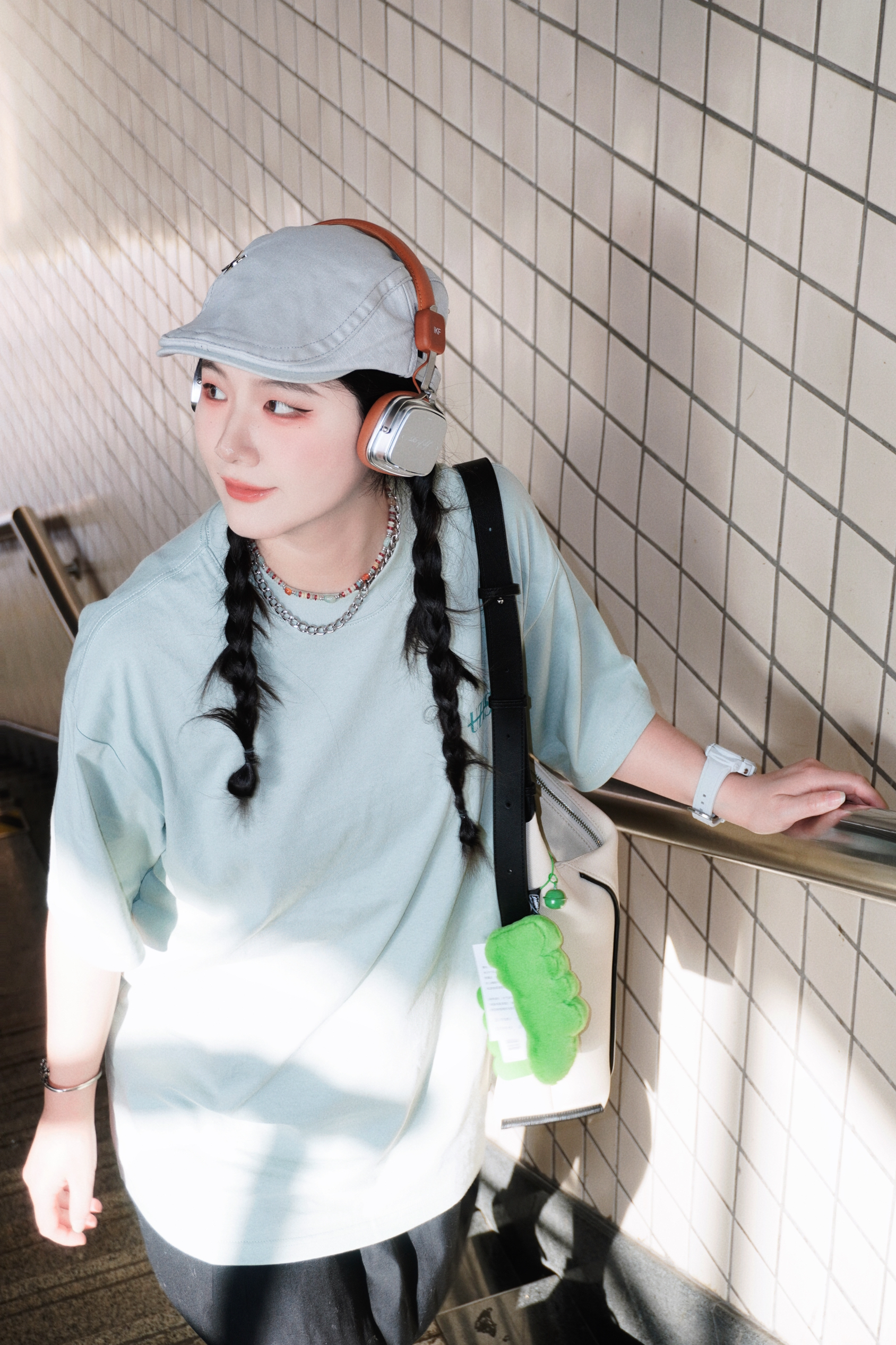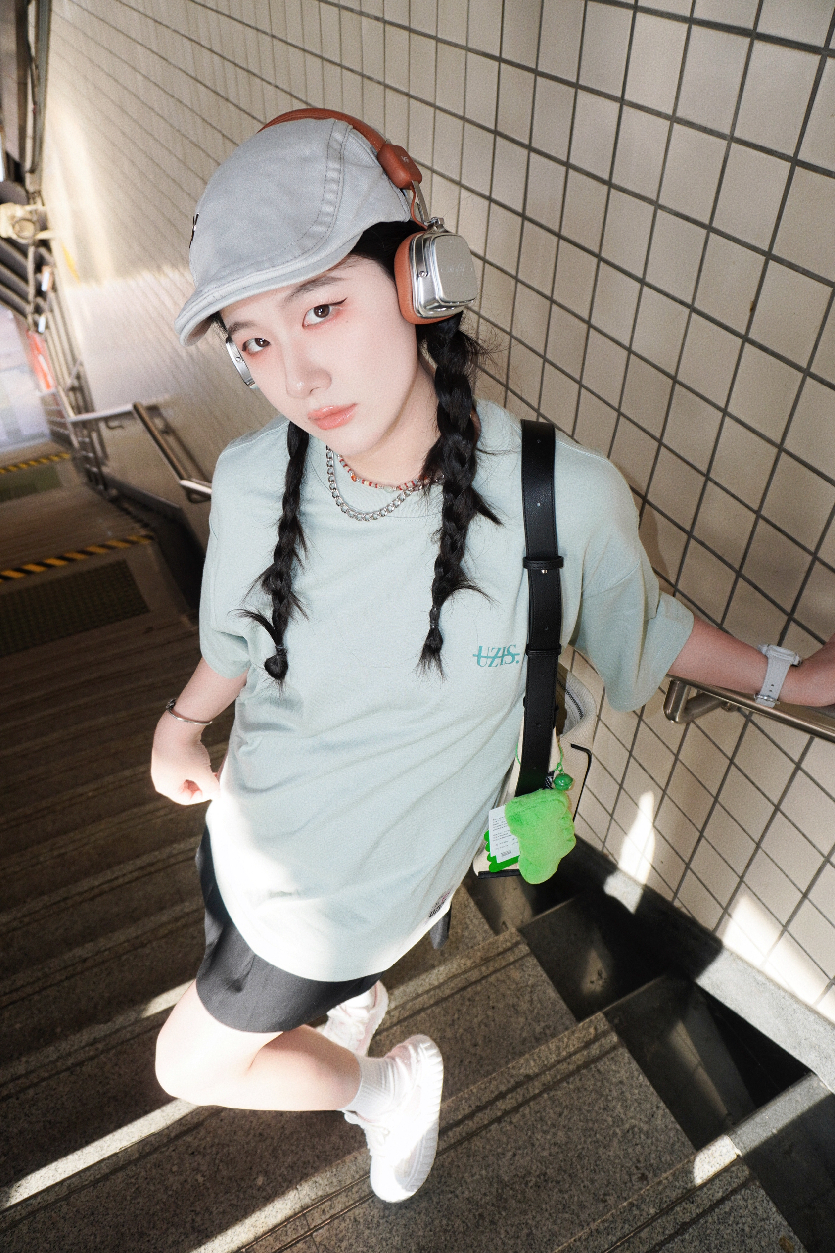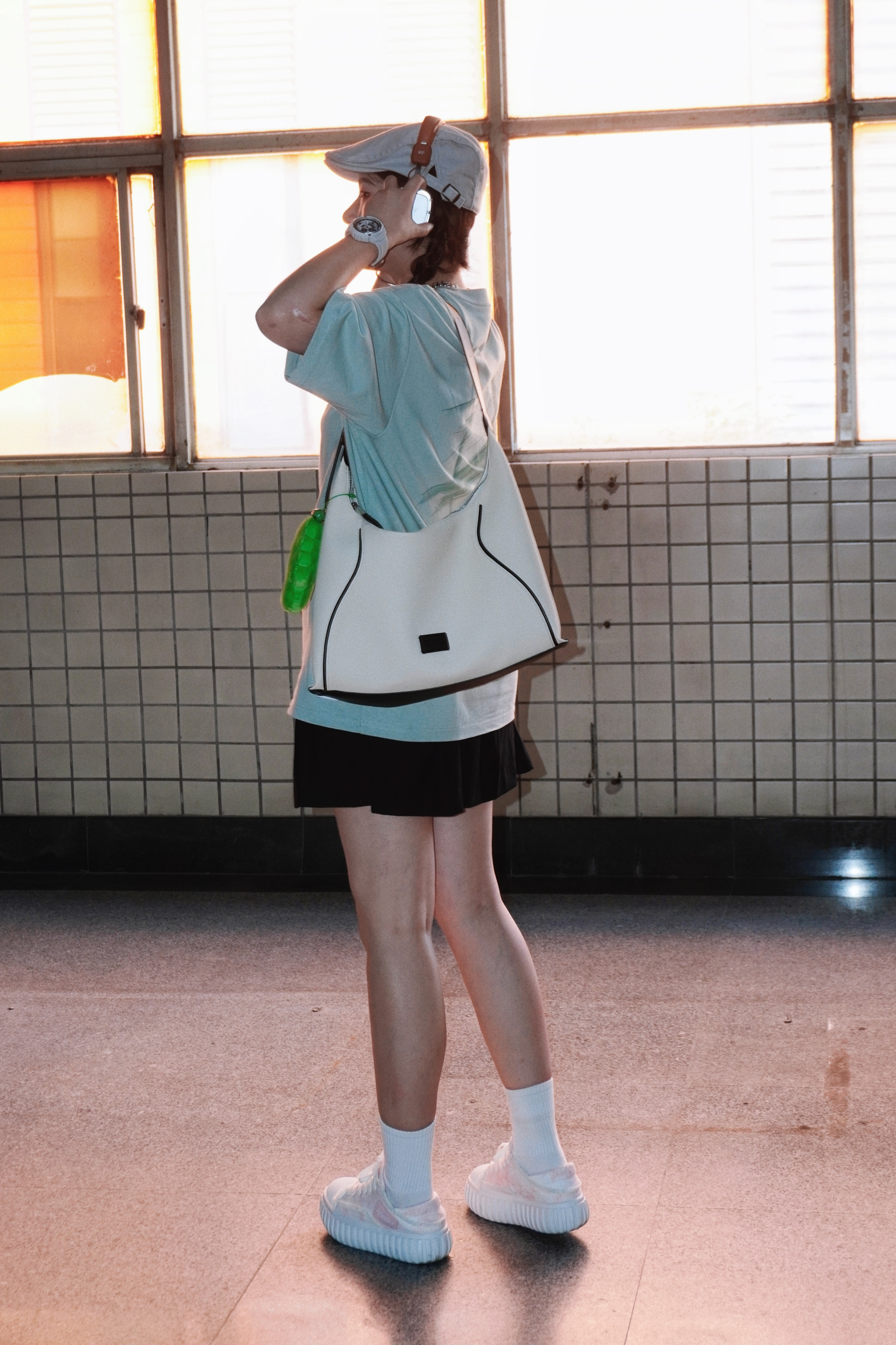 清新薄荷绿的短袖真的太夏日啦🍃 光是看着都觉得非常凉爽 搭配了黑色的百褶裙 再来一顶报童帽和头戴式的耳机🎧 看着就是超级的少女感 在街头就很有日系氛围感 搭配了撞色的粉色帆布鞋 毛边的设计也酷酷的呢 ———— 👕: 有志者UZIS 👟: KOMETA.A 🎧: iKF 👜: OMTO
