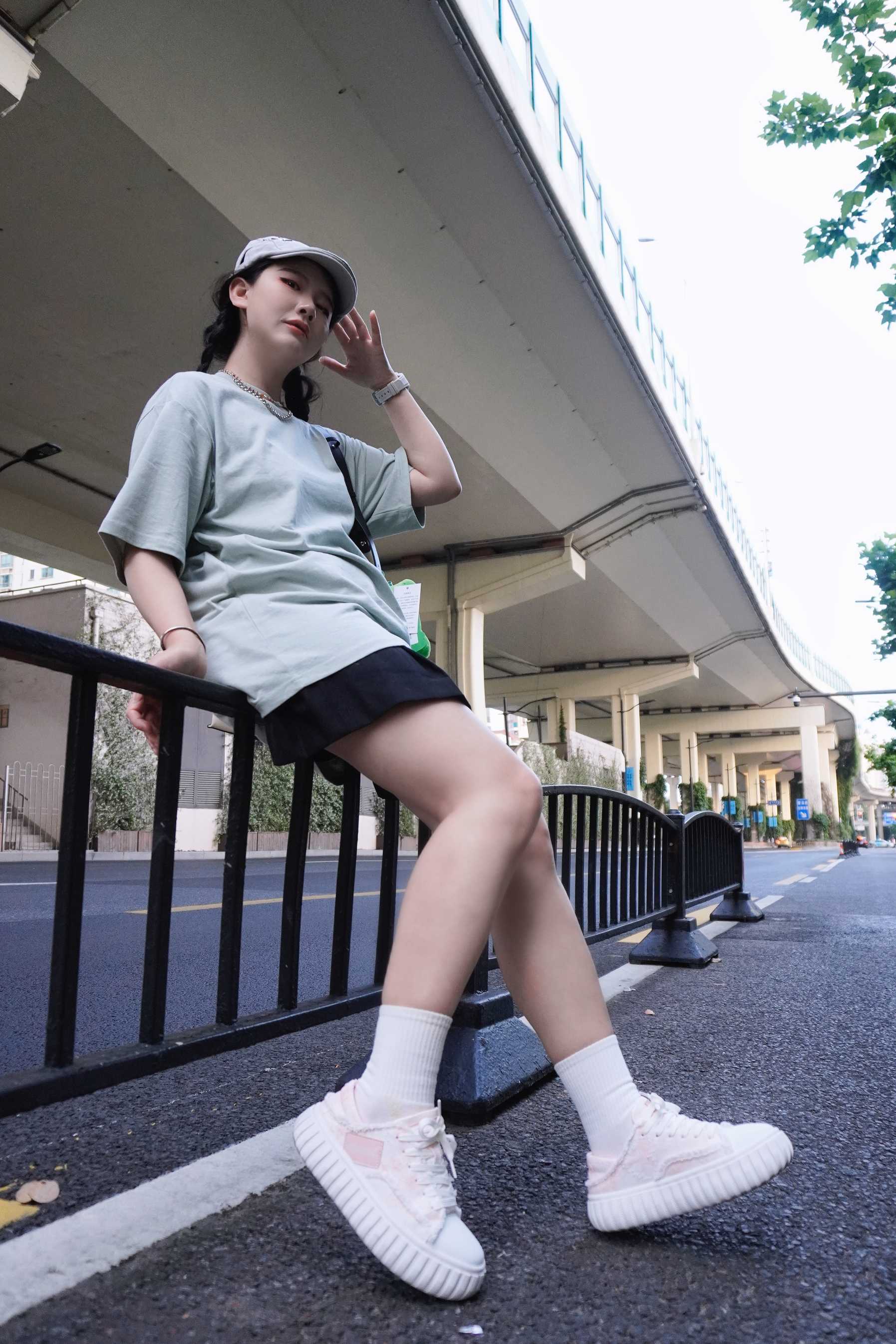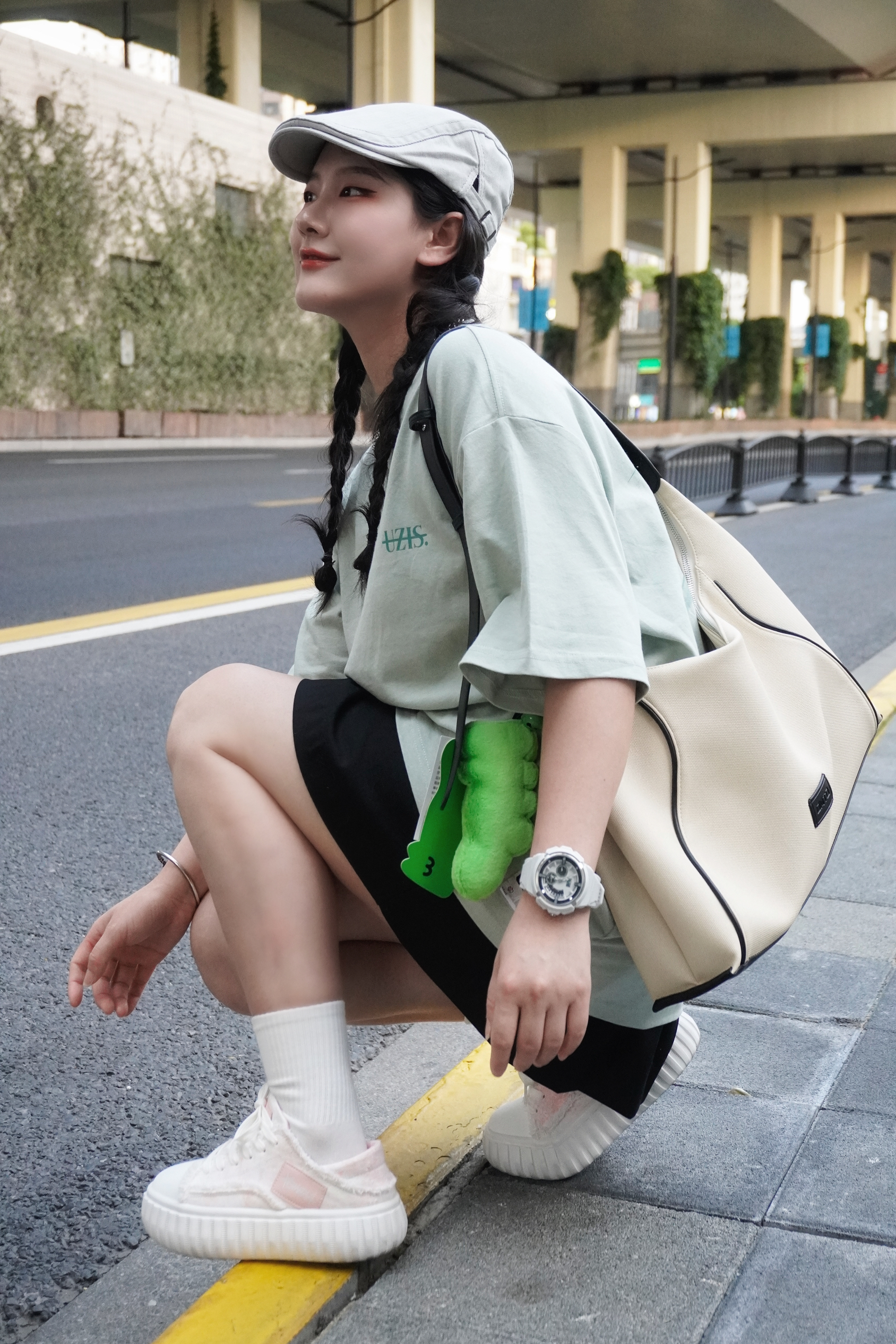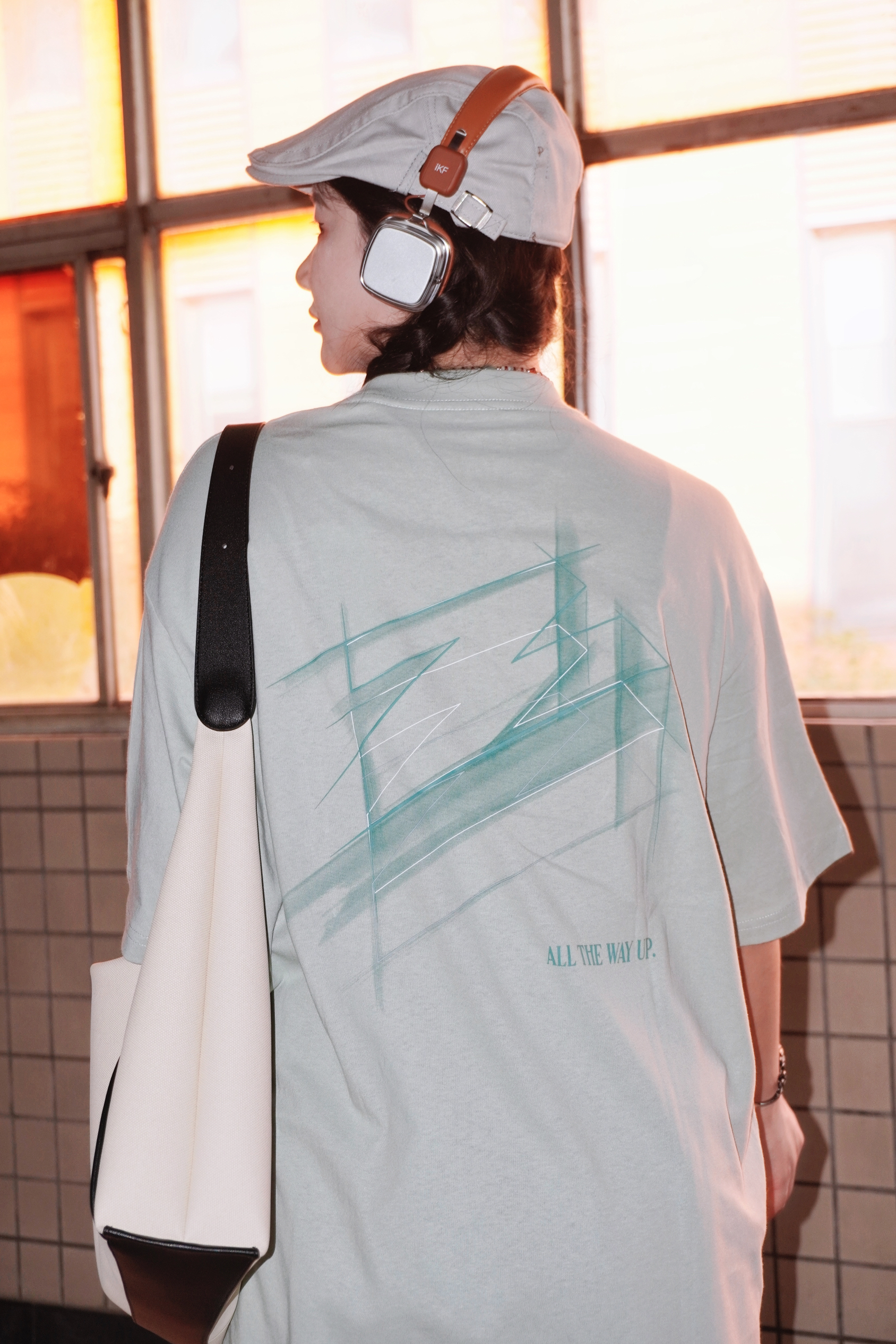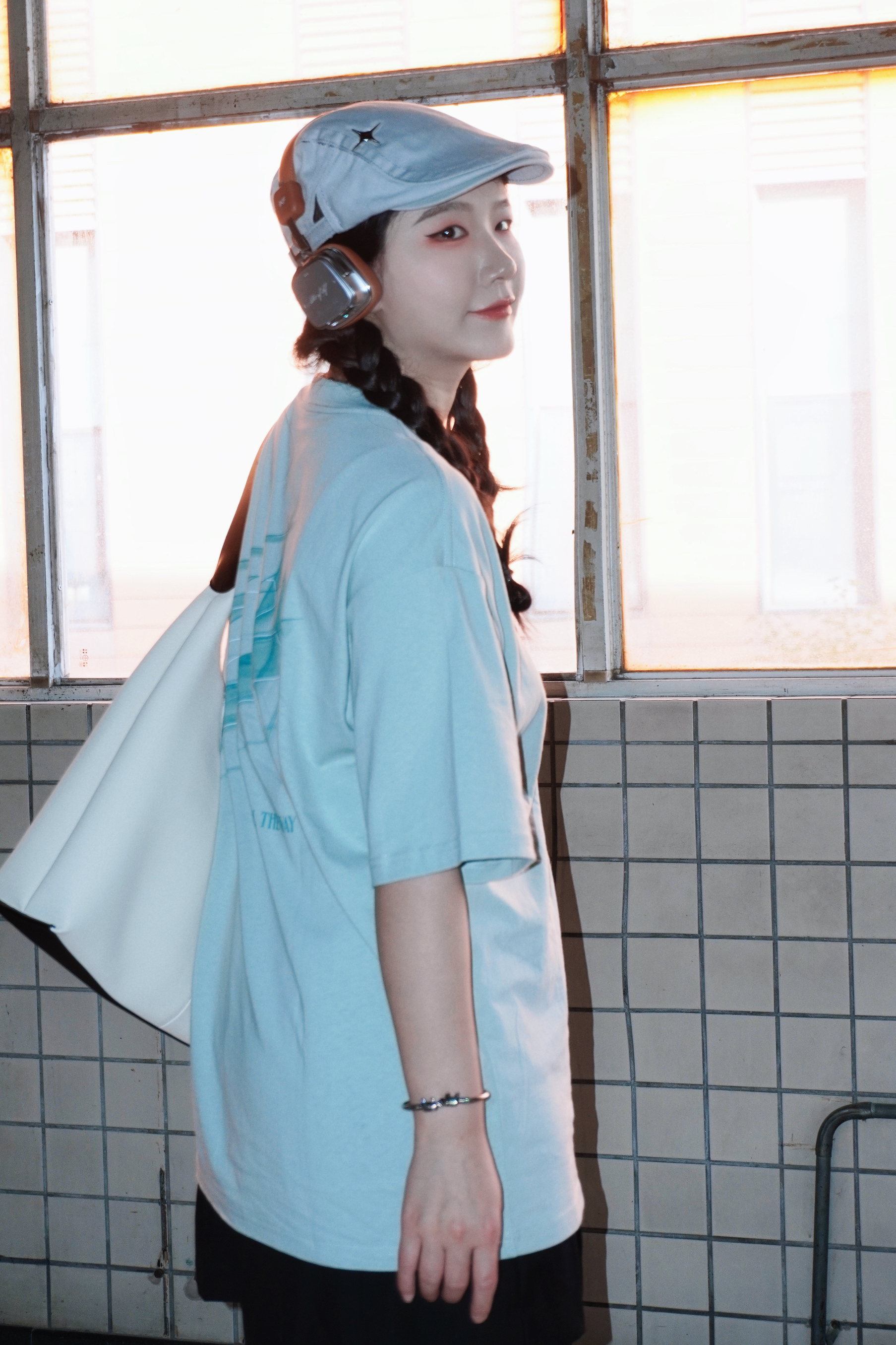 清新薄荷绿的短袖真的太夏日啦🍃 光是看着都觉得非常凉爽 搭配了黑色的百褶裙 再来一顶报童帽和头戴式的耳机🎧 看着就是超级的少女感 在街头就很有日系氛围感 搭配了撞色的粉色帆布鞋 毛边的设计也酷酷的呢 ———— 👕: 有志者UZIS 👟: KOMETA.A 🎧: iKF 👜: OMTO