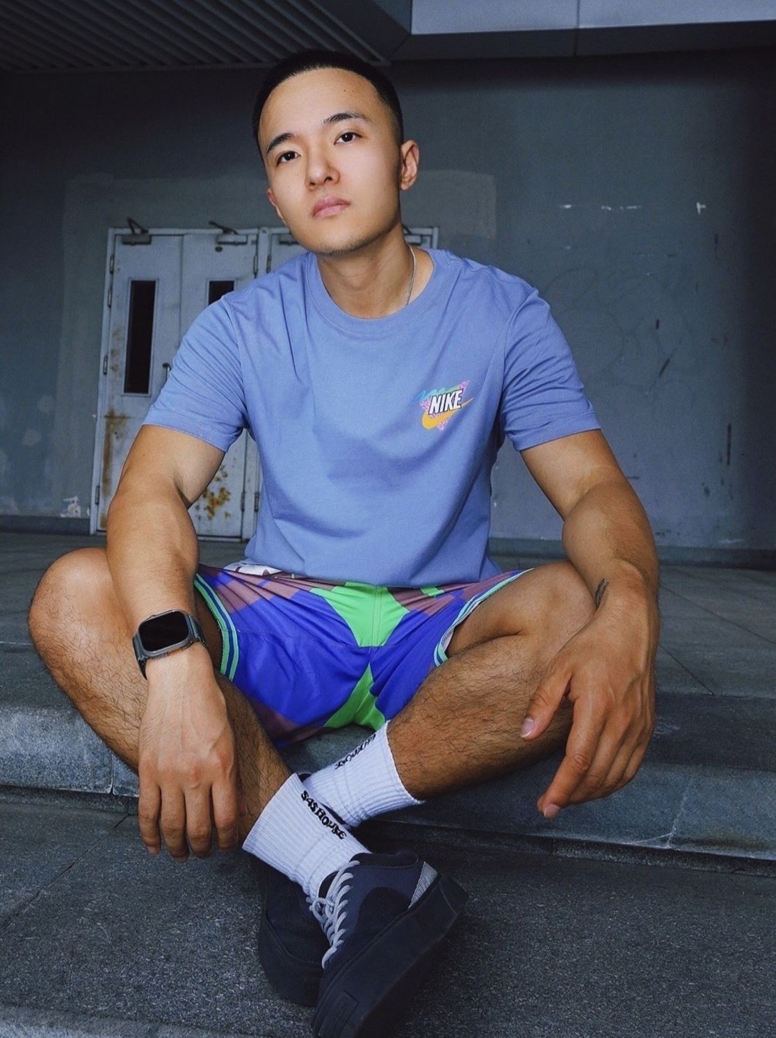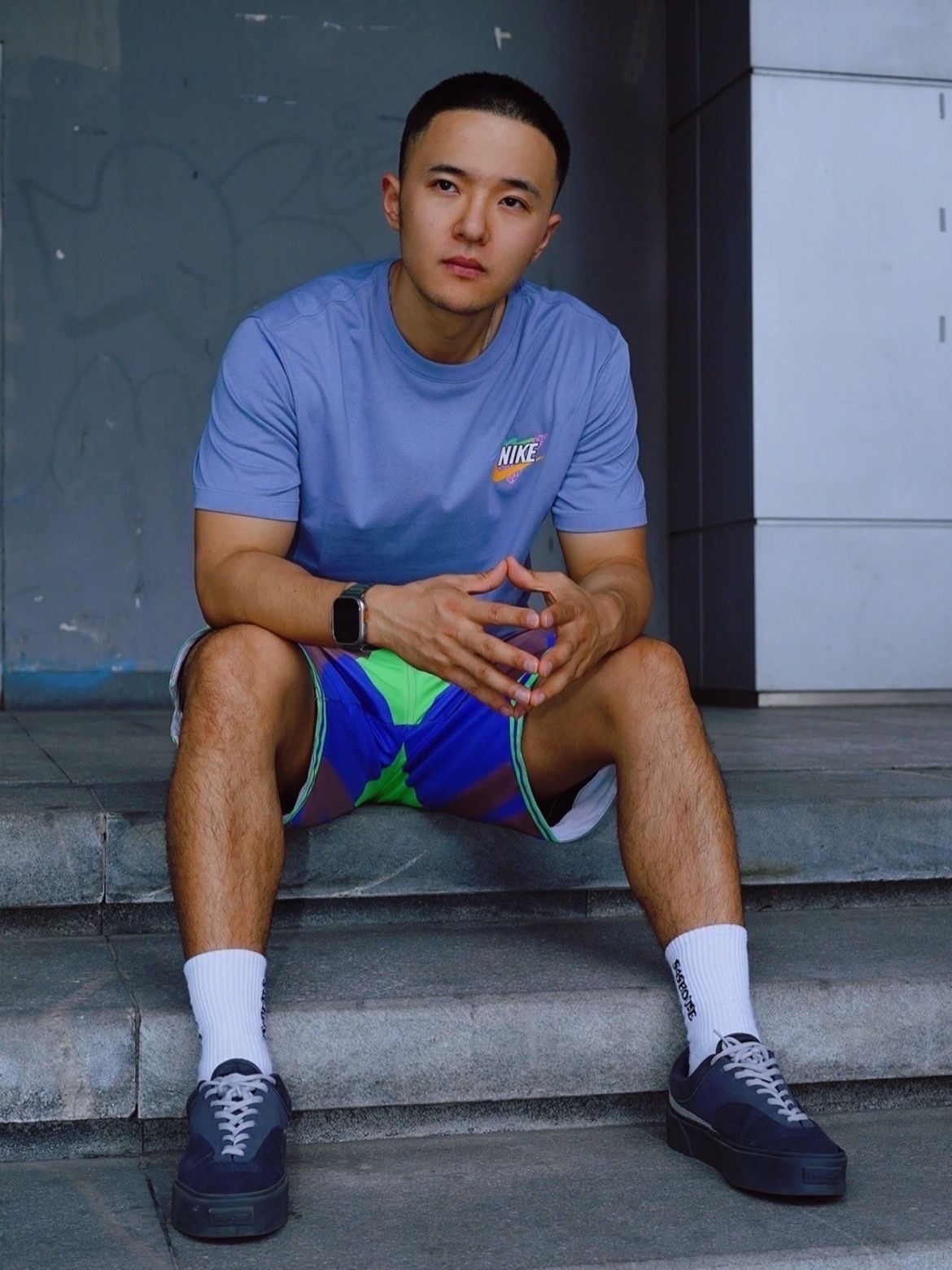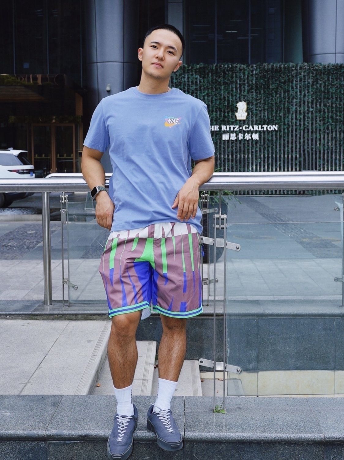 🌈T恤采用了雾霾蓝作为底色,加入图案印花元素,比较百搭的一款T恤。面料非常亲肤,这款T恤的面料是非常柔软的棉,透气性舒适性都非常棒。 🌈短裤裤型比较立体,穿起来不会非常跨,夏天穿起来非常多巴胺,是非常阳光的颜色。 (图片来自博主:闪电papa)