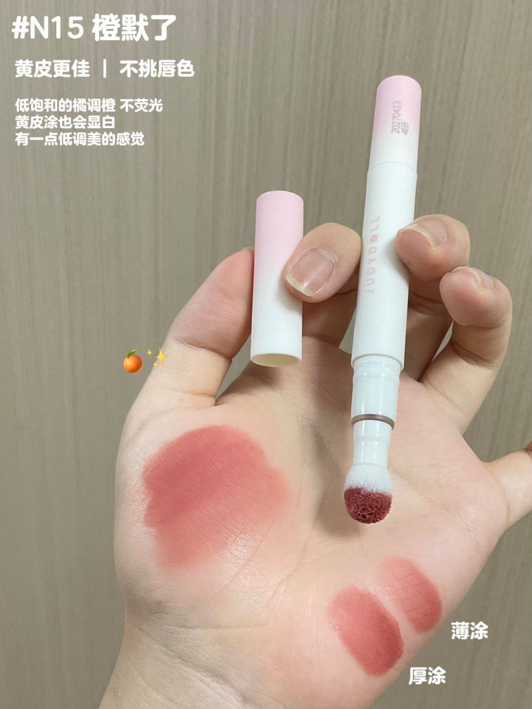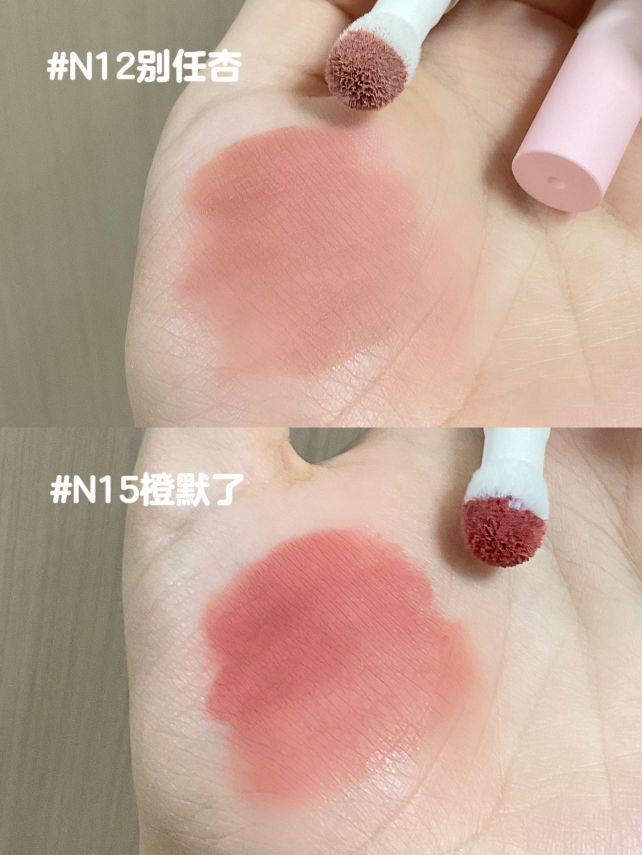橘朵你小子调色师不休息是吧 唇粉霜又整上新色了 很有夏日纯欲氛围感 奶呼呼的敲顺滑 壳子是ins渐变粉 N12别任杏 柔和裸杏色 深唇适合用来打底 日常通勤 用来叠涂也嘎嘎米 N15橙默了 低饱和的橘调橙 一点也不会荧光 带妆会更元气 小毛球刷头设计好方便 解放双手的快乐~