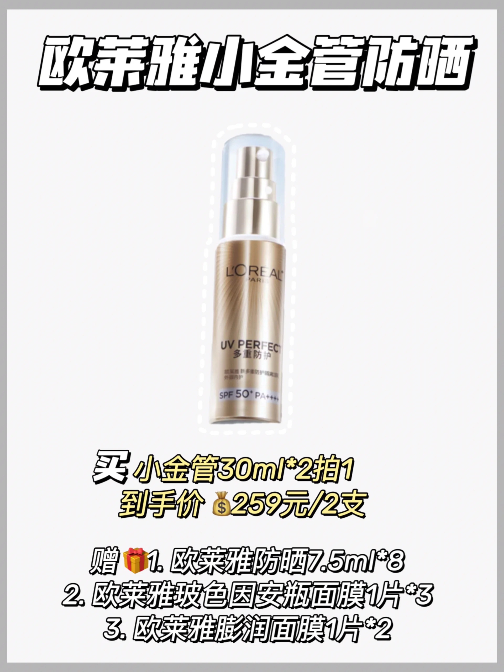 本篇笔记关联了L'OREAL/欧莱雅 小金管防晒露 多重防护高倍清爽 经典版 SPF50+/PA++++、L'OREAL欧莱雅 注白瓶精华液 紧致淡痘印抗氧化祛斑 淡化痘印、L'OREAL/欧莱雅 紫熨斗玻色因眼霜 全脸提拉紧致抗皱淡化黑眼圈水光充盈 【3.0】紧致等商品,为用户提供真实的使用体验和购买参考。