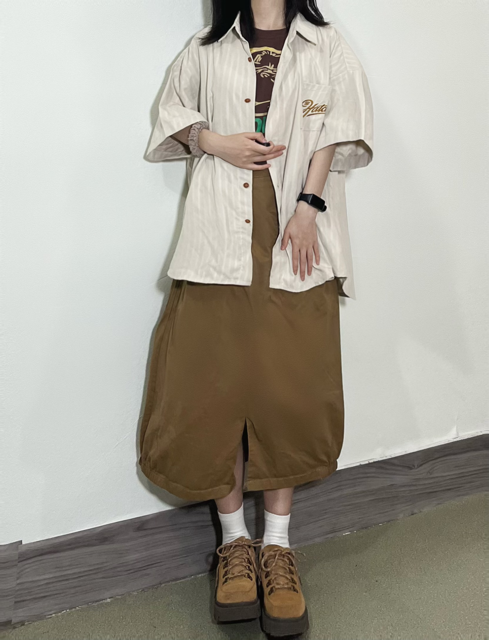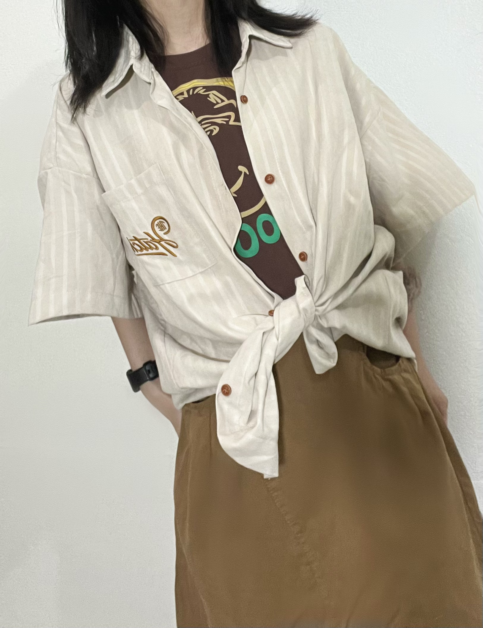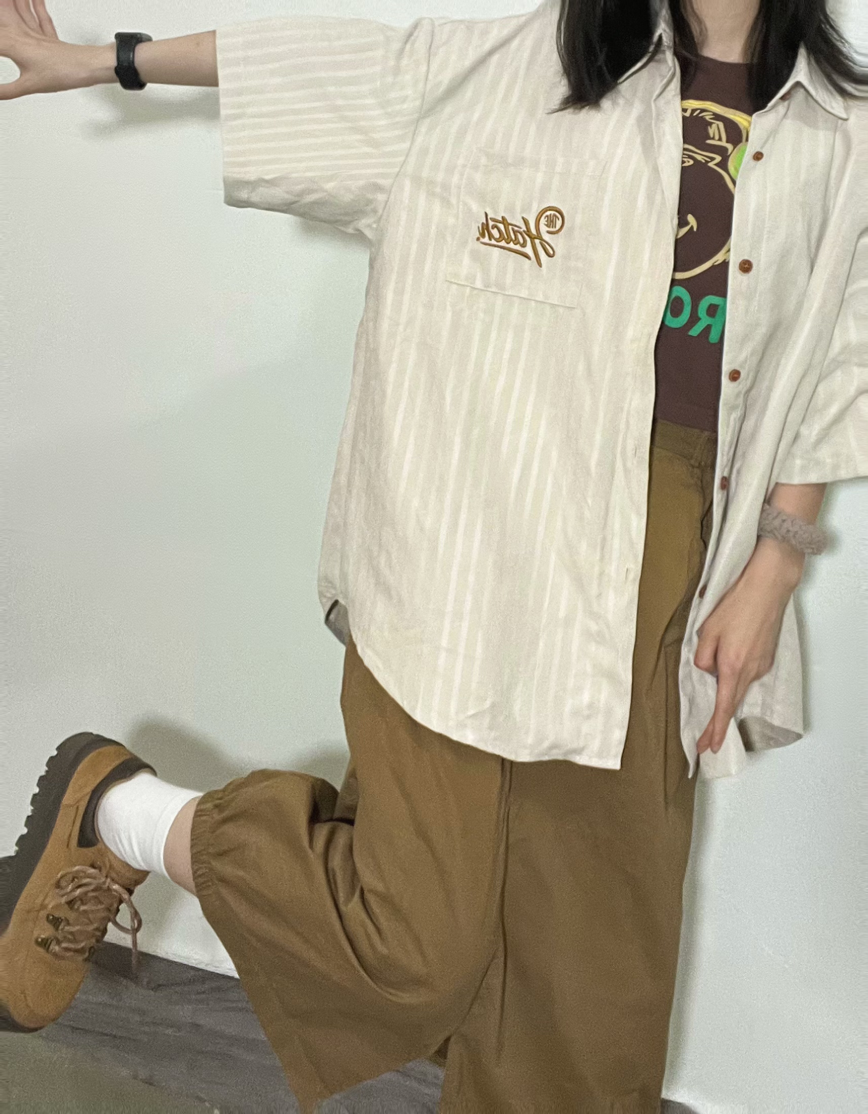 👧156/74 今天主打一个淡黄色系~ 好喜欢这件短袖衬衫,宽松休闲,比较日系的感觉~