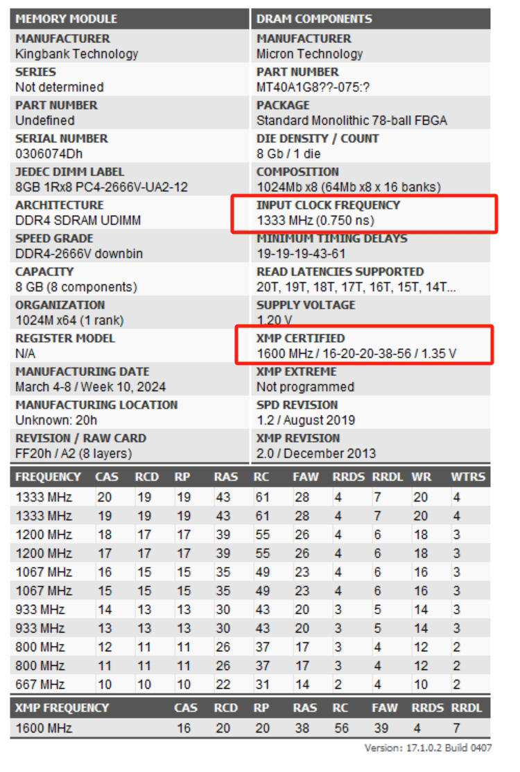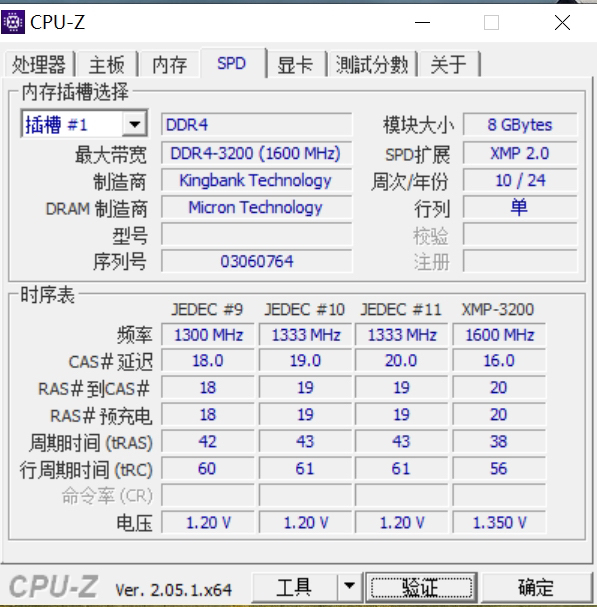老惯例,先使用CPU-Z进行软件测试查看内存信息,可以看到内存条的默认频率为2666MHZ,时序为18-18-18-42,电压为1.2v,XMP频率为3200。