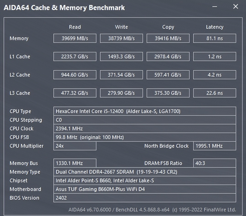 默频2666的情况下先使用aida64软件测试可以看到读取速度为39669MB/s.写入速度为38739MB/s.复制速度可能比较差一点也可以达到39416MB/s,延时时间在81.1ns左右,此时延迟还是较高的,因为我们还没开启XMP,所以第一次装机或更换新内存的朋友安装完内存后一定要记得开启XMP。