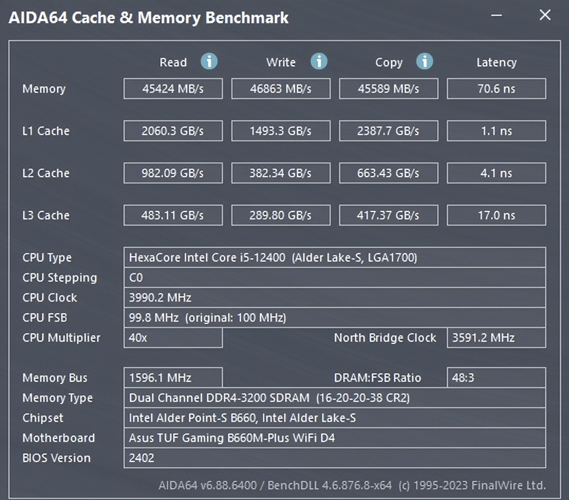 开启XMP后读写都有了不小的提升,读提升到45424MB/s,写46863MB/s,延迟降到了70ns,由此可见这款内存正常开启XMP情况下的速度还是比较快的。