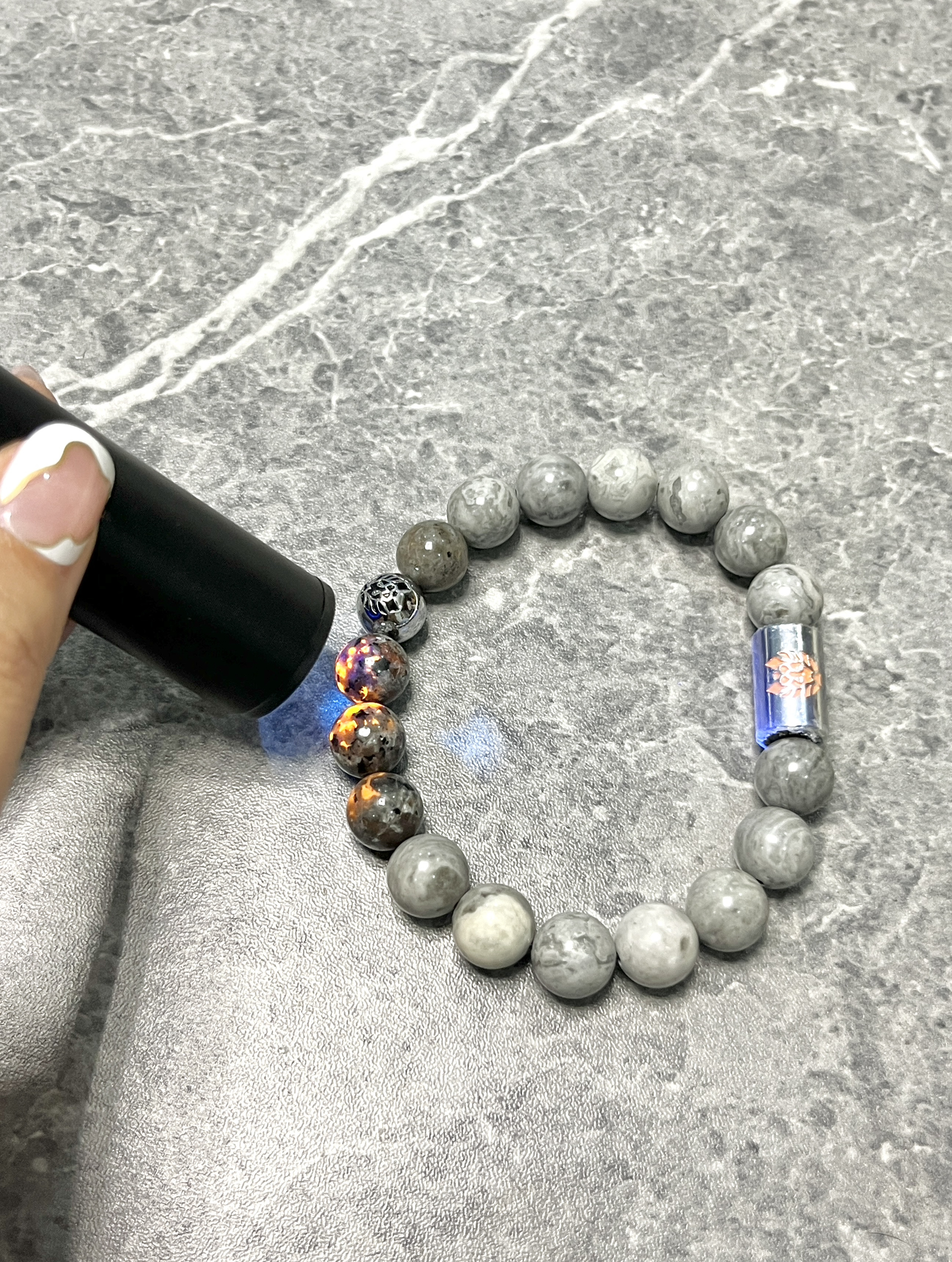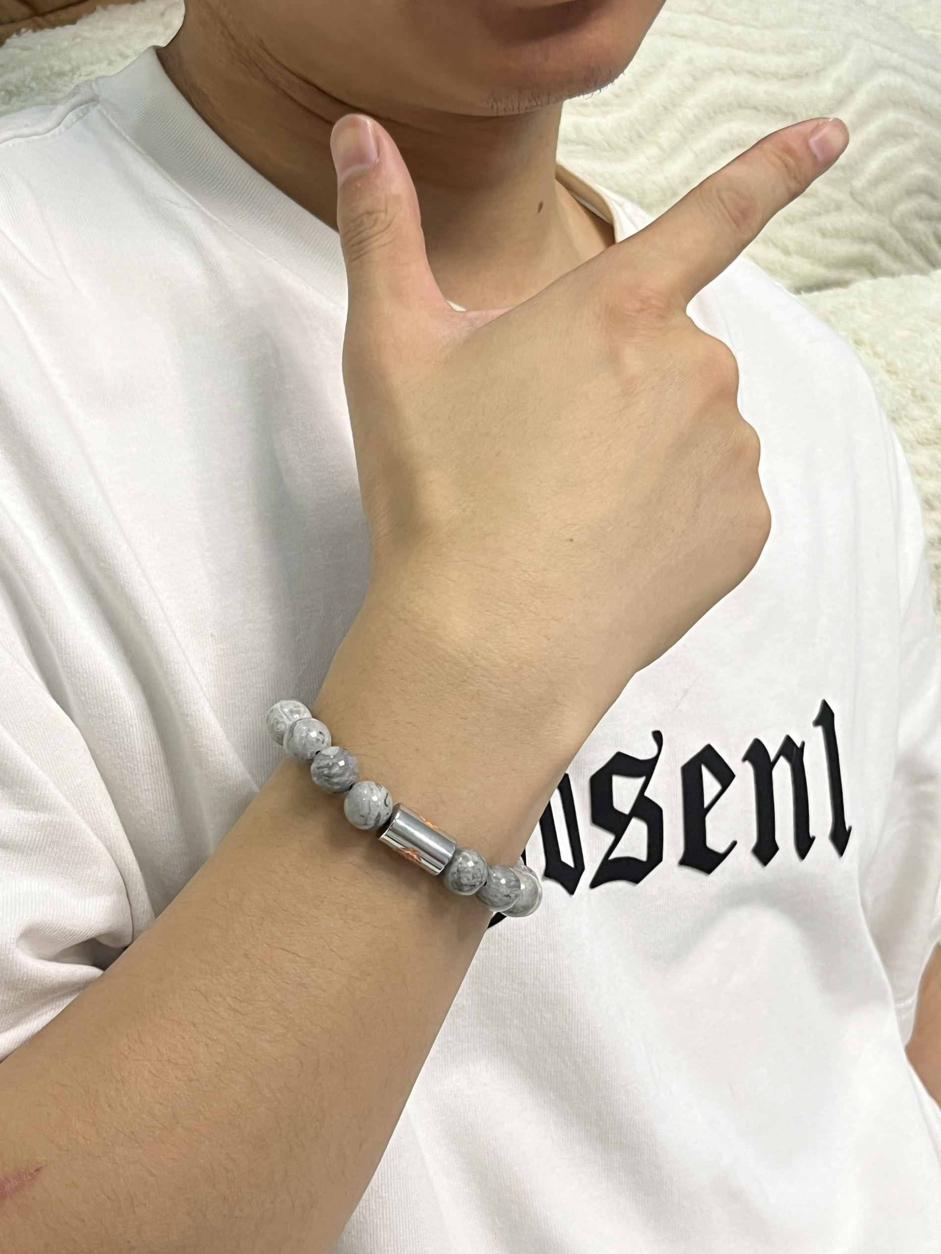 男友可喜欢这个火焰石手串了 他心心念念了好久 我就给他安排上咯 手串有四颗火焰石,用紫光灯照射会发光哦 平时还挺好搭配衣服的嘞 而且还是情侣款呢 可以和男友一起戴咯