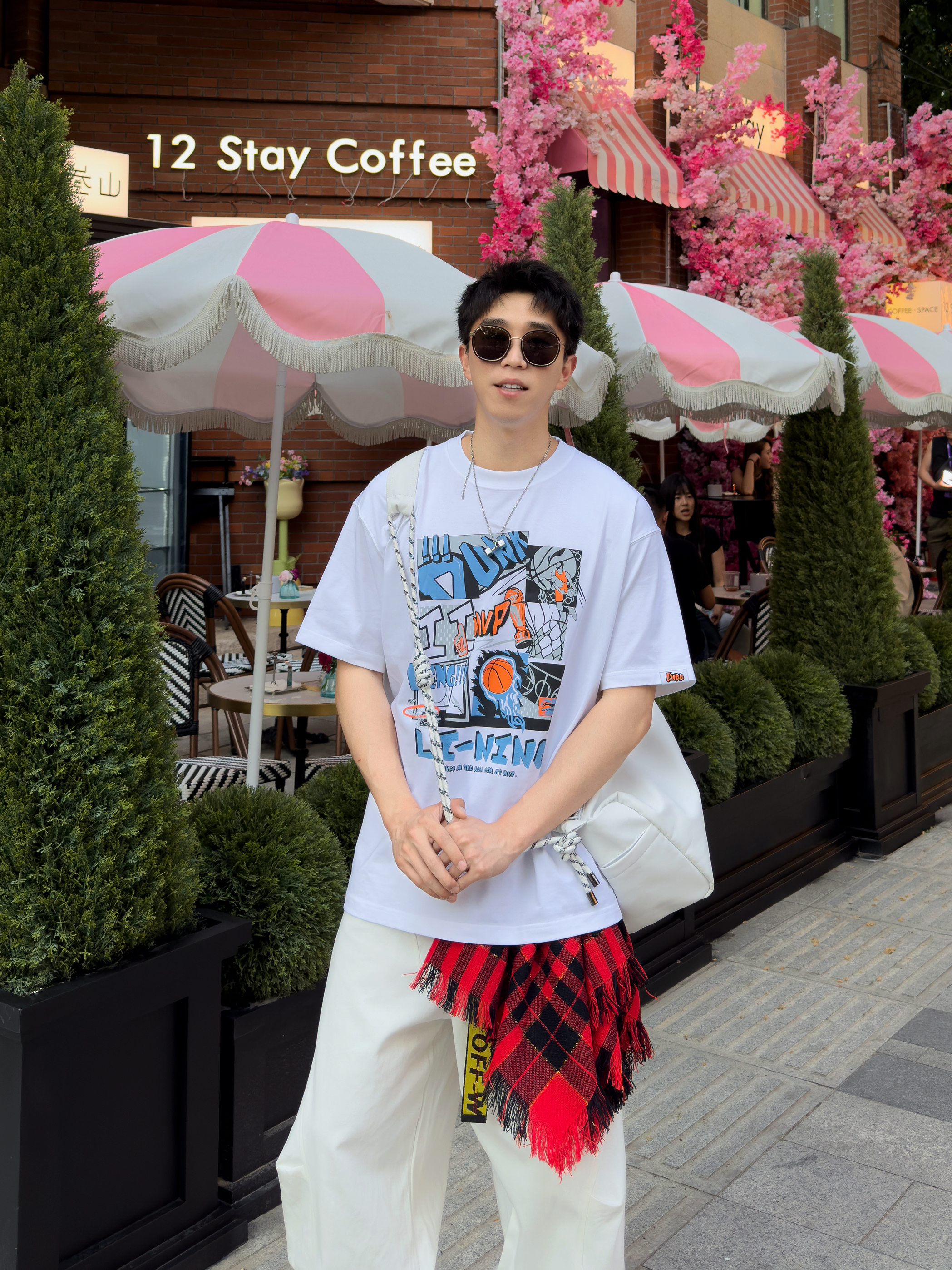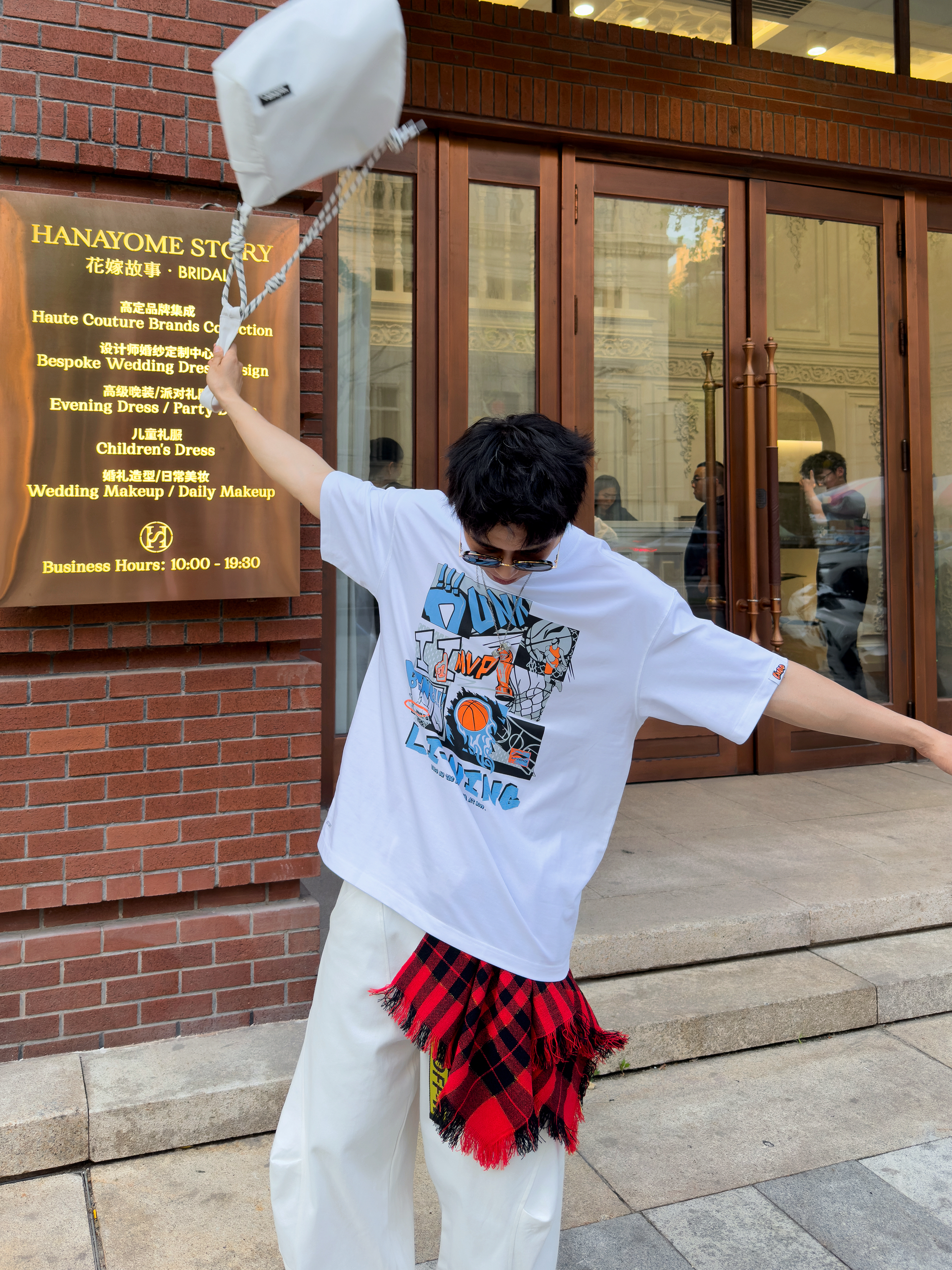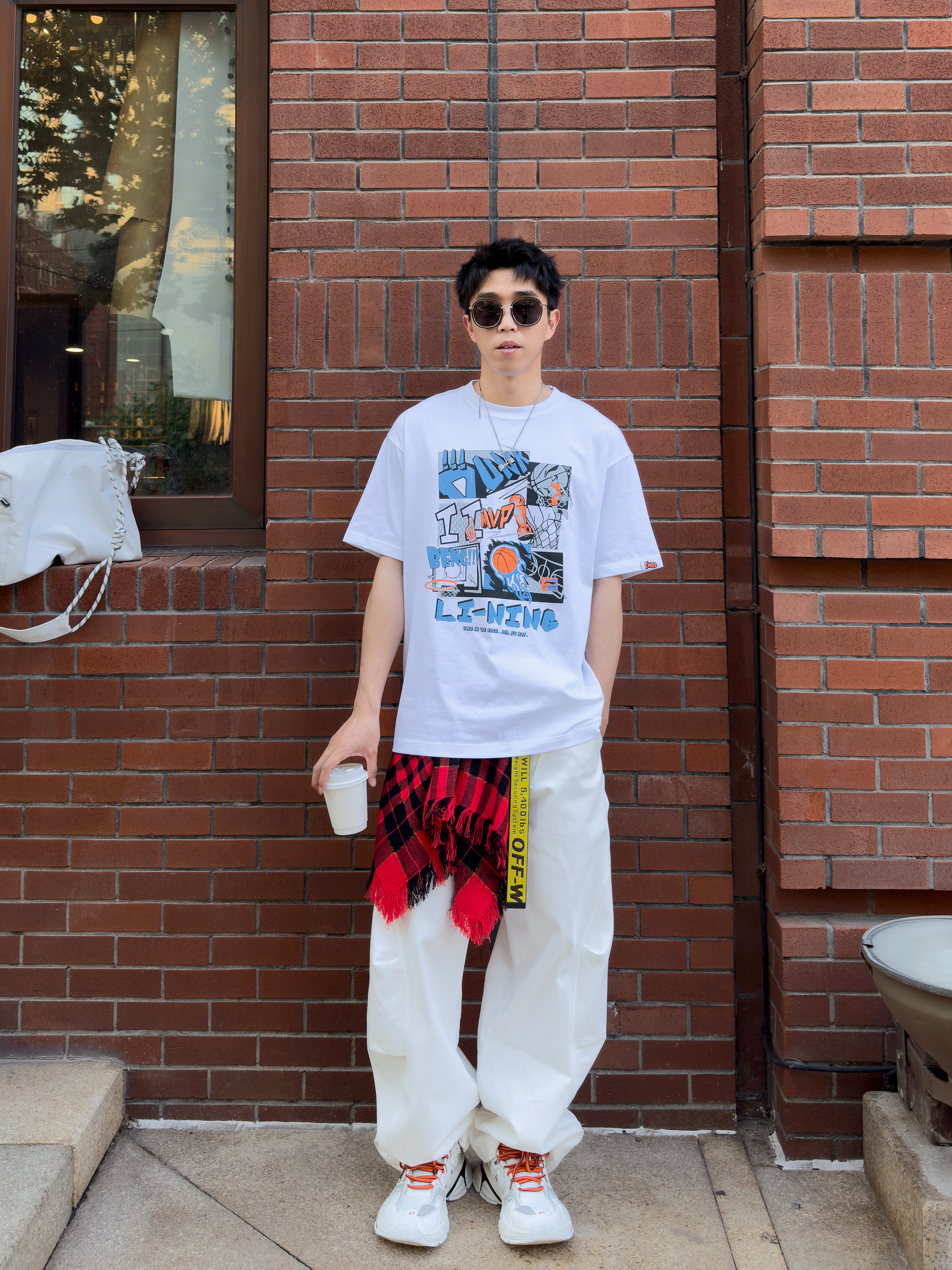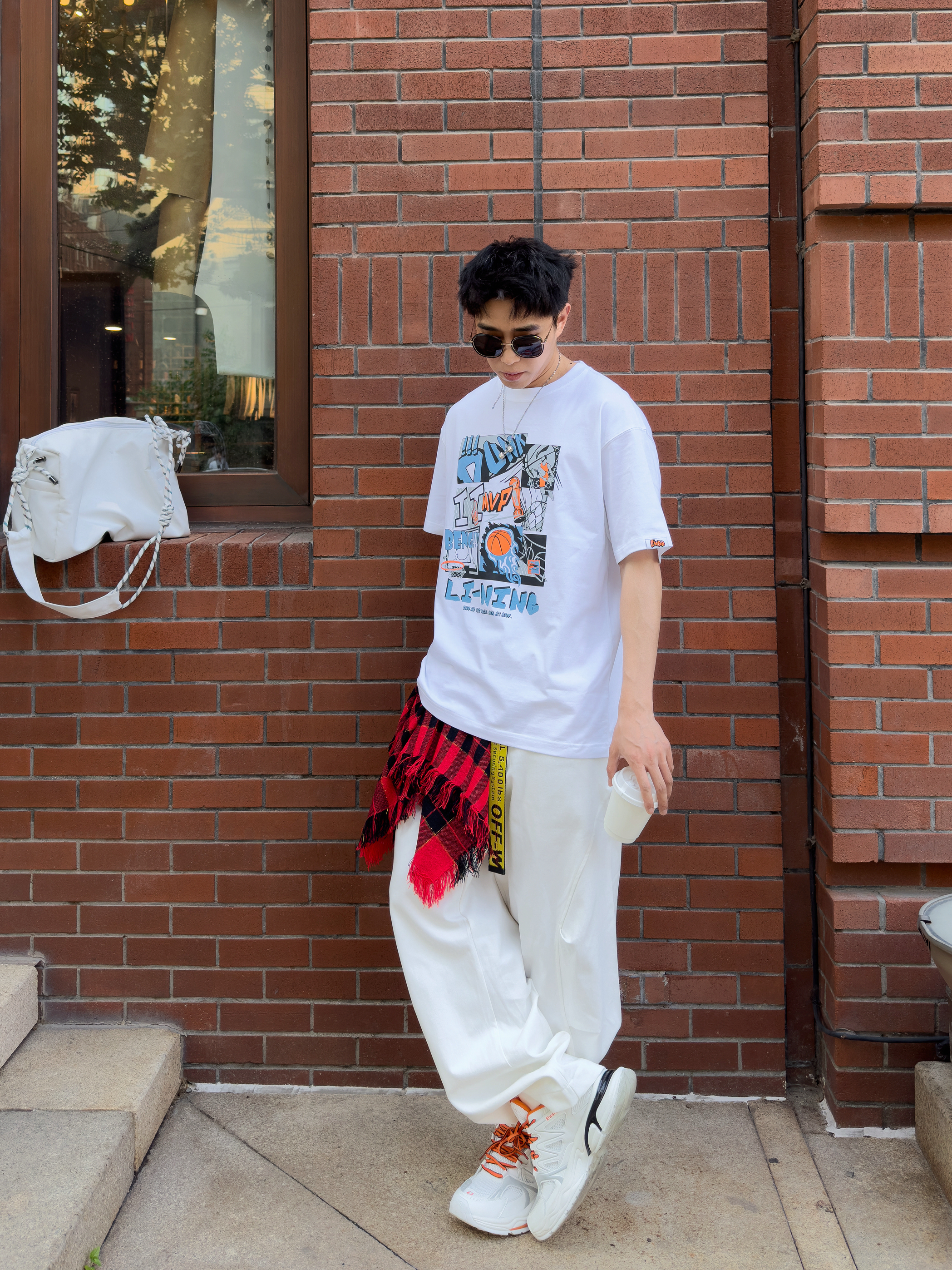 给简单的白色穿搭加点点缀、松弛又高级✅ 宽松版型白T👕高质感轻松拿捏舒适与高级 胸前大幅篮球主题印花🏀个性又有辨识度 搭配白色镰刀版型阔腿裤和老爹鞋🌟 很符合都市场景的一套穿搭✔️ 让你轻松拿捏通勤和日常出行👏 — 👕:LiNing 李宁 👤:身高181 体重152 尺码xxl