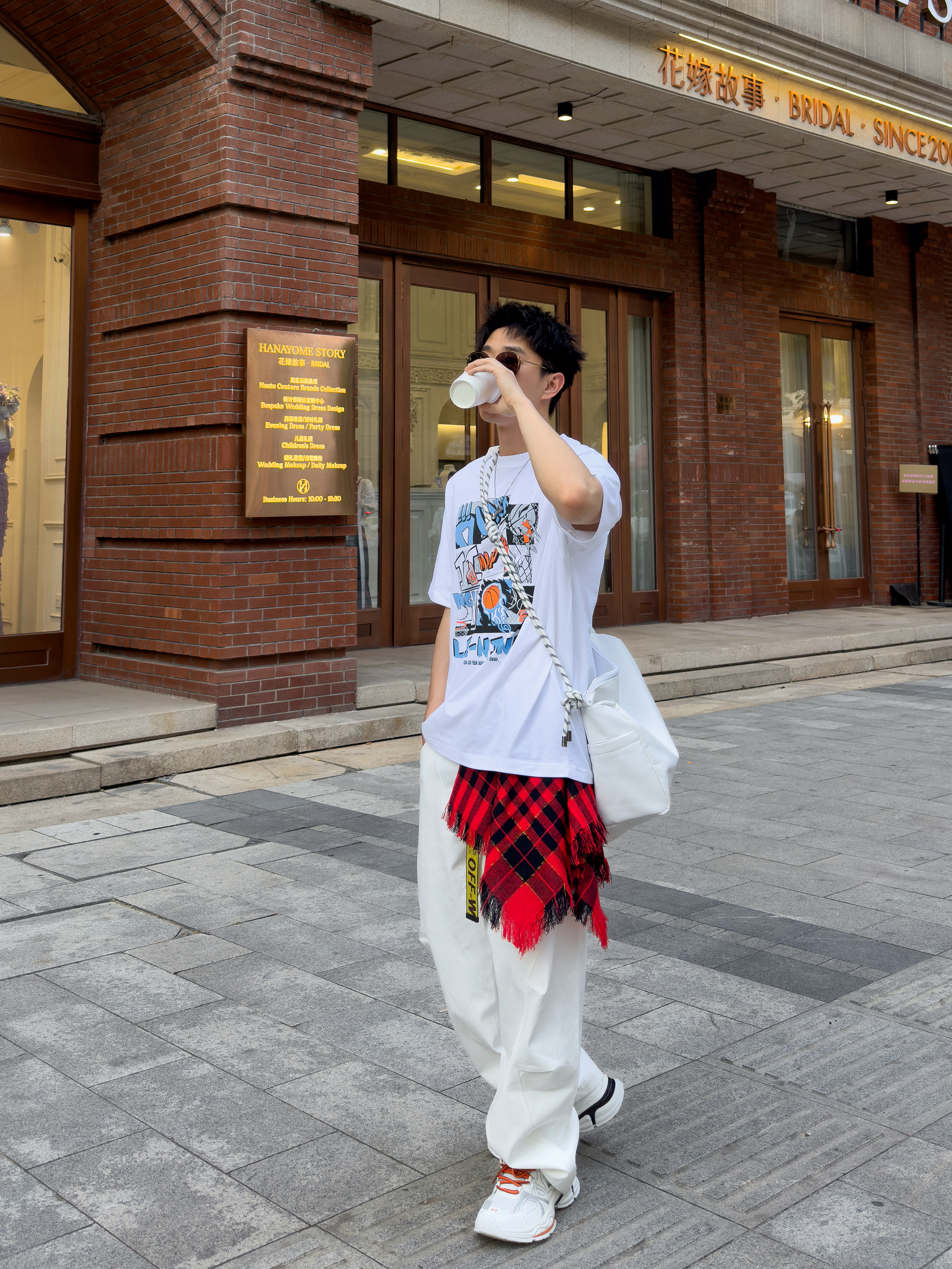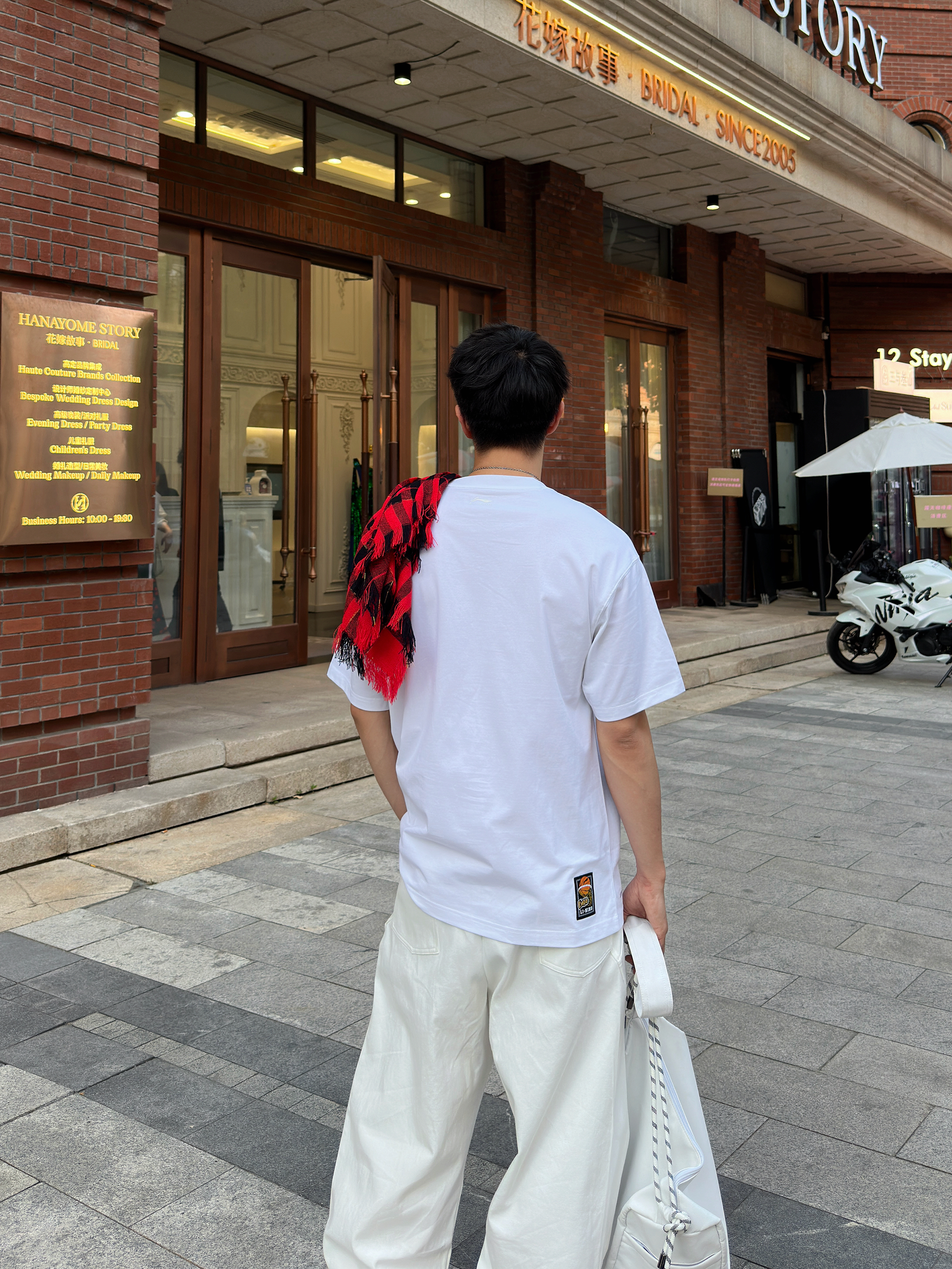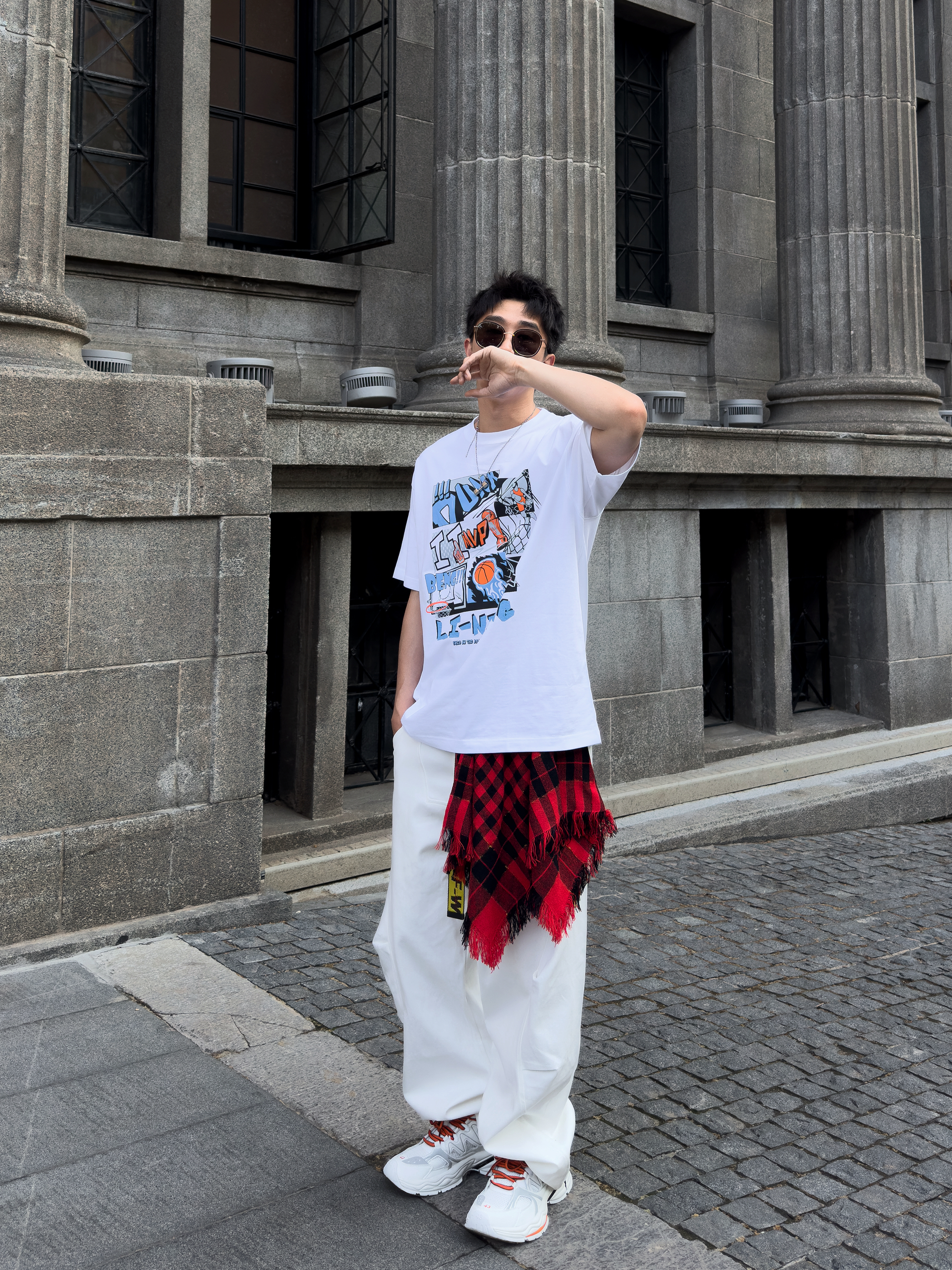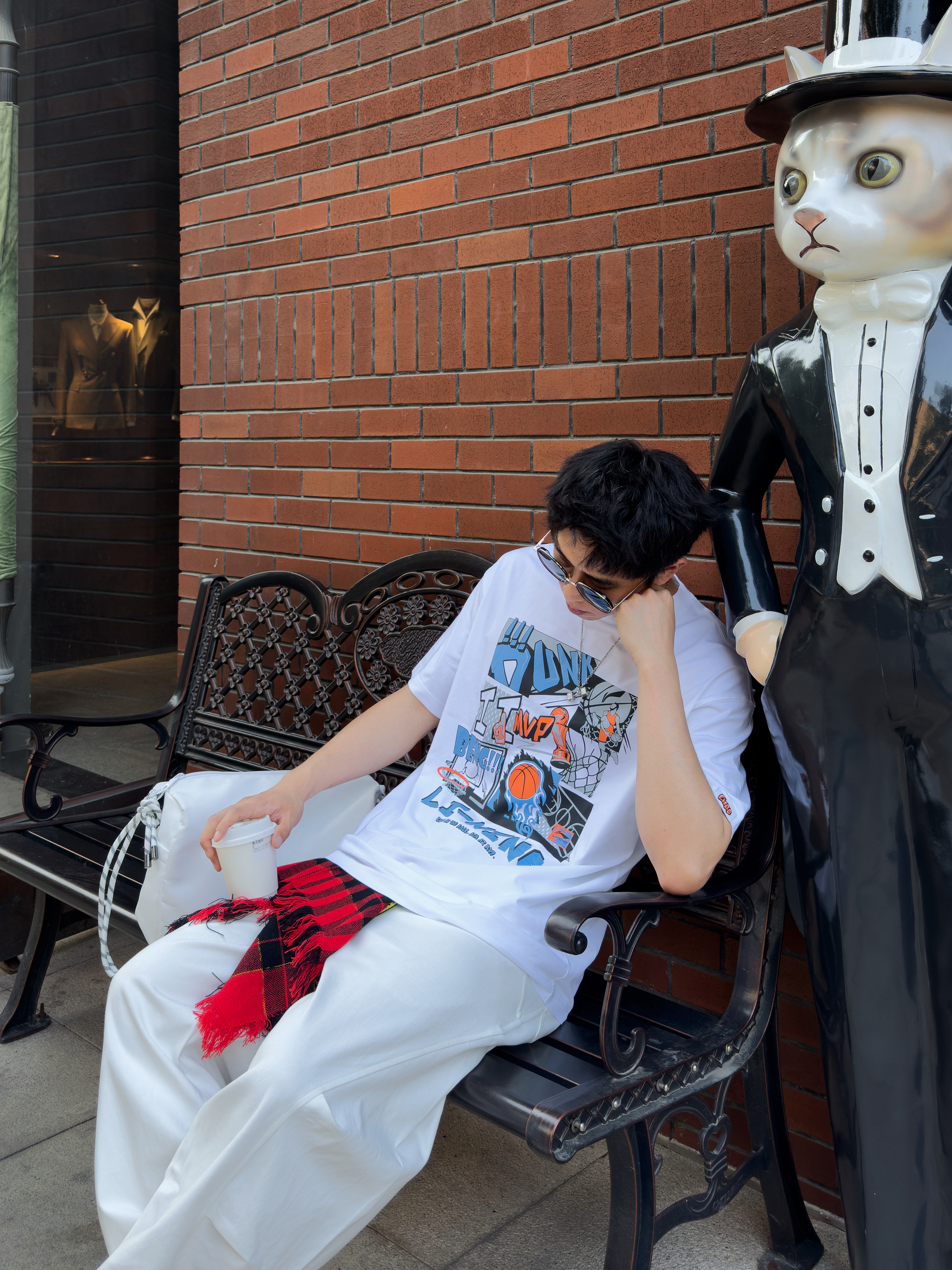 给简单的白色穿搭加点点缀、松弛又高级✅ 宽松版型白T👕高质感轻松拿捏舒适与高级 胸前大幅篮球主题印花🏀个性又有辨识度 搭配白色镰刀版型阔腿裤和老爹鞋🌟 很符合都市场景的一套穿搭✔️ 让你轻松拿捏通勤和日常出行👏 — 👕:LiNing 李宁 👤:身高181 体重152 尺码xxl