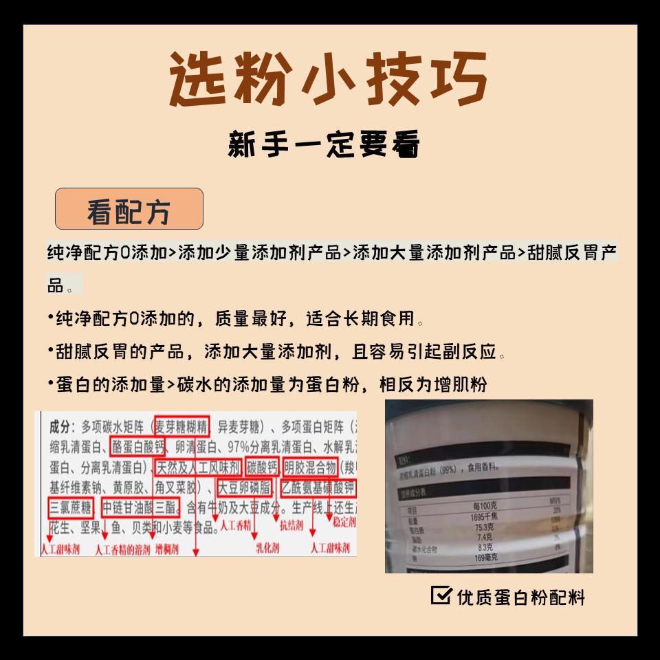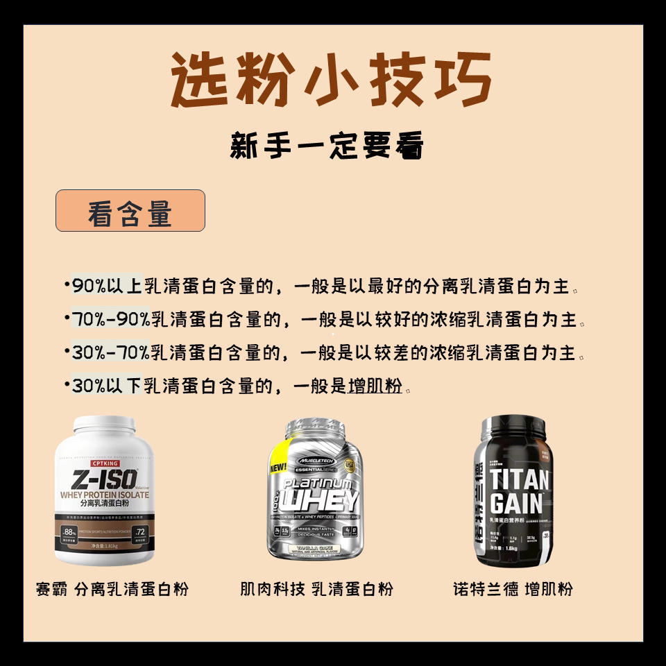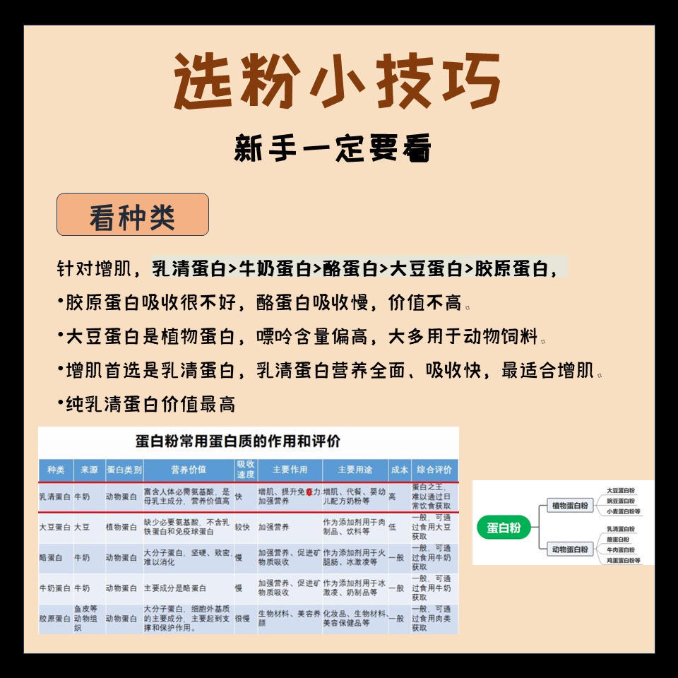 ✅看种类 针对增肌,乳清蛋白>牛奶蛋白>酪蛋白>大豆蛋白>胶原蛋白, •胶原蛋白吸收很不好,酪蛋白吸收慢,价值不高。 •大豆蛋白是植物蛋白,嘌呤含量偏高,大多用于动物饲料。 •增肌首选是乳清蛋白,乳清蛋白营养全面、吸收快,最适合增肌。 •纯乳清蛋白价值最高 ✅看含量 •90%以上乳清蛋白含量的,一般是以最好的分离乳清蛋白为主。 •70%-90%乳清蛋白含量的,一般是以较好的浓缩乳清蛋白为主。 •3...