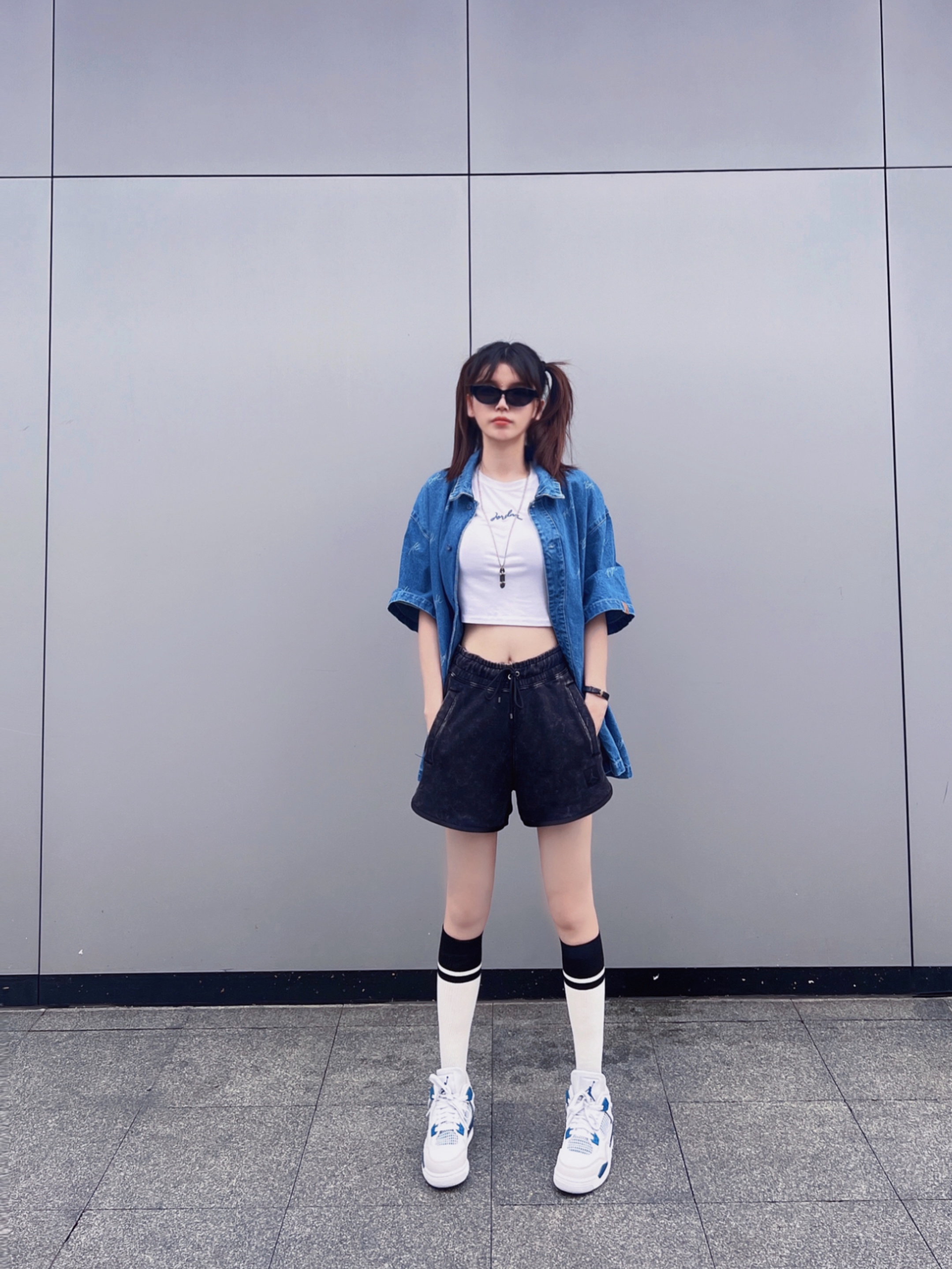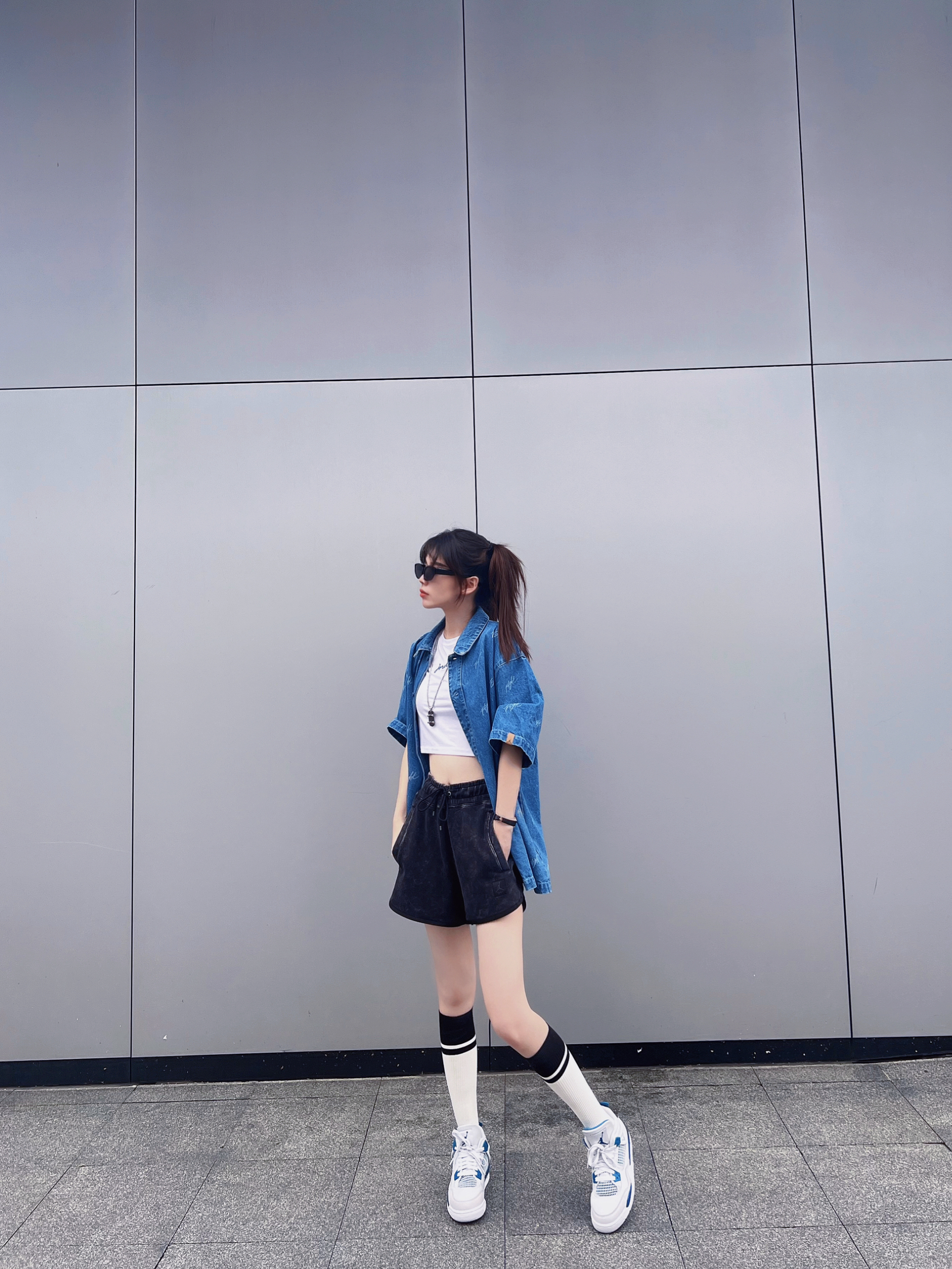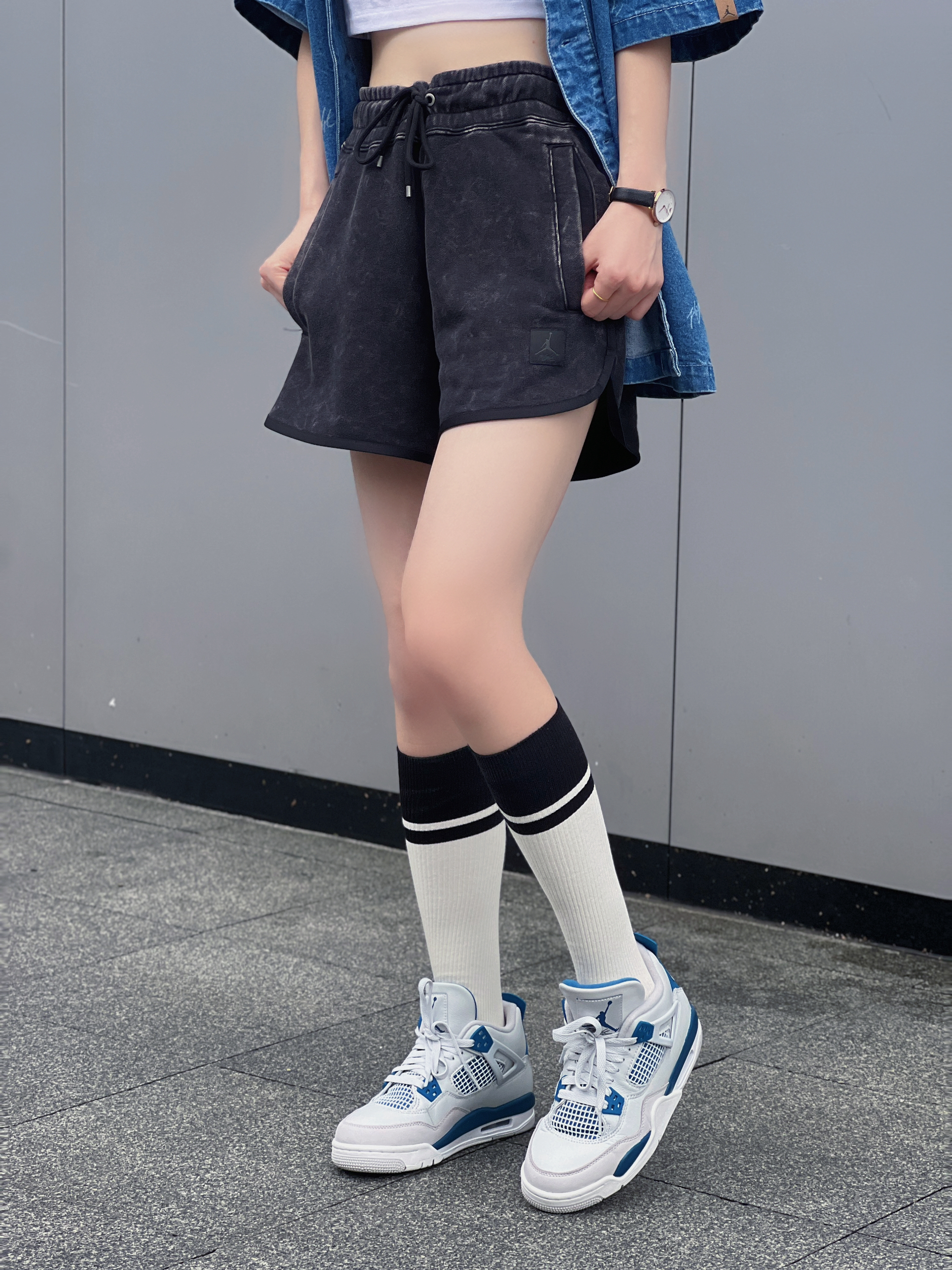 今日穿搭牛仔衬衫搭配短裤休闲风 👟AJ4灰蓝新配色好百搭 这套拍照很出片呢! 大爱💙AJ4😎