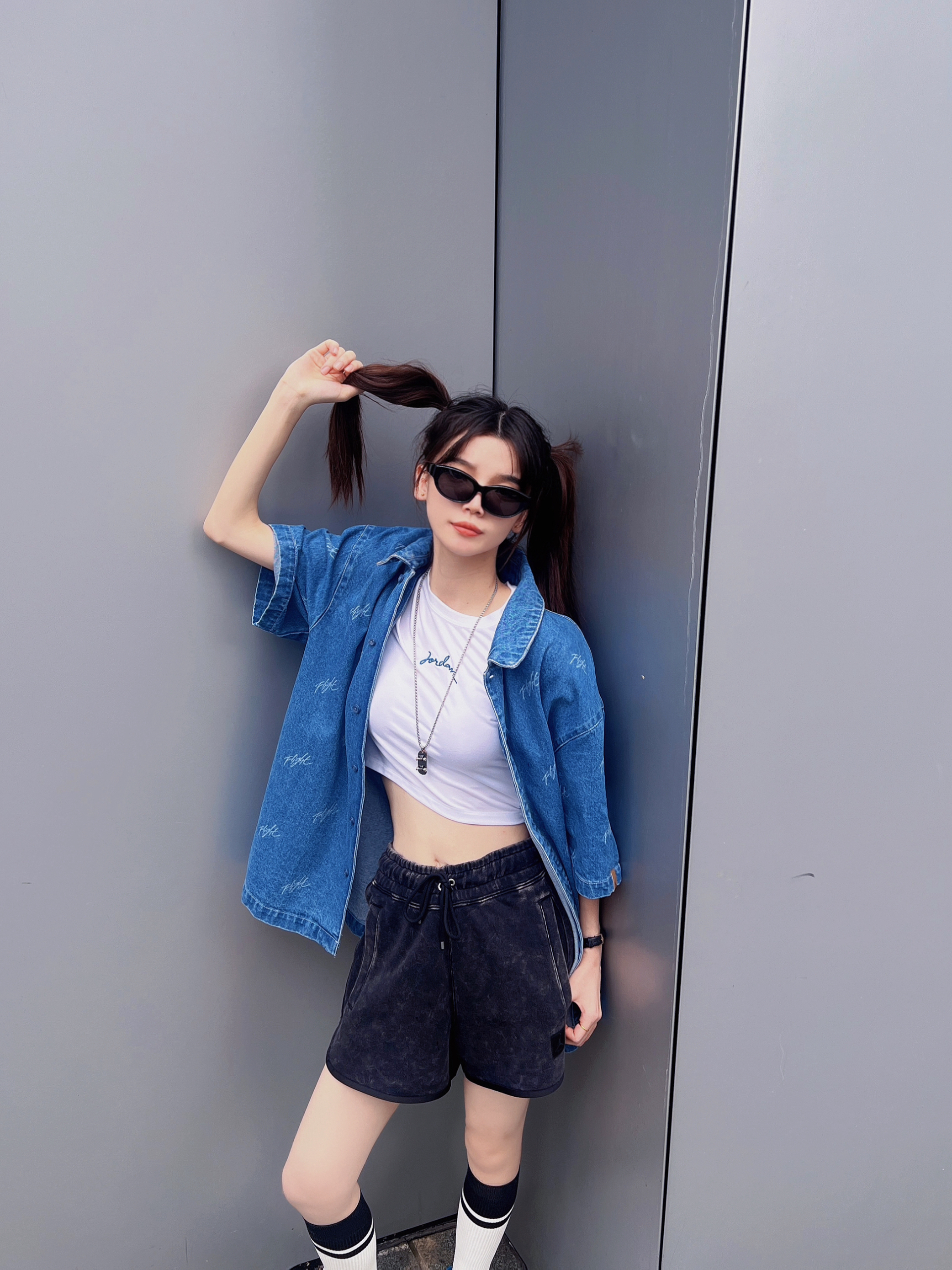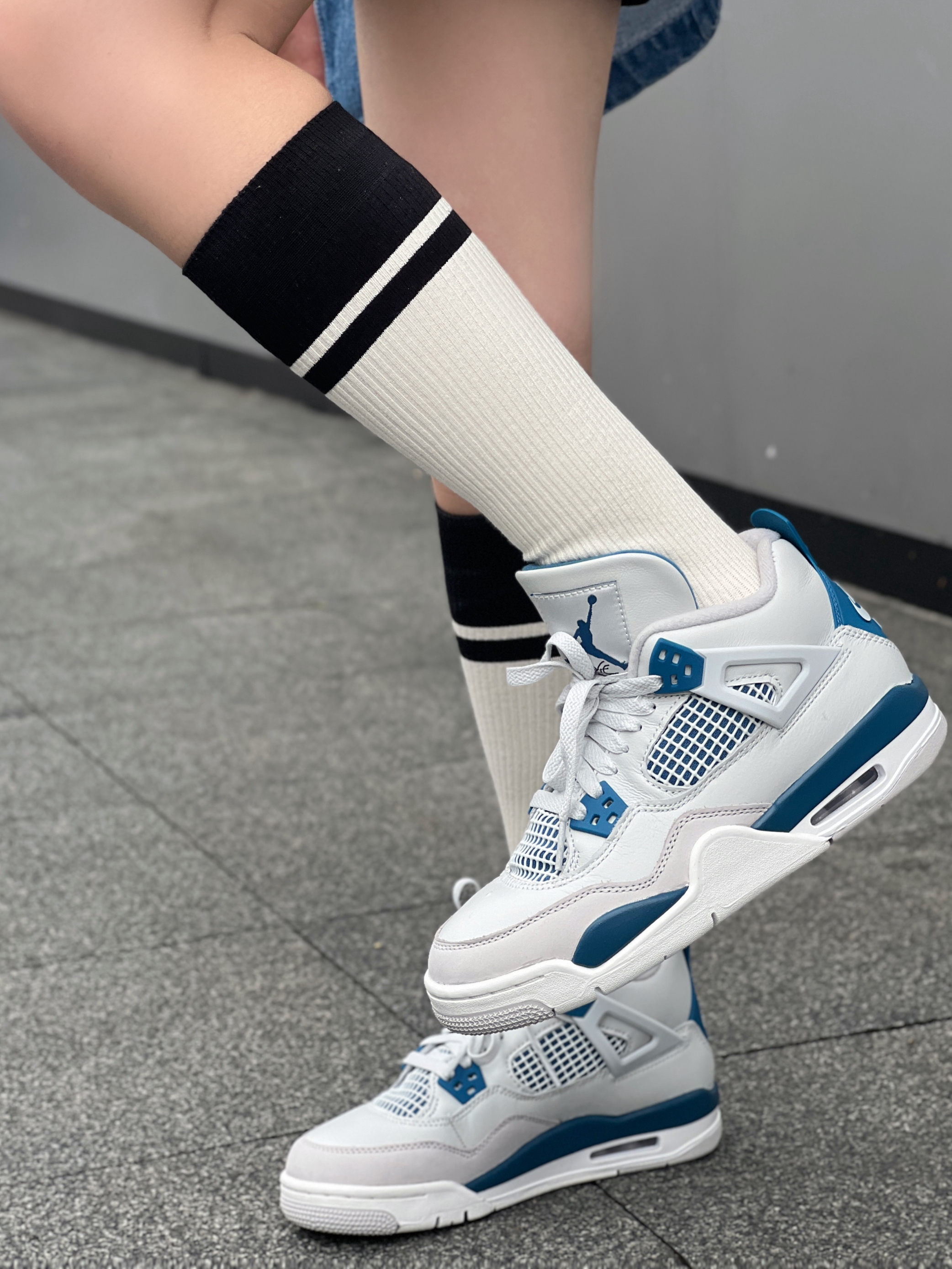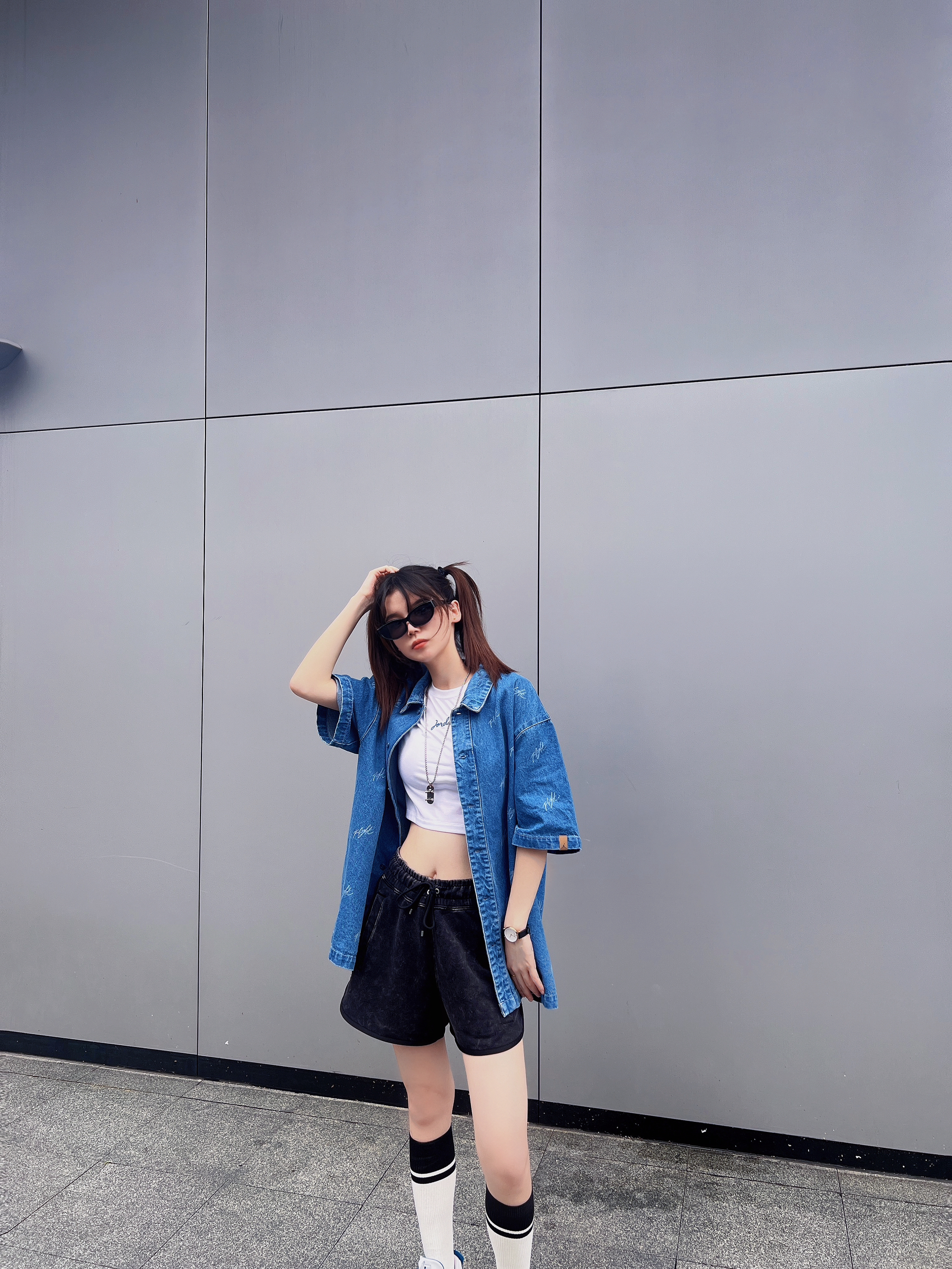 今日穿搭牛仔衬衫搭配短裤休闲风 👟AJ4灰蓝新配色好百搭 这套拍照很出片呢! 大爱💙AJ4😎