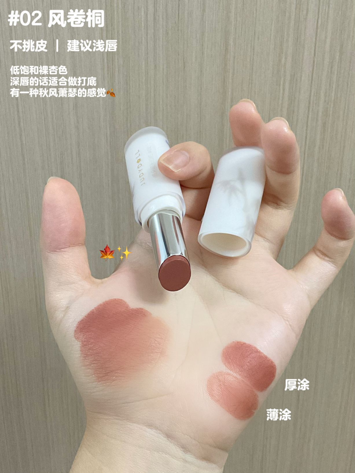 本篇笔记关联了橘朵 固体口红 持久哑光雾面 3g 02风卷桐、橘朵 固体口红 持久哑光雾面 3g 04我心悠悠等商品,为用户提供真实的使用体验和购买参考。