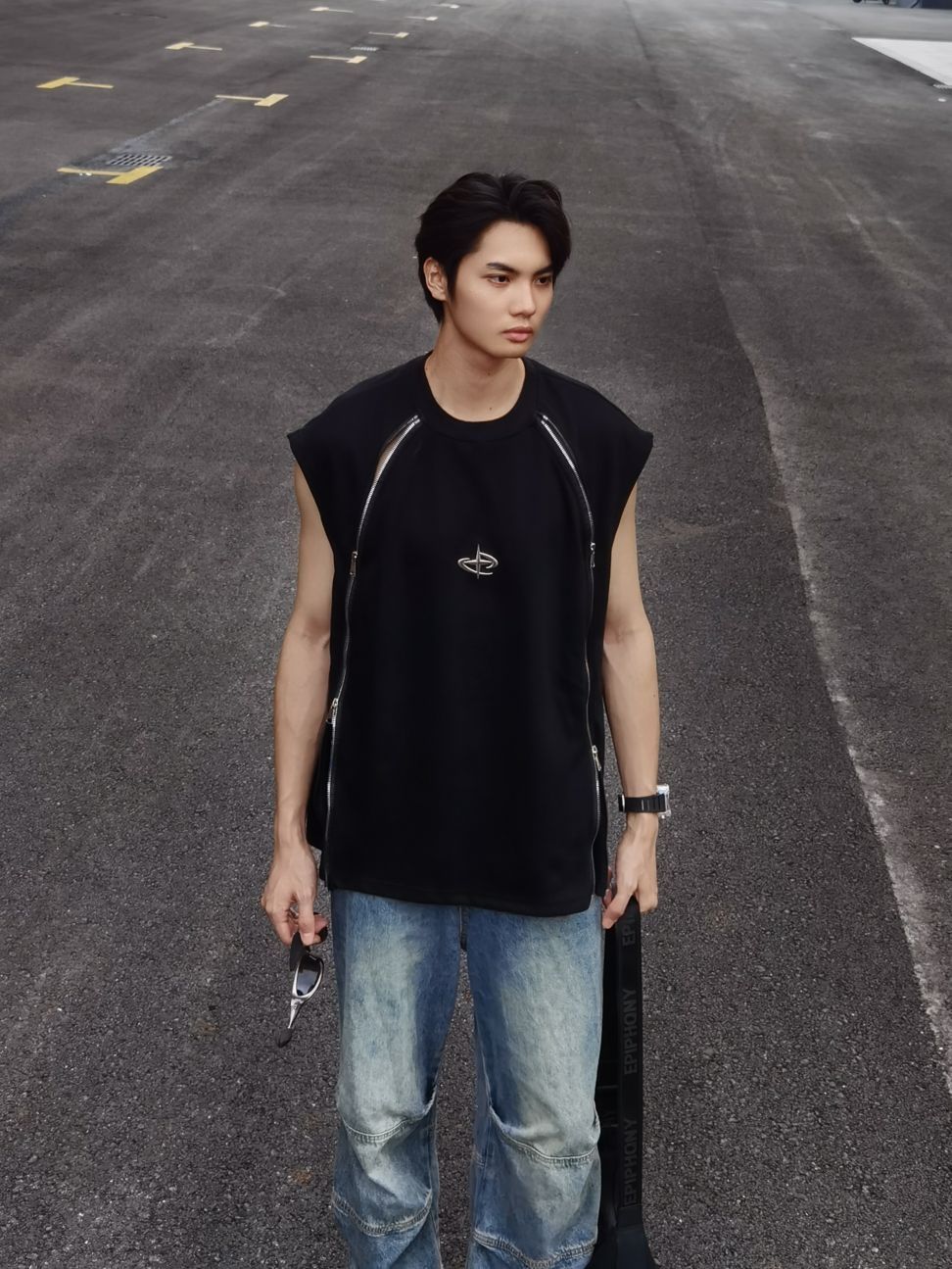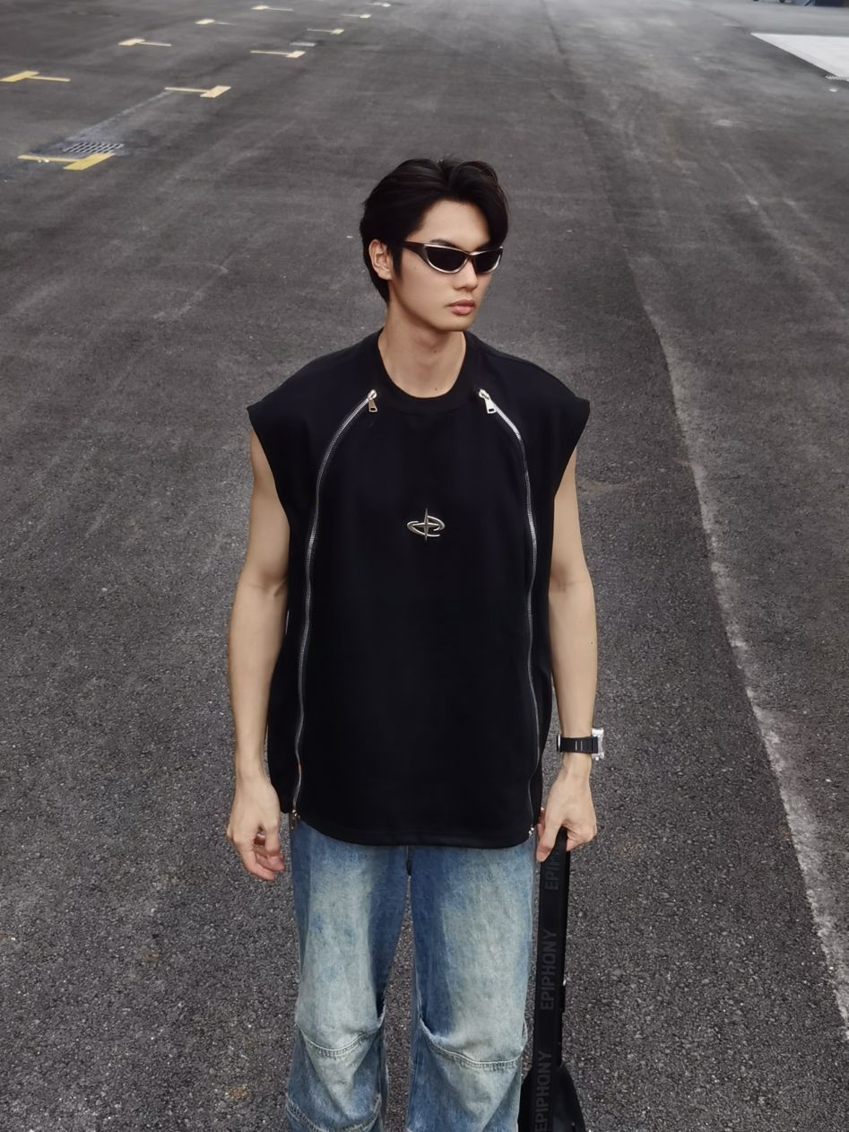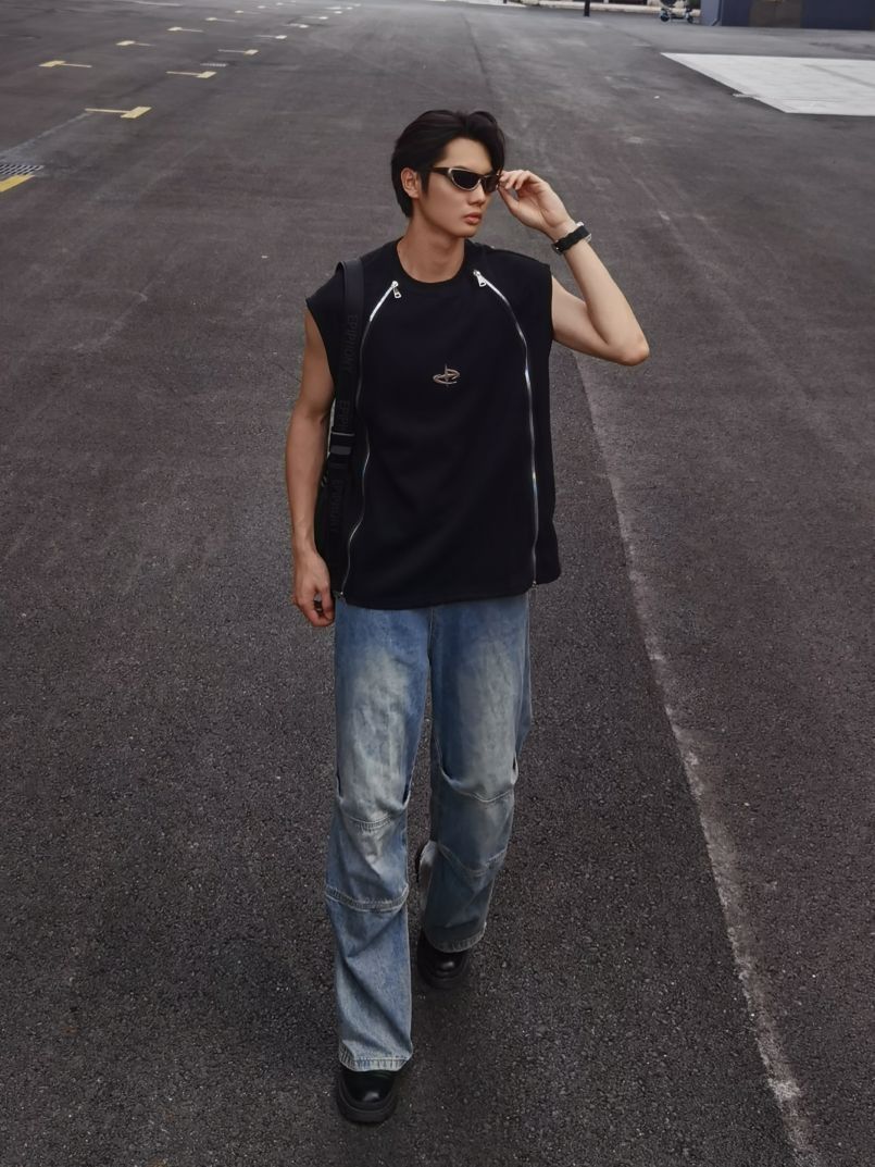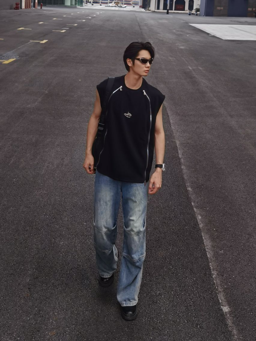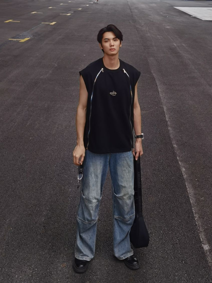 身高|体重:185 140 🧍♂️ 穿搭风格:街头时尚 👔 上衣:时尚感黑色阔版背心 👖 下装:工装风牛仔裤 👟 鞋子:黑色马丁靴 🎒配饰:😎