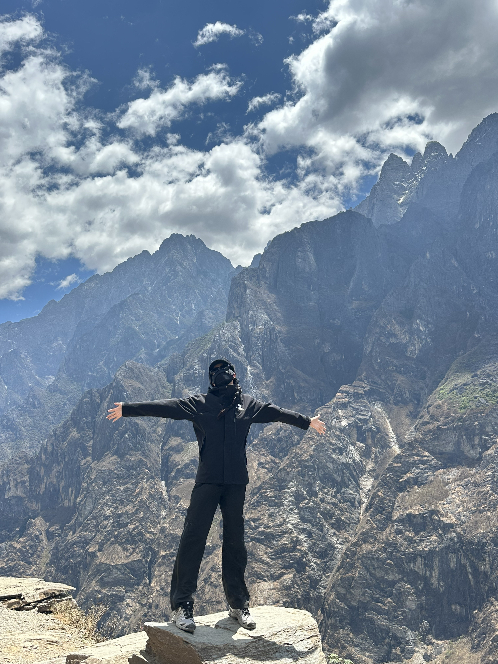 虎跳峡紫外线还是蛮大的,建议防晒全套安排上 五月中旬过去的,天气已经没那么冷了,外套不用穿太厚,晴天的话,早晚温差大,正午会比较热 裤子我选择了迪卡侬MH500小腿位置有拉链,热了可以拉开,很方便。 鞋子就选择了徒步必备的萨洛蒙