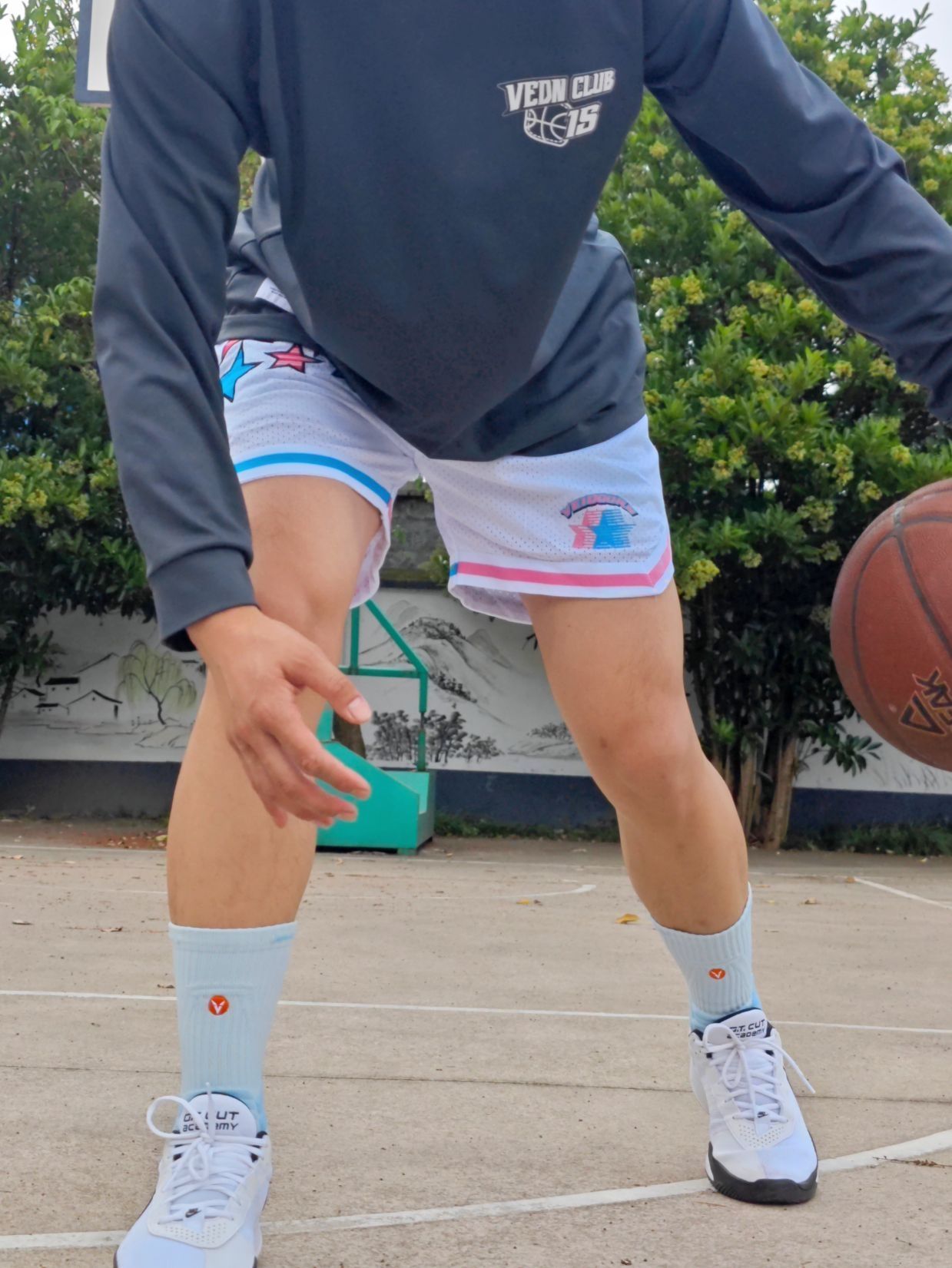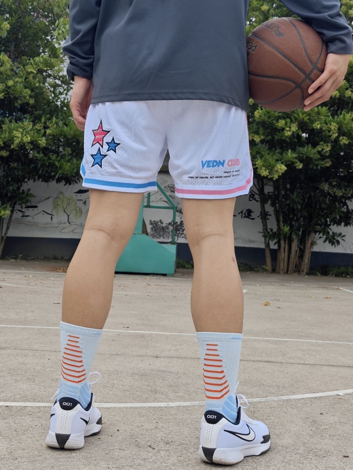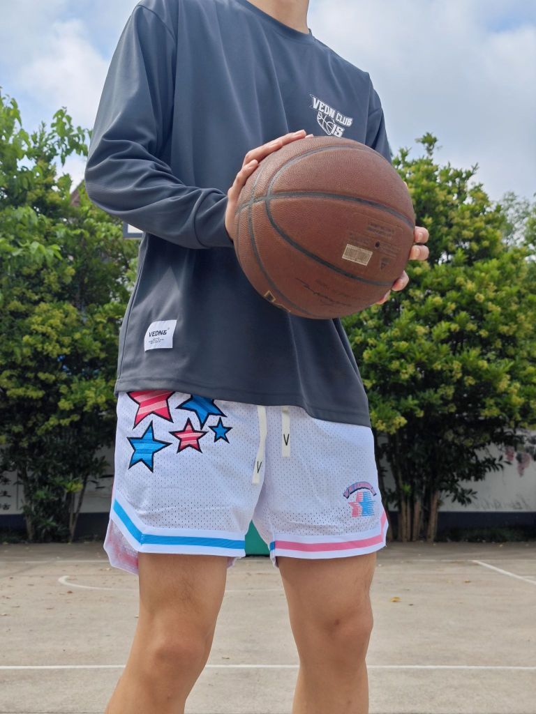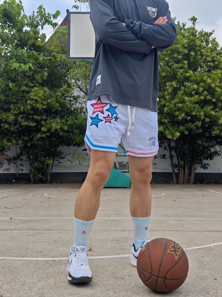 夏日打球怎么能少的了一条美式四分球裤 这条维动VEIDOORN星河系列球裤又帅又能打 采用针织透气面料,还有内衬设计 星河元素和球裤完美融合,上身确实很帅 白色也非常好搭配,夏日出街打球必备 尺码方面本人身高182体重78穿2XL