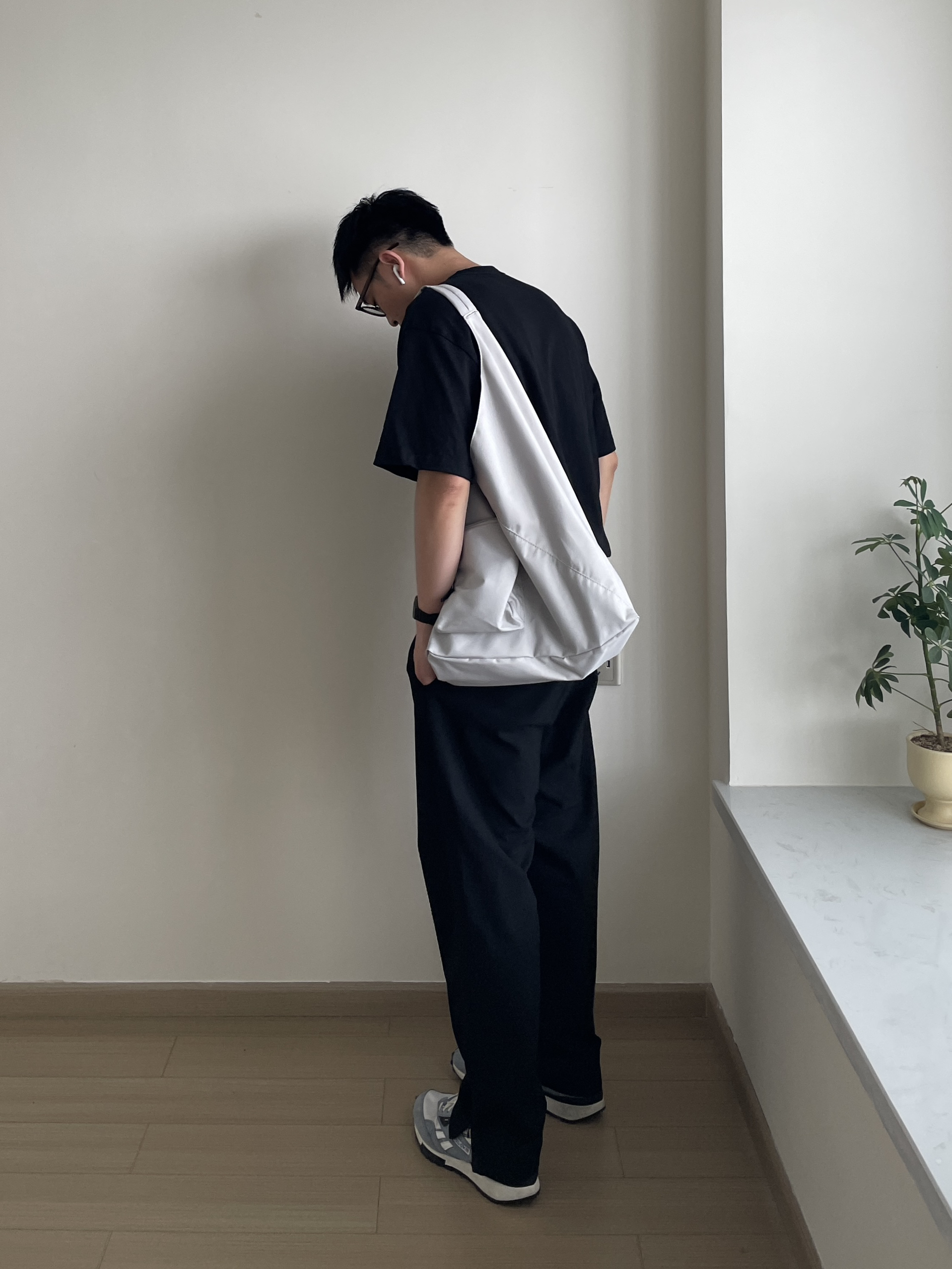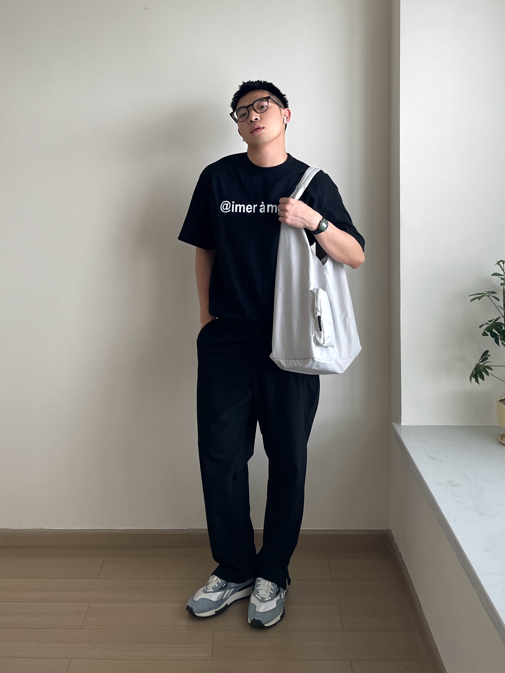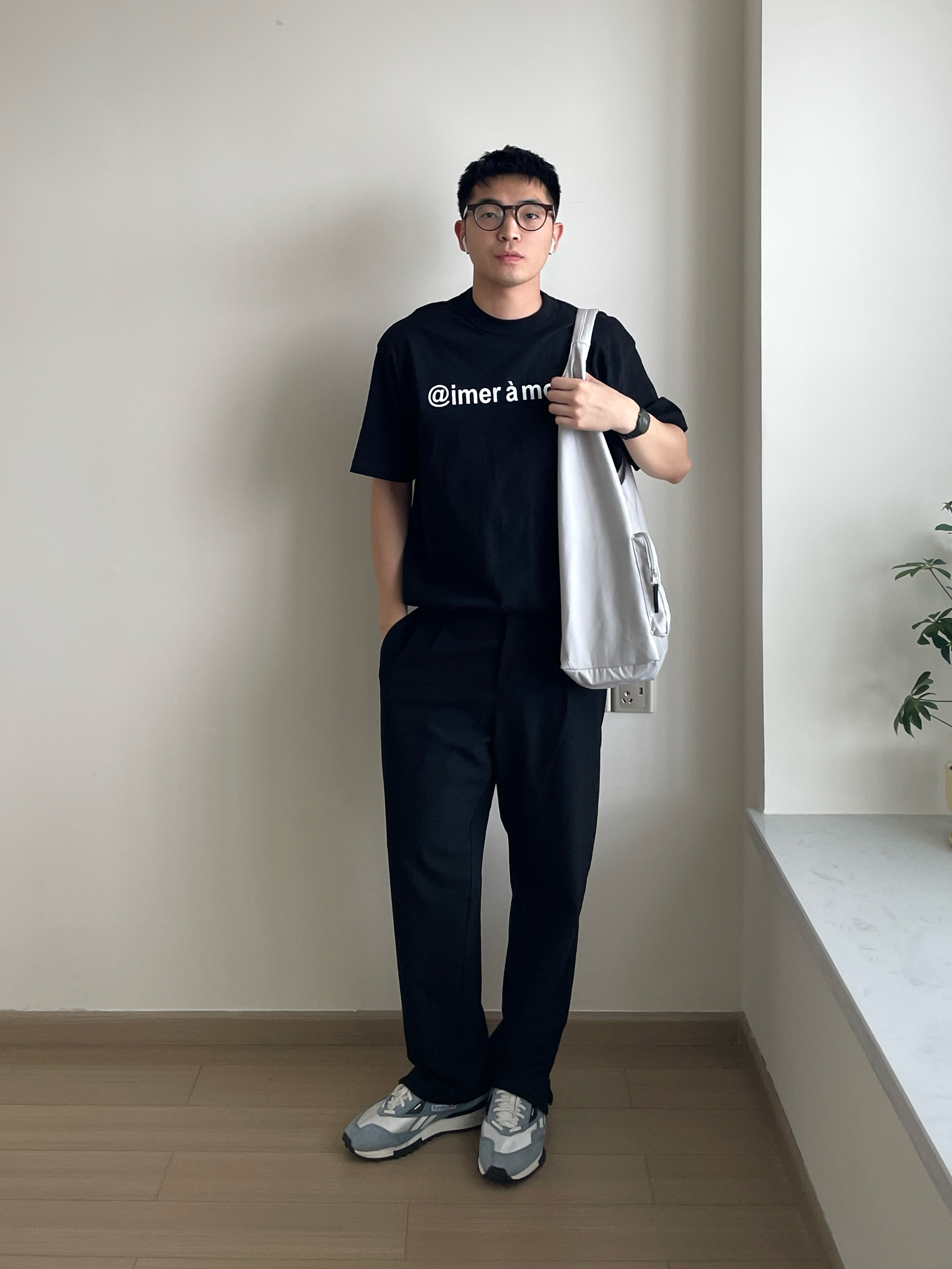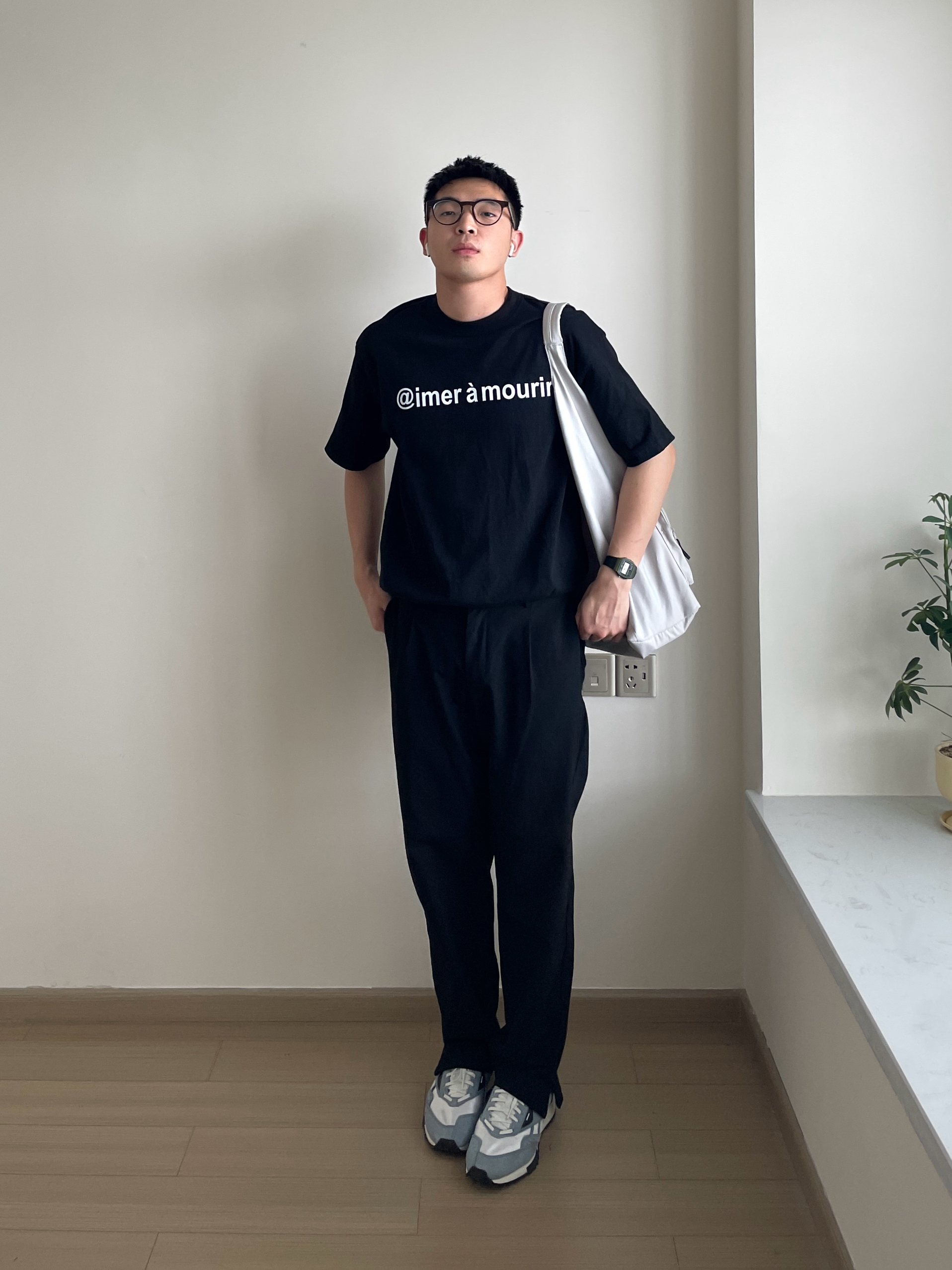 👕-黑色系的简约通勤风,不用考虑太多搭配也能好好看!简单的印花T,中性好看。 👖- 搭配一条百搭的直筒西裤,裤脚开衩的版型多一分时尚感。 👟- 雾霾蓝的复古慢跑鞋是我的天菜,颜色好看又百搭! ⌚- 轻便简约,带起来没有负重感,复古的造型也很百搭,绿色好好看!