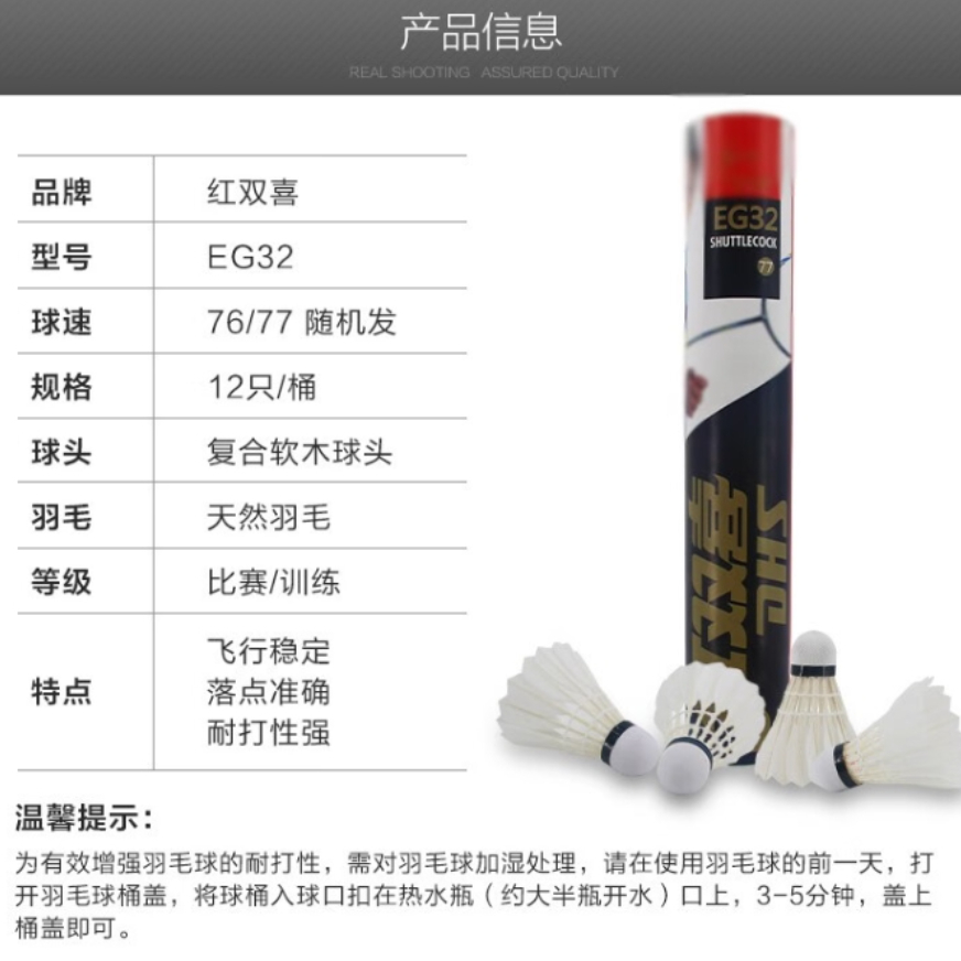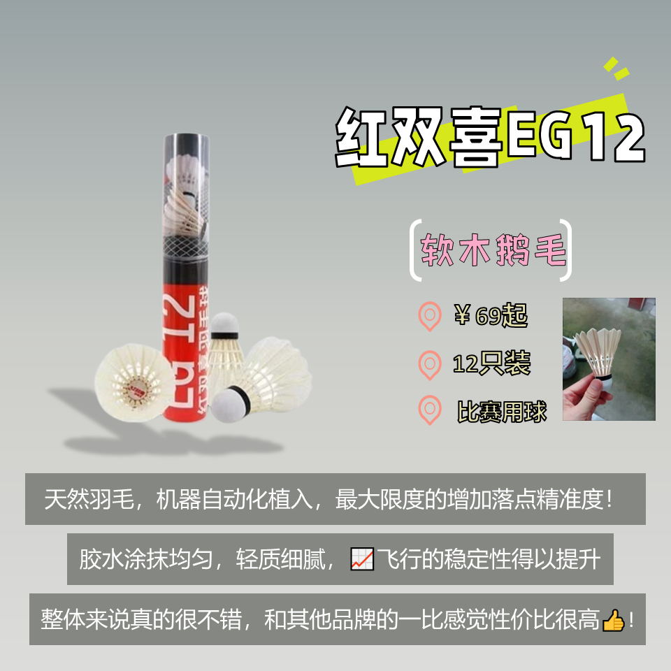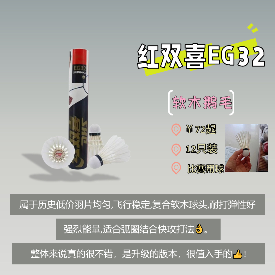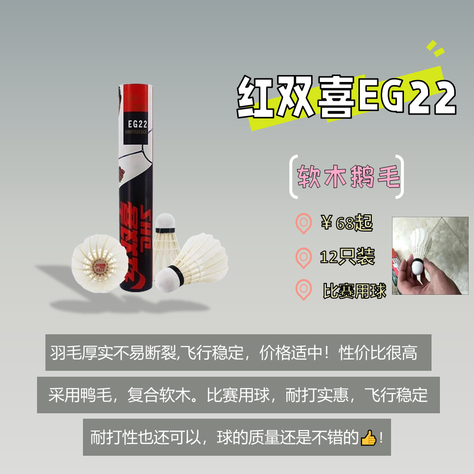 ✅红双喜EG12 这款是天然羽毛,机器自动化植入,最大限度的增加落点精准度!胶水涂抹均匀,轻质细腻,📈飞行的稳定性得以提升整体来说真的很不错,和其他品牌的一比感觉性价比很高👍! ✅红双喜EG32 属于历史低价羽片均匀,飞行稳定,复合软木球头,耐打弹性好强烈能量,适合弧圈结合快攻打法👌。整体来说真的很不错,是升级的版本,很值入手的👍! ✅红双喜EG22 羽毛厚实不易断裂,飞行稳定,价格适中!性价比很...