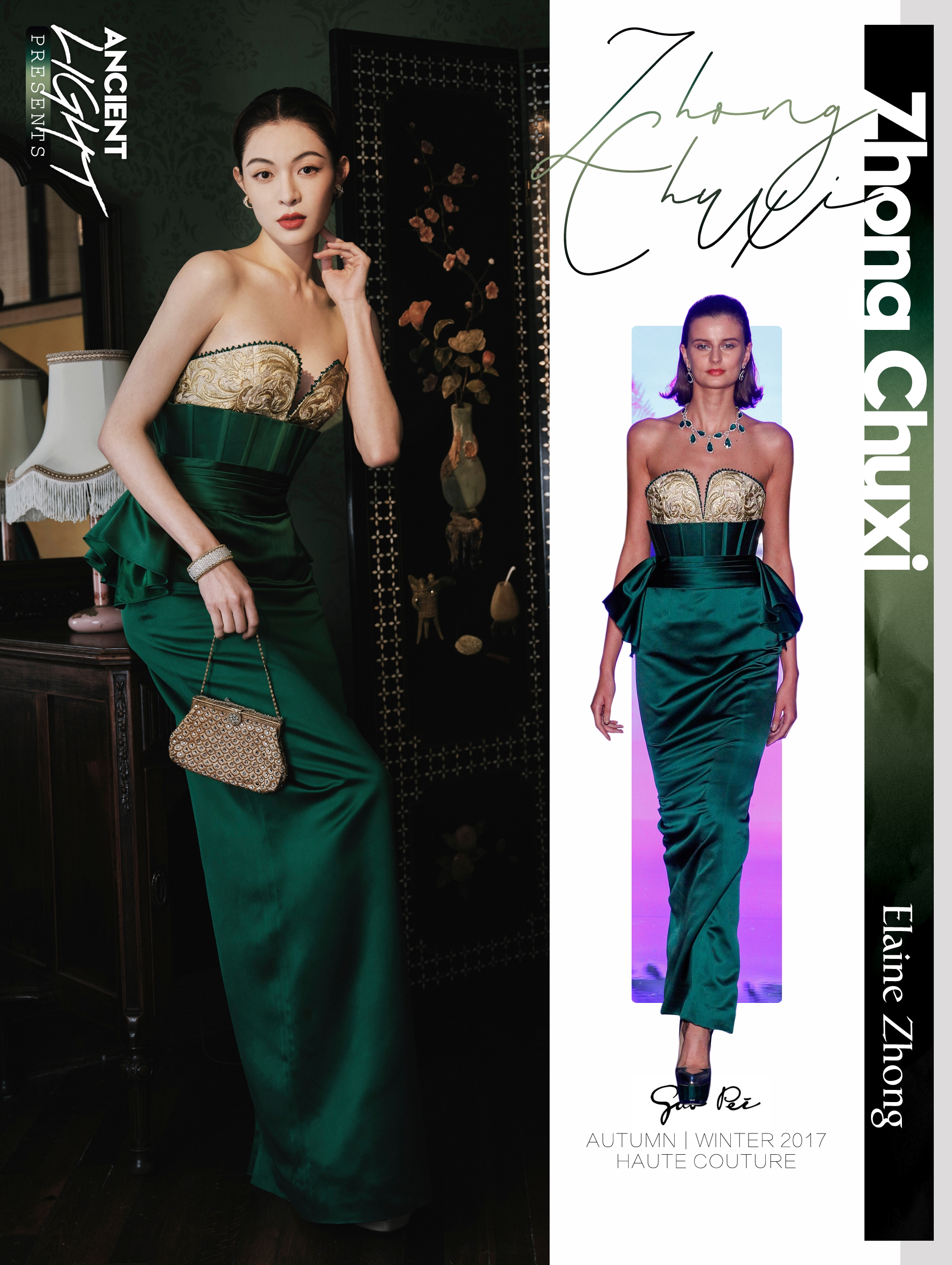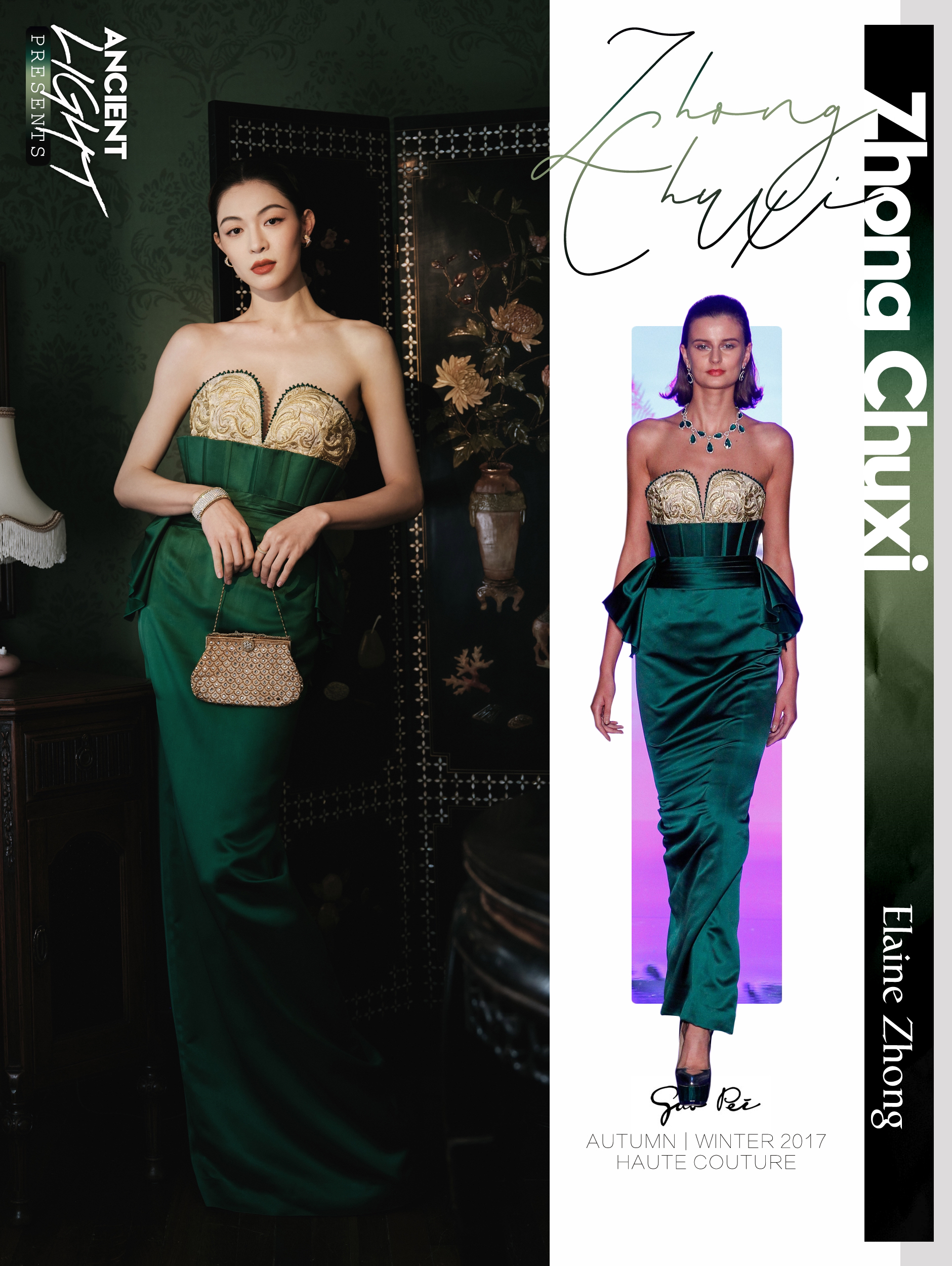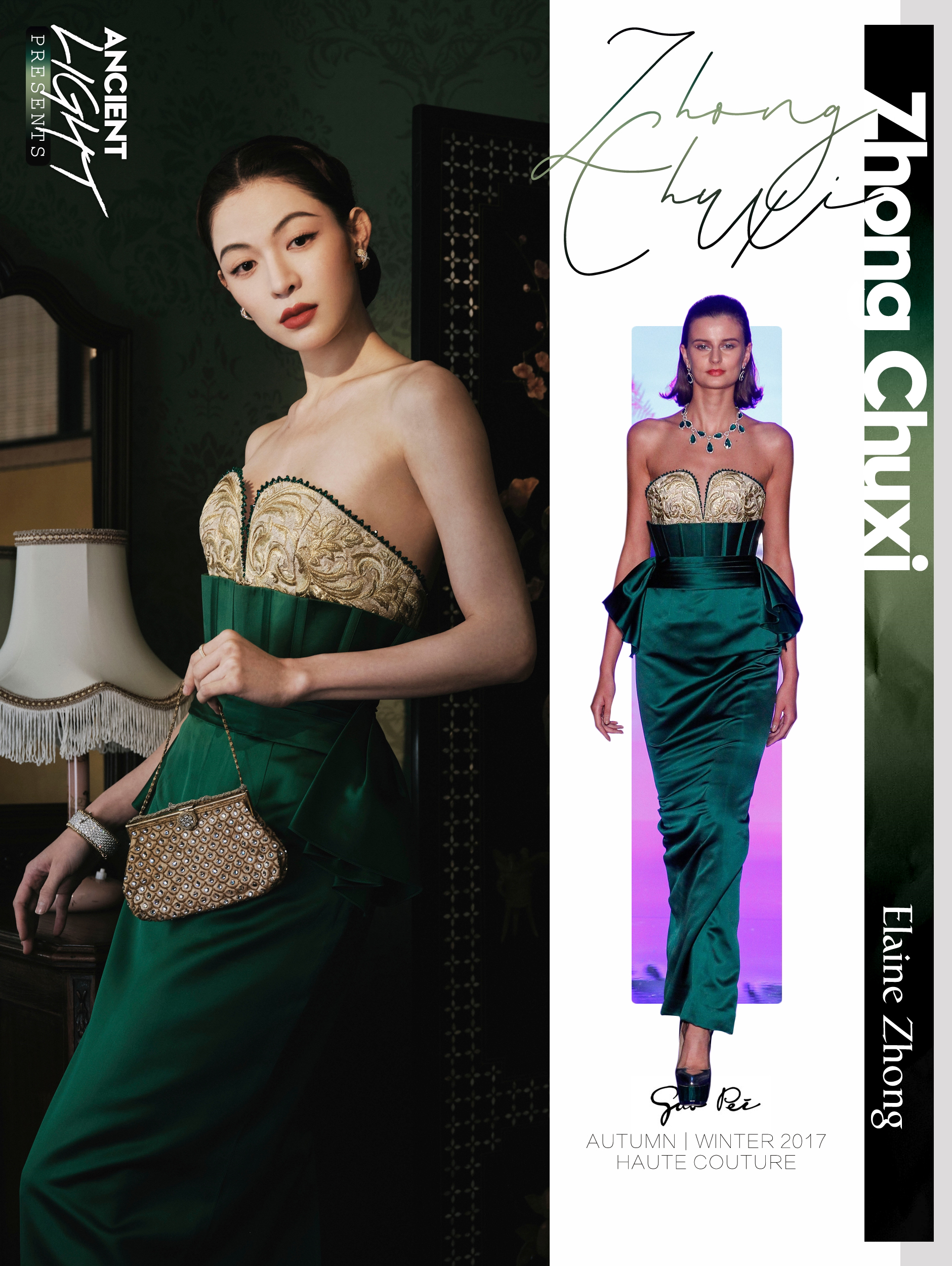 本次GQ的主题给到中式风格,其主题自然是离不开郭培高定的亮相。钟楚曦身着墨绿色抹胸缎面改良礼服裙。依旧是来自火热的 GUO PEI 2017 AW高级定制系列 。玲珑有致好身材,复古妆容,复刻民国时期海报风格。将国风通过现代演绎重新诠释。 服饰|GUO PEI AUTUMN/WINTER 2017 HAUTE COUTURE
