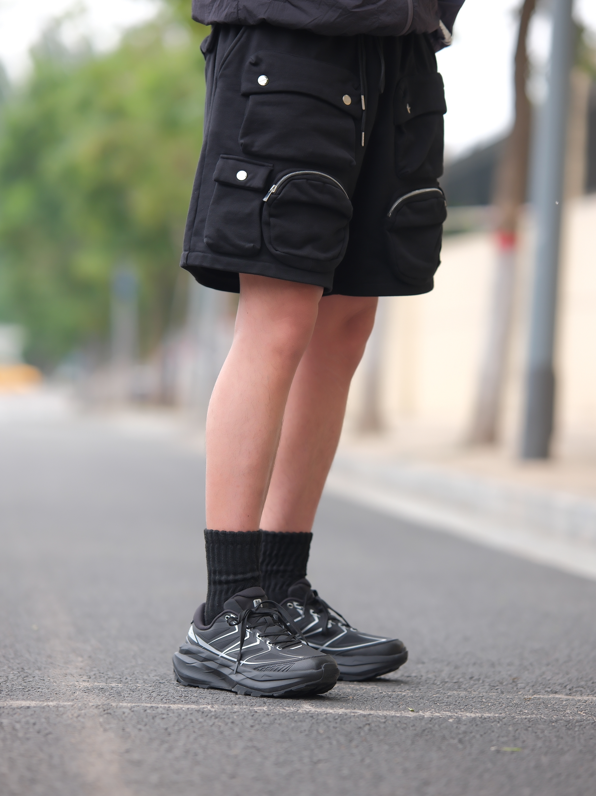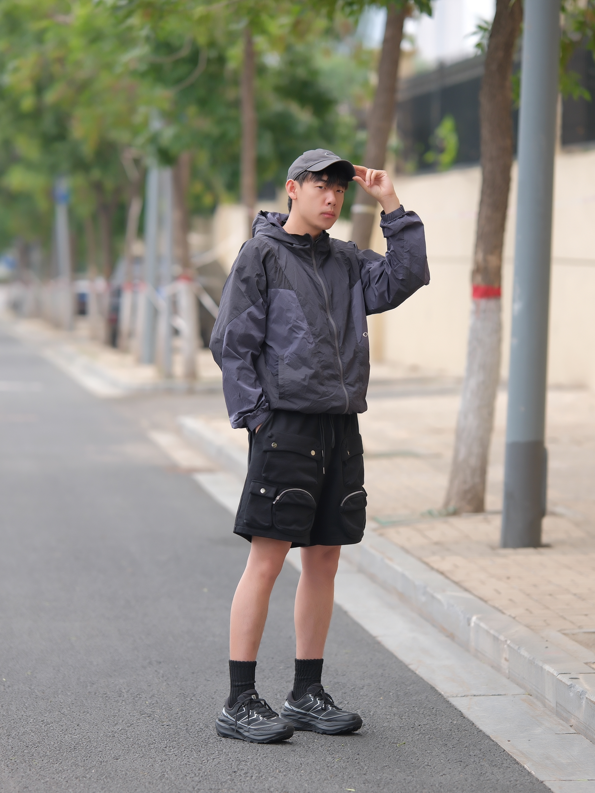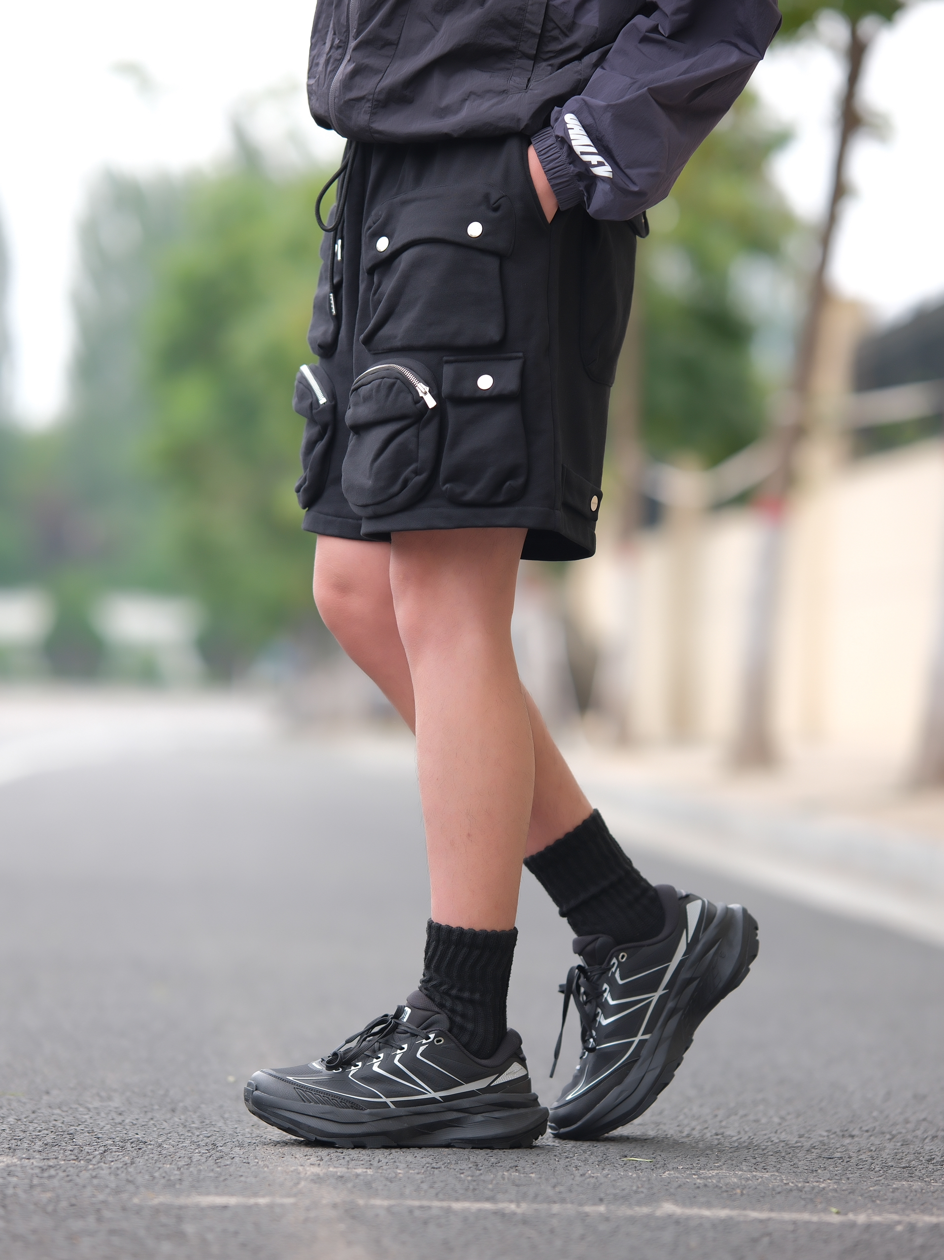 一套拿捏酷帅氛围 深色系urbancore分享 上半身一件黑紫防晒服搭配多口袋工装短裤 深色系真的帅爆了 上脚黑色针织袜 鞋子则是鸿星尔克阡陌系列休闲鞋 黑银搭配蛮炫酷的 而且鞋型也是比较流行的设计立体感十足还有点轻户外风 轻量又好穿 和整体urbancore氛围很契合