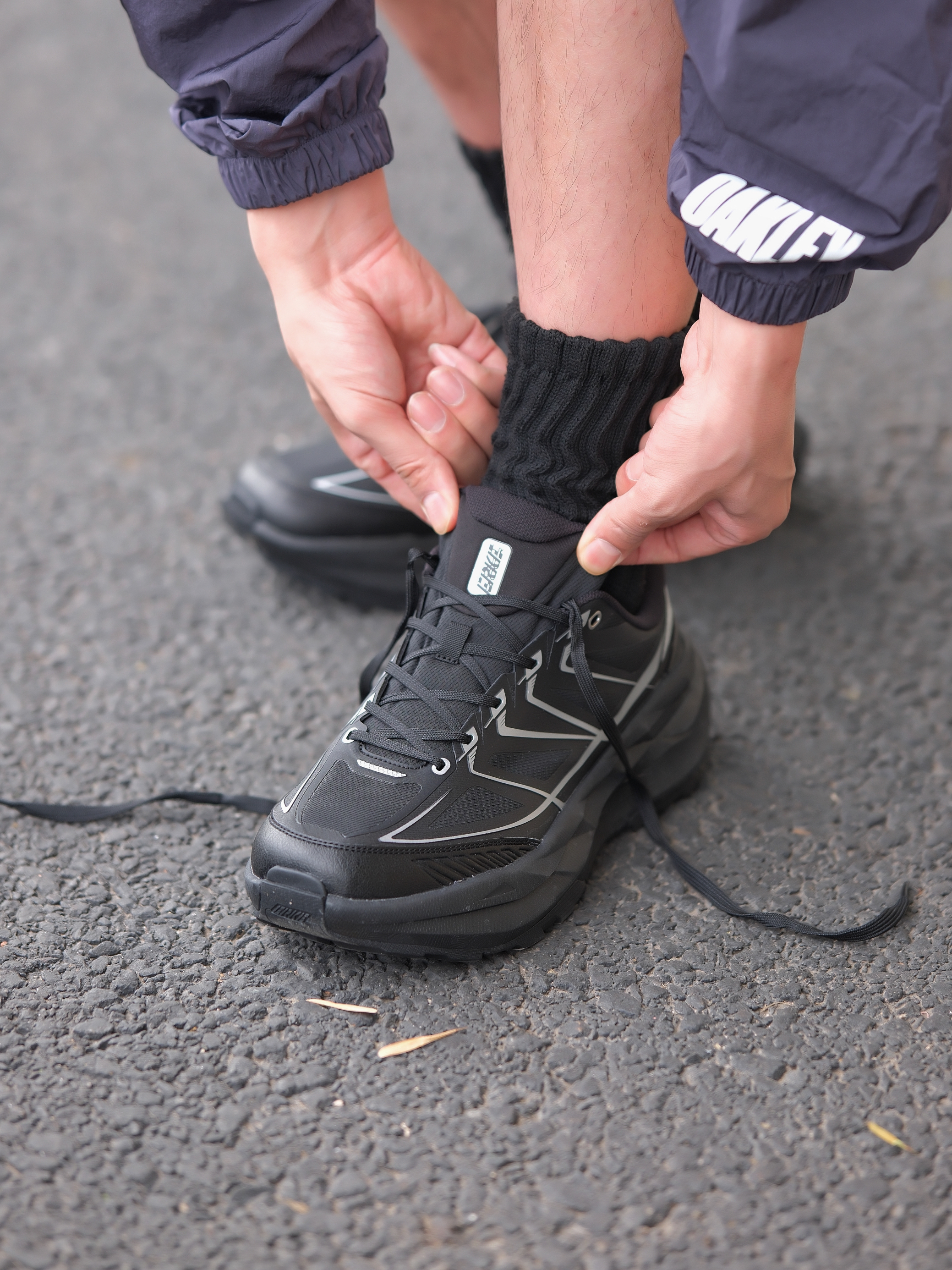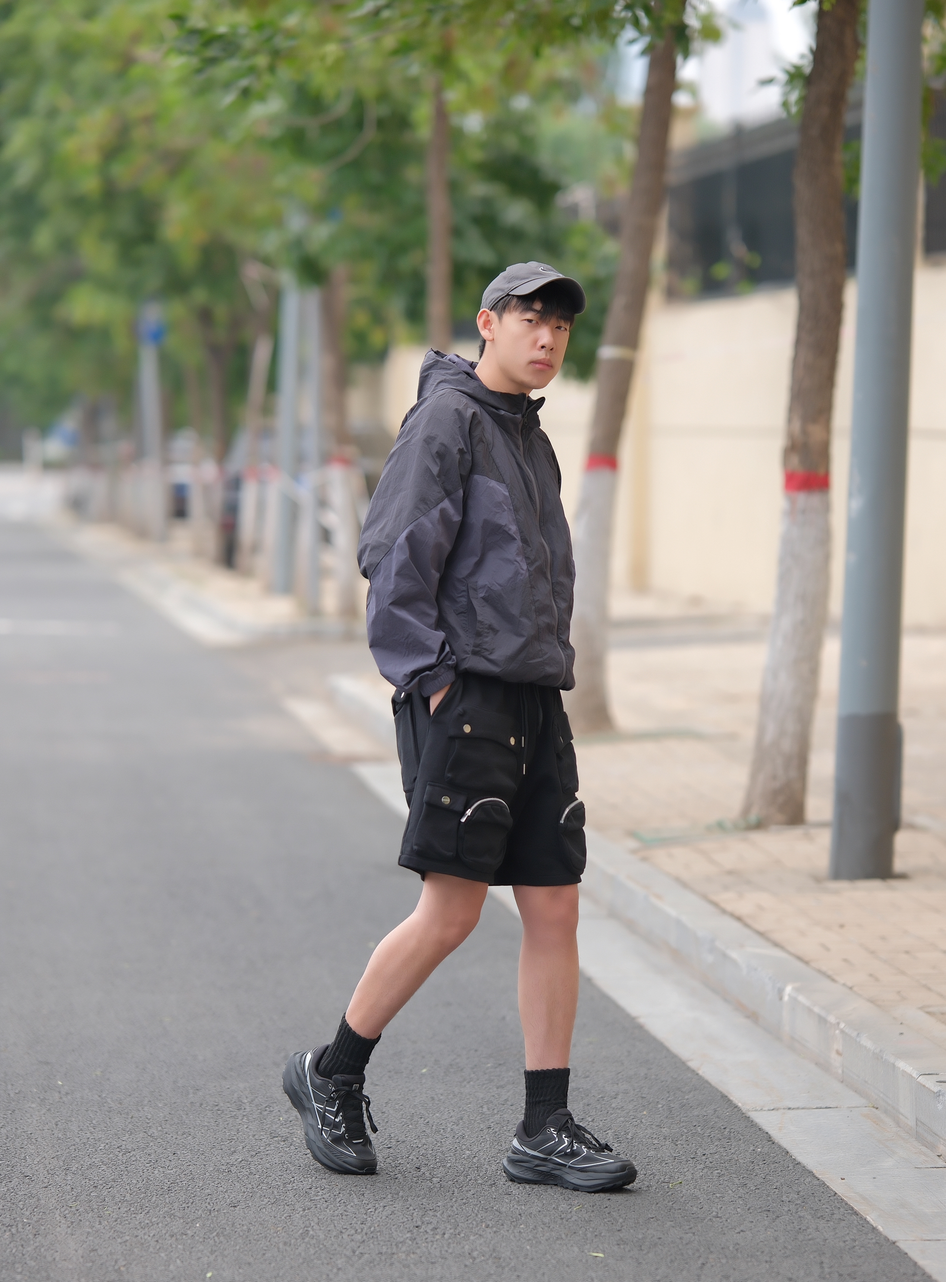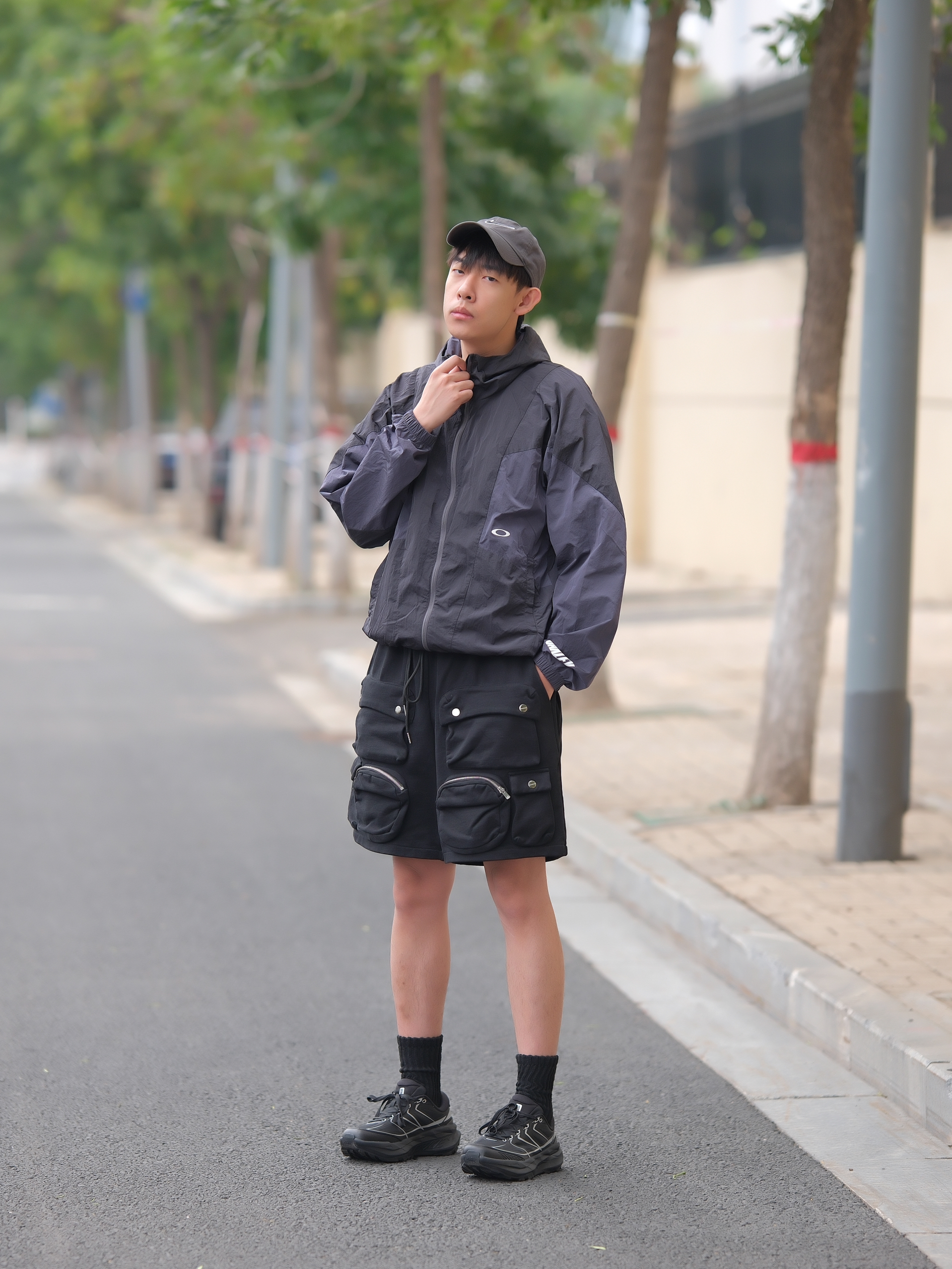 一套拿捏酷帅氛围 深色系urbancore分享 上半身一件黑紫防晒服搭配多口袋工装短裤 深色系真的帅爆了 上脚黑色针织袜 鞋子则是鸿星尔克阡陌系列休闲鞋 黑银搭配蛮炫酷的 而且鞋型也是比较流行的设计立体感十足还有点轻户外风 轻量又好穿 和整体urbancore氛围很契合