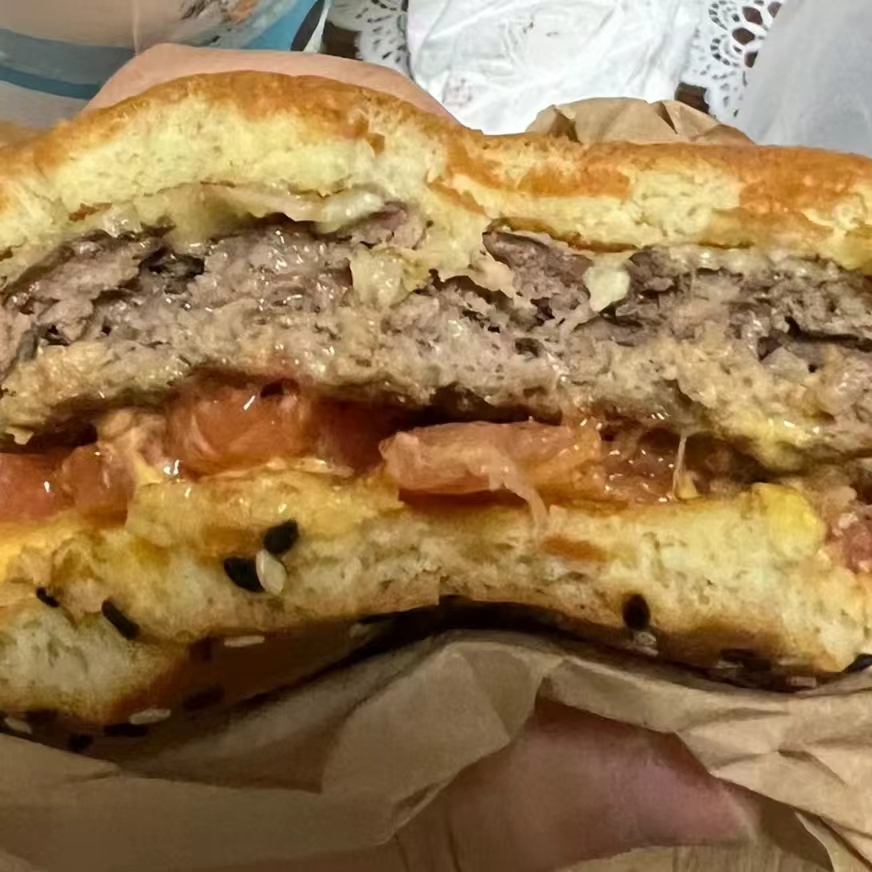 两片肉真的好棒呀,最喜欢吃肉了。麦当劳的这个培根双层安格斯厚牛堡真的很好吃,味道很棒。我家的小侄女小侄子也都挺喜欢吃的,就是容易干。