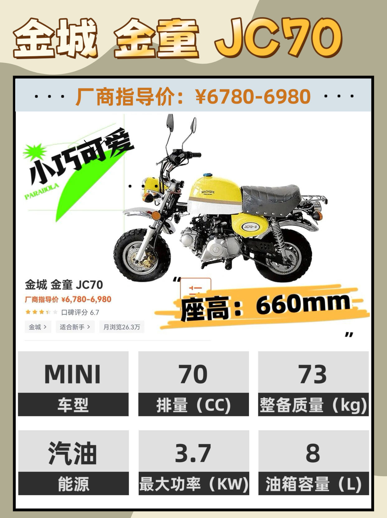 👋👋嗨,小伙伴们!最近发现很多小个子的朋友们在找适合自己的摩托,这不,我来给你们种草几款热门mini机车啦!🌱🌱 😍 mini摩托真的是小个子的福音啊!不仅座高和重量都超级友好,价格还很亲民呢!简直就是耍帅的神器,男生女生都爱得不得了!💕 👇👇👇 接下来给大家盘点几款热门mini摩托,快来看看有没有你的菜吧!👀 1️⃣🏍️金城 金童 JC70 座高:660mm 重量:73kg 优点:外观小巧可爱、...