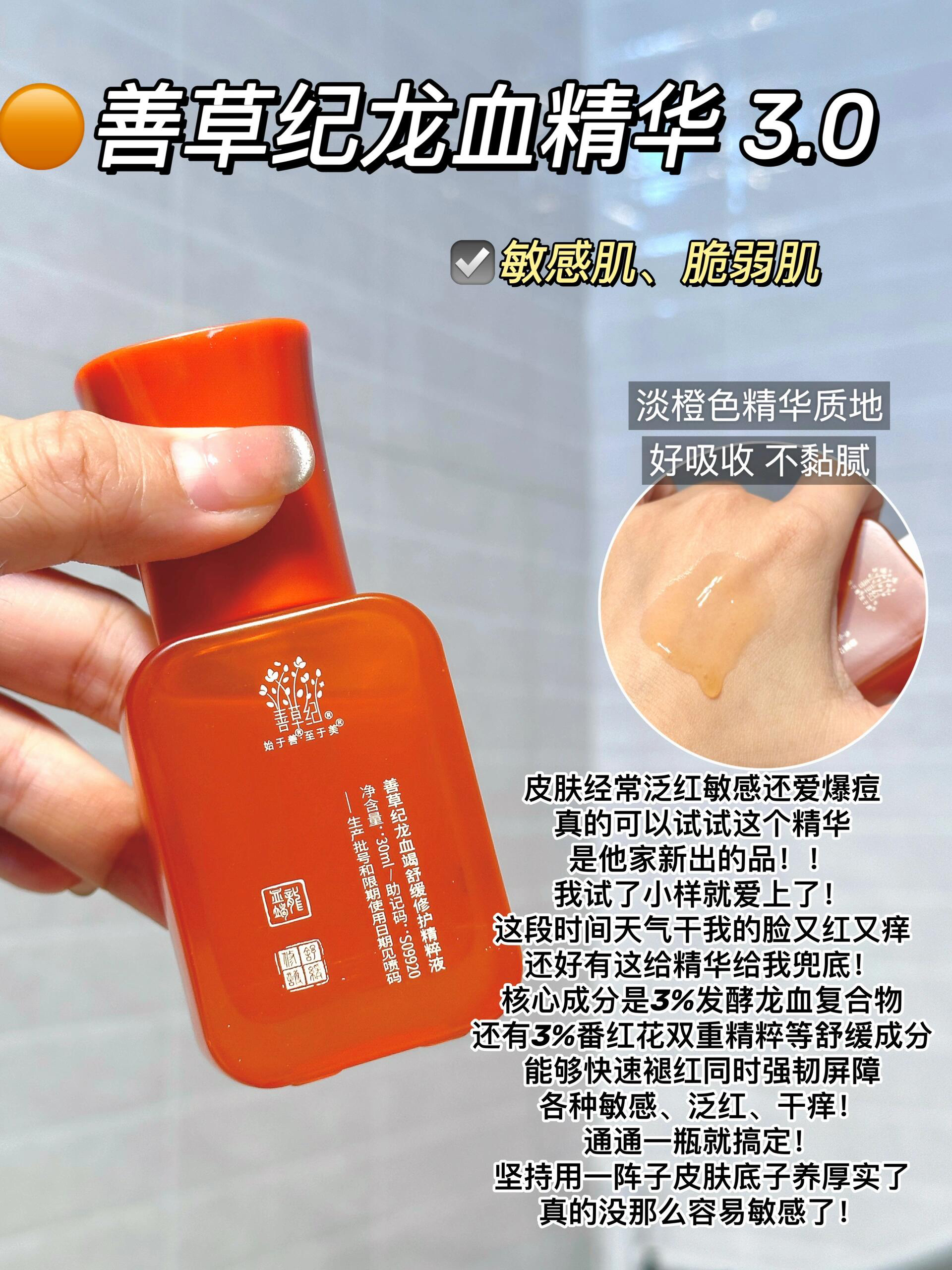 作为善草纪的多年老粉!必须大胆开麦! 用过这么多年没换的只有善草纪了! 很多款都是从老版用到现在的第三代升级版, 善草纪自己也慢慢让自己更优秀, 就连我的皮肤状态也跟着一起变好了! 总结了它们家6款热门护肤品, 适合不同肤质人群!大家按需选择! - 🟠善草纪龙血精华3.0 🔘即时褪红☑️敏感肌、脆弱肌 皮肤容易泛红、干痒、敏感? 别愁!有这瓶精华油兜底就没问题! 早晚用它搭配洋甘菊水乳来用, 褪红...